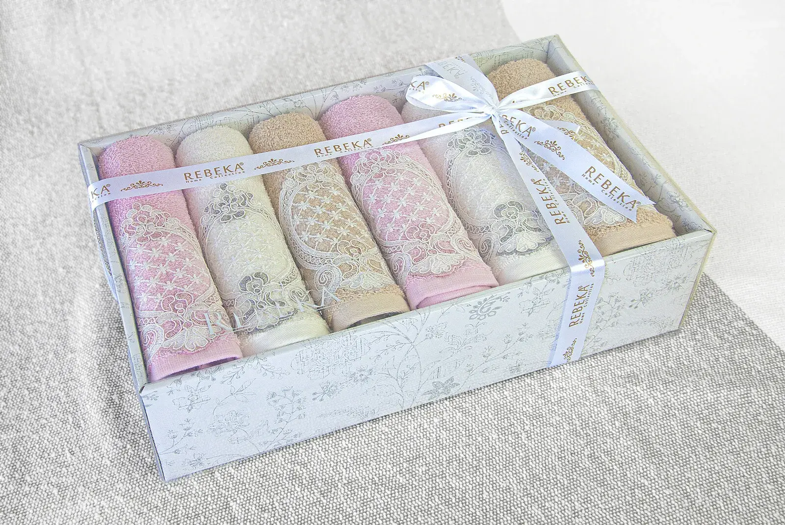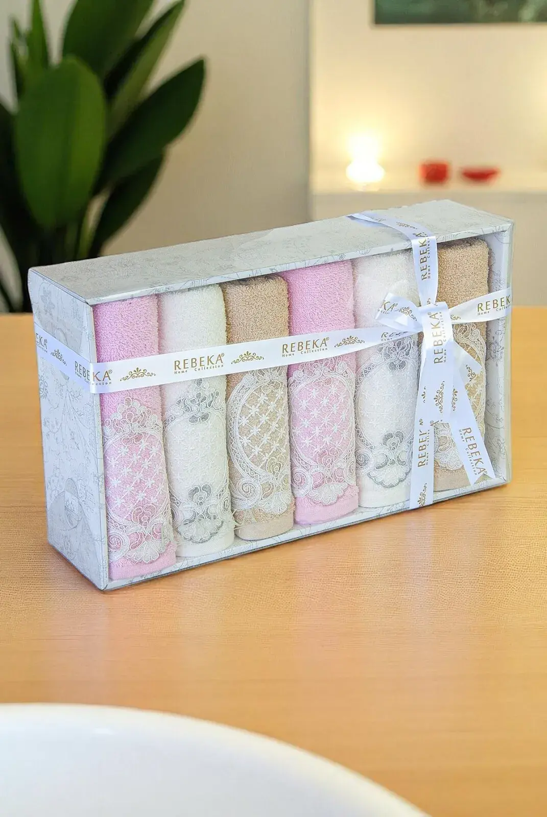 Şık ve özenle tasarlanmış bu havlu seti pamuklu yapısıyla yumuşak ve dayanıklı bir kullanım sunar. Set içinde yer alan 6 adet havlu, şık ve zarif güpürleri ile dikkat çeker ve özellikle düğün, çeyiz, nişan, mevlüt, ve sünnet konvoyları için ideal bir hediyelik seçeneği oluşturur. Standartlara uygun olarak üretilmiş olup, cildiniz için hijyenik bir kullanım sağlar.