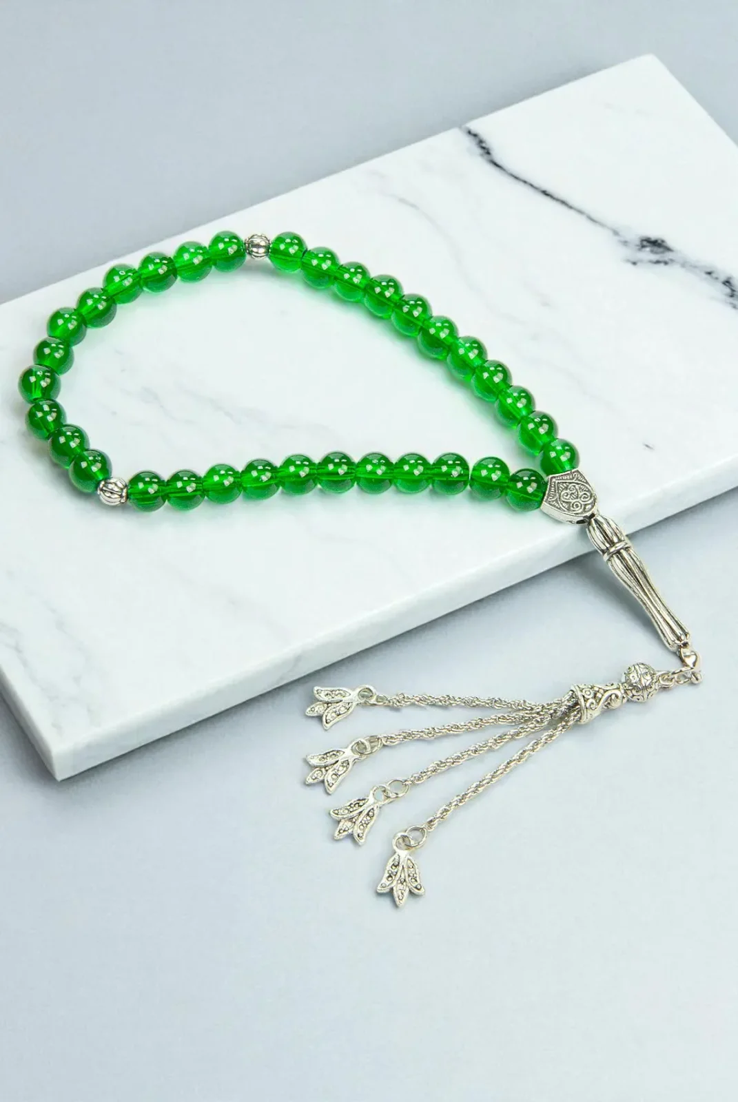 Dayanıklı misina yapısı sayesinde uzun süre deforme olmadan kullanılabilir. Her bir tespih, gümüş renk imameli ve zarif lale püskül detaylarıyla özenle hazırlanmıştır.
