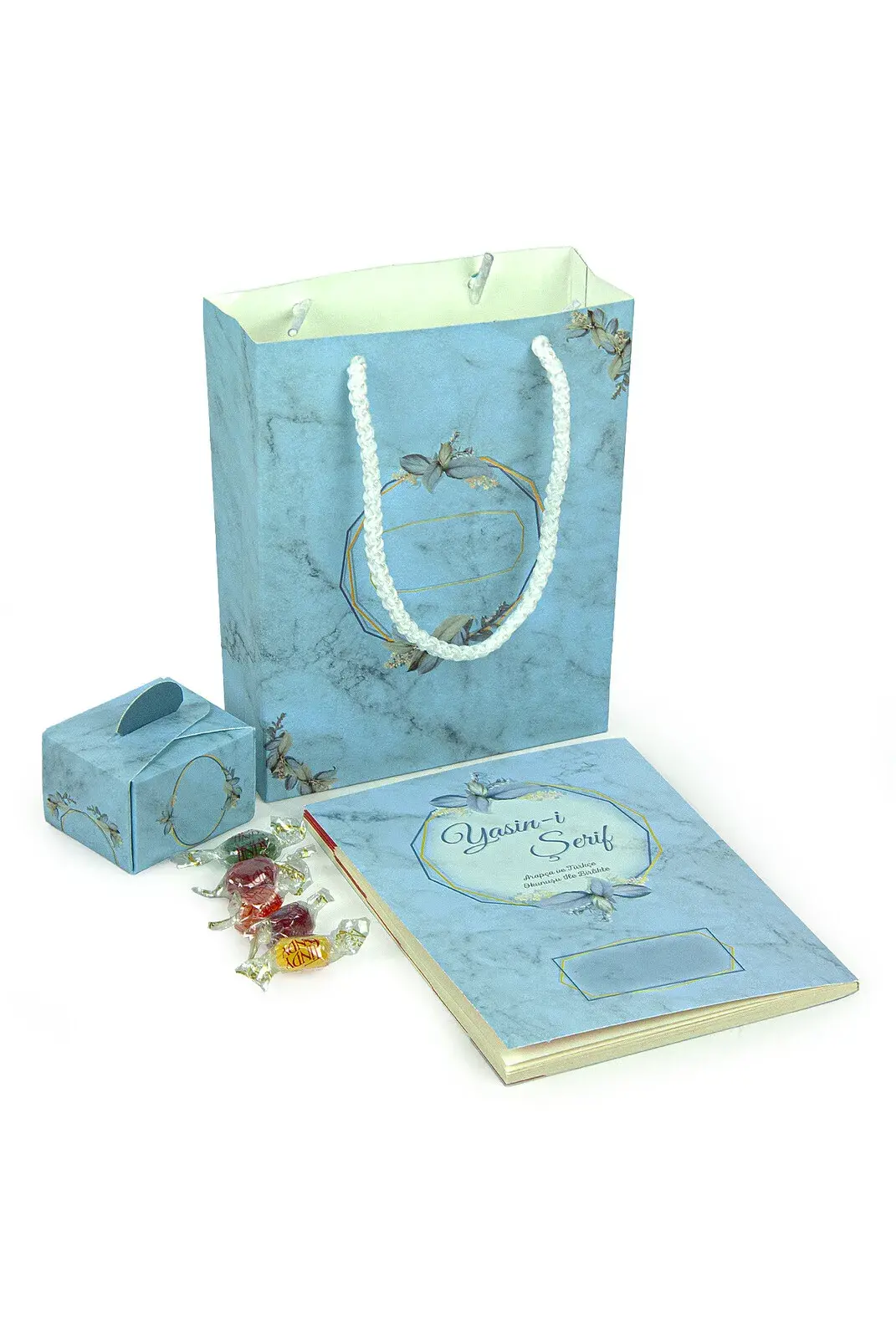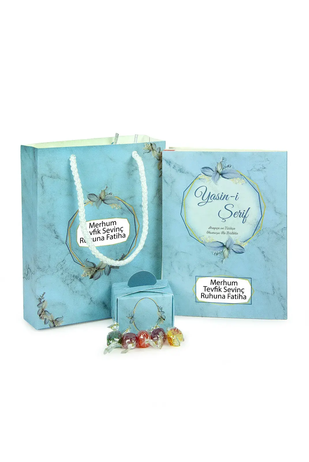 10 Adet Hediyelik 3'lü Mevlüt Seti İsme Özel Etiketli Çantalı, 64 Sayfa Yasin Kitabı - Mavi