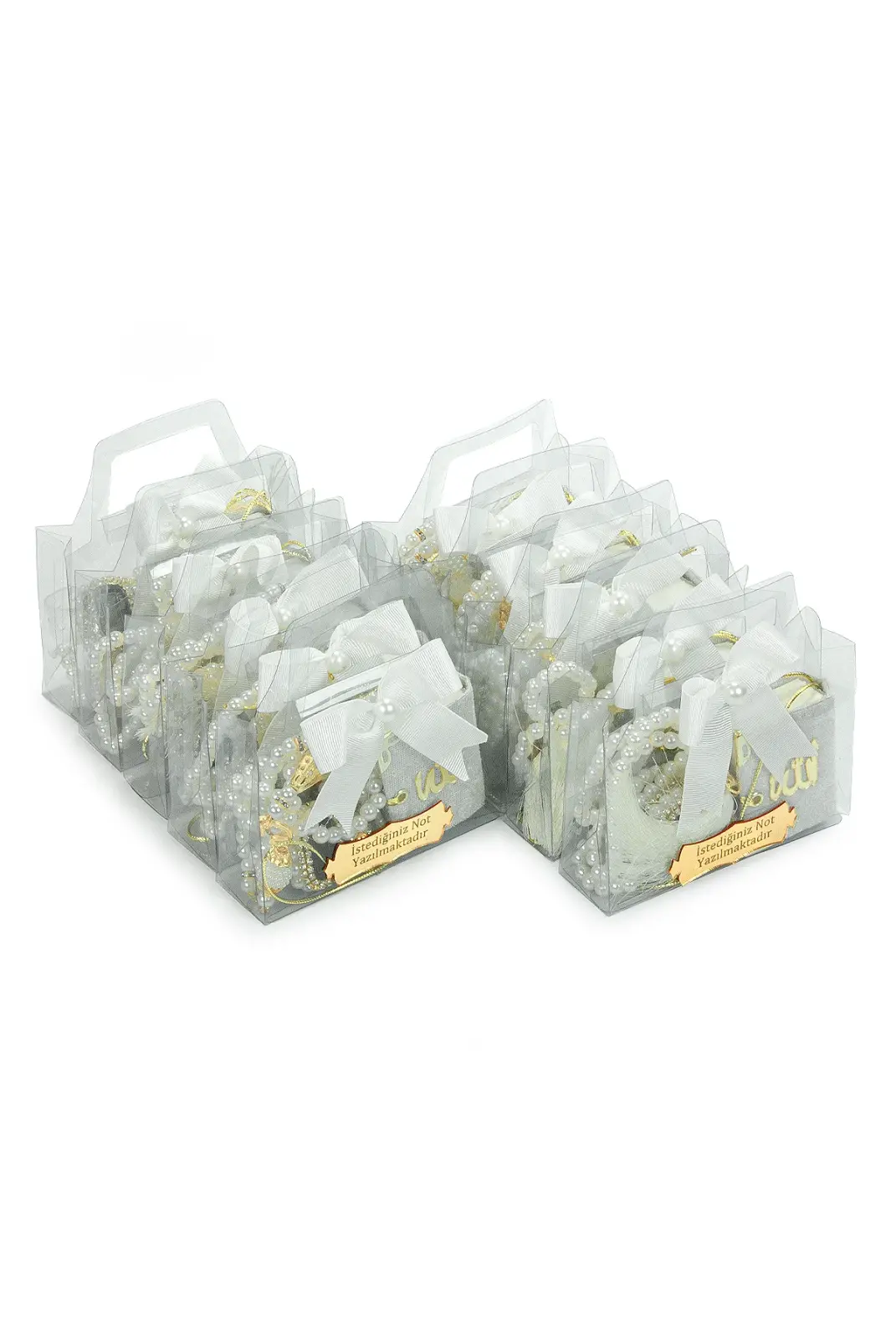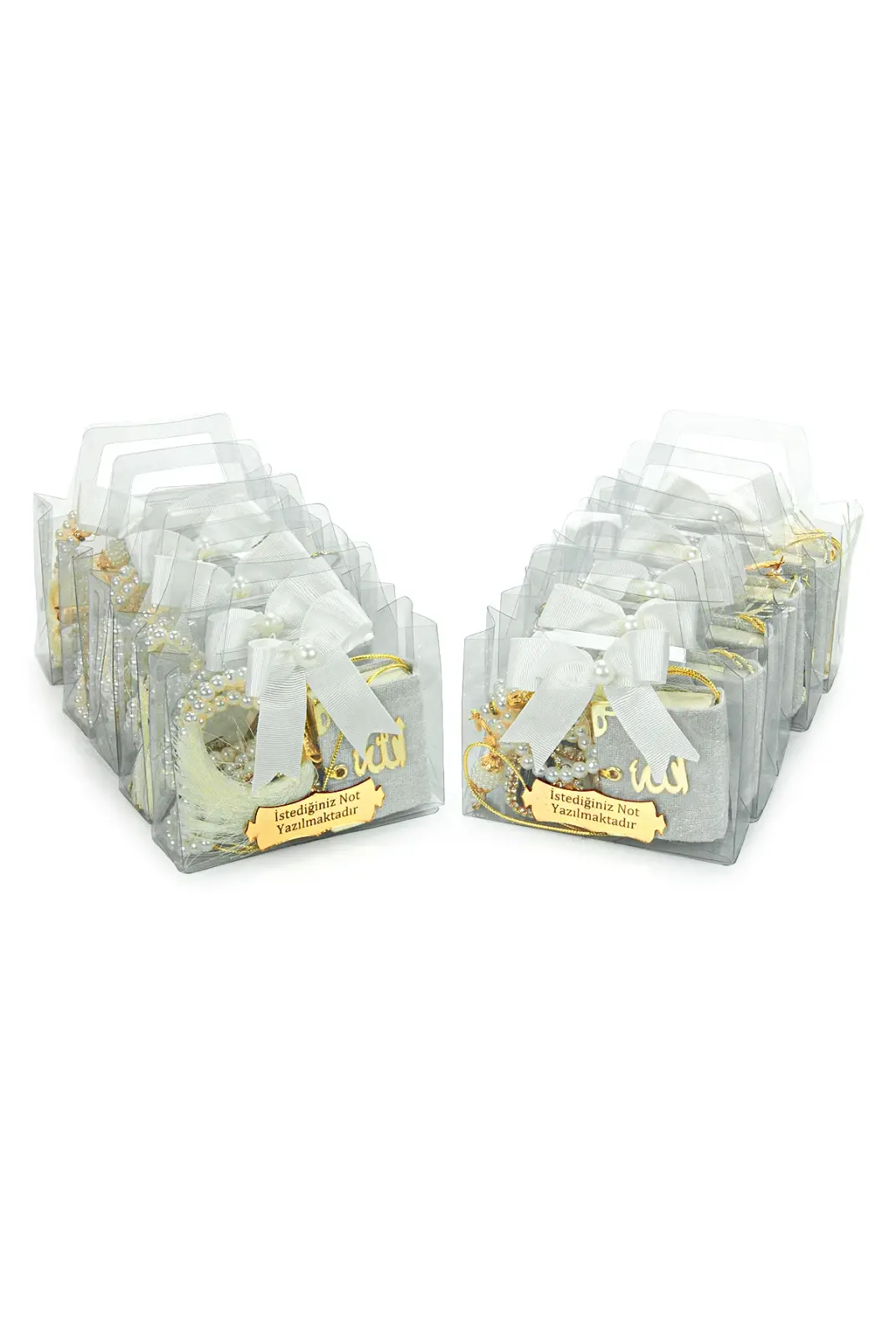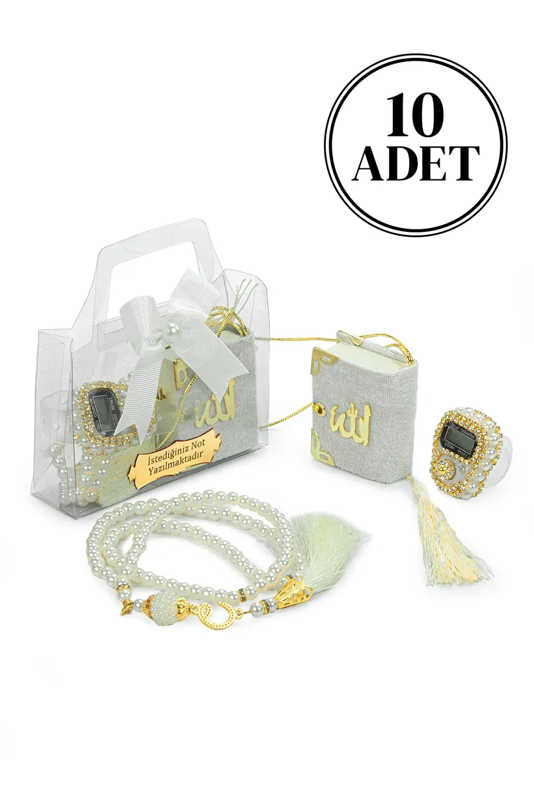 Özel günlerde misafirlerinize anlamlı ve şık bir hediye sunmak için hazırlanan 10 Adet İsme Özel Çantalı Mevlüt Hediyelik Seti, zarif tasarımı ve hazır sunumuyla ideal bir seçenektir. Her bir sette Mini Kuran-ı Kerim, zikirmatik, tesbih ve süslemeli hediye çantası bulunur. Üzerindeki metal etikete dilediğiniz isim veya kısa bir not eklenebilir.