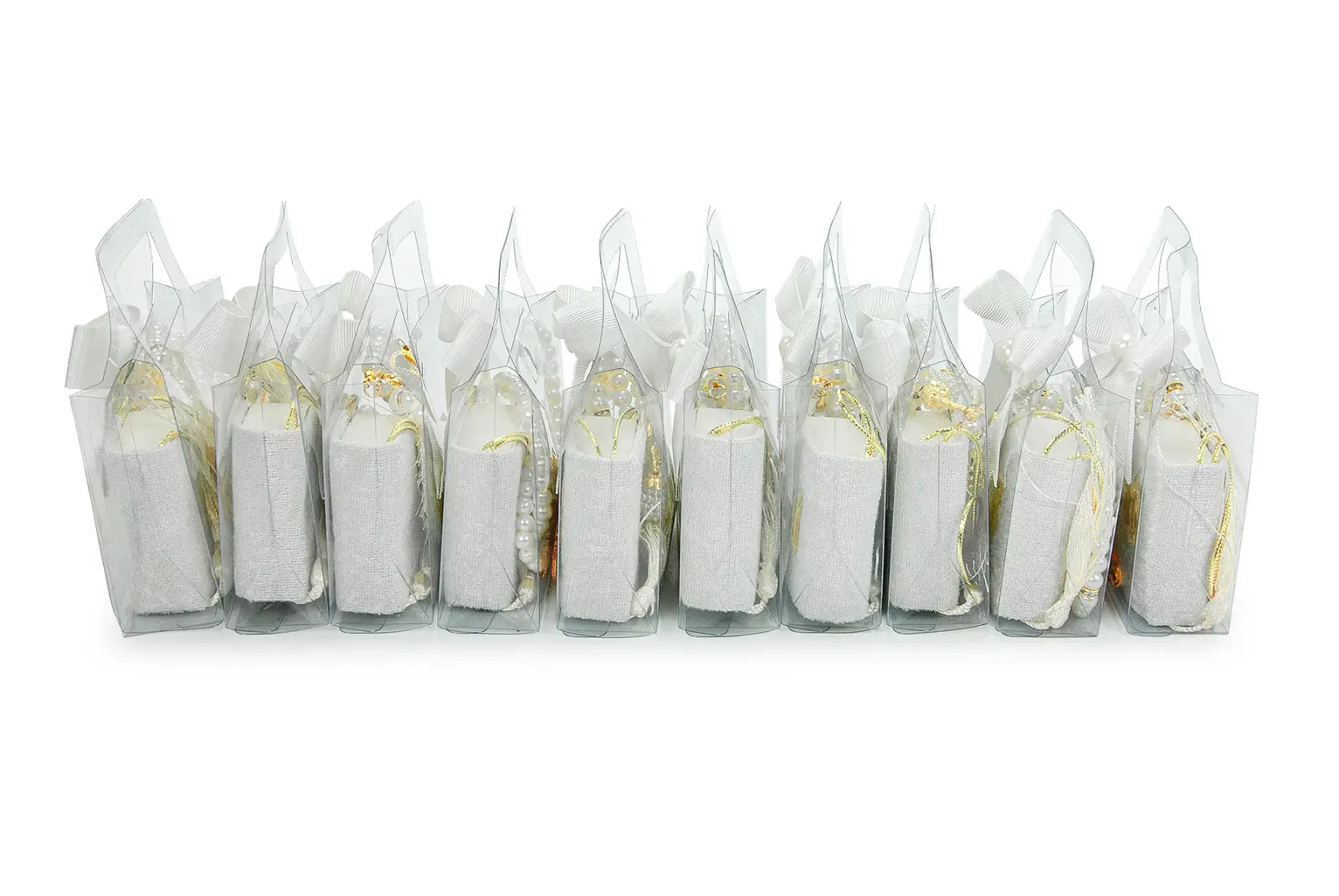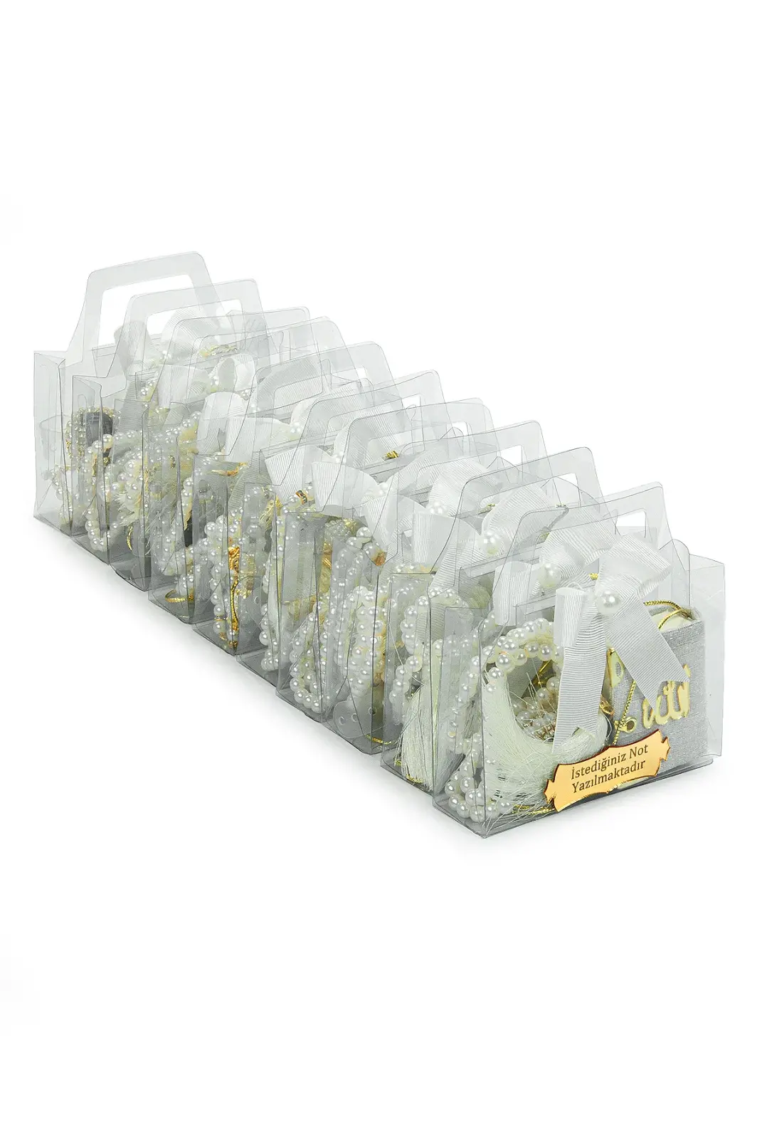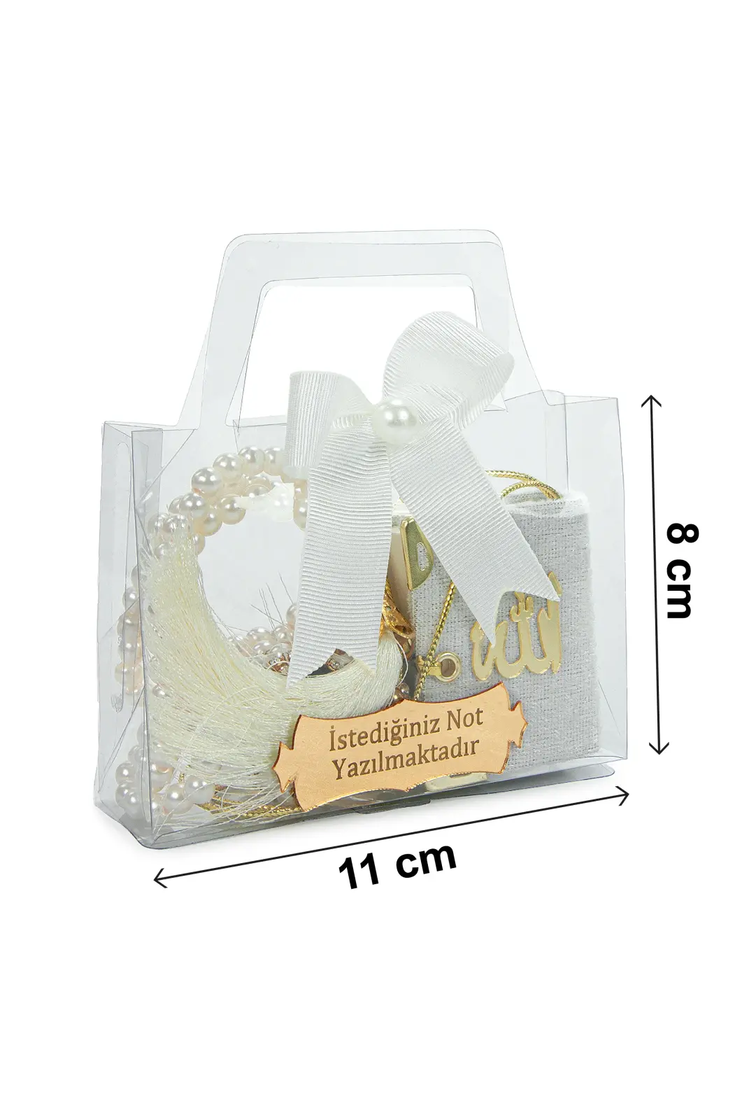 Özel günlerde misafirlerinize anlamlı ve şık bir hediye sunmak için hazırlanan 10 Adet İsme Özel Çantalı Mevlüt Hediyelik Seti, zarif tasarımı ve hazır sunumuyla ideal bir seçenektir. Her bir sette Mini Kuran-ı Kerim, zikirmatik, tesbih ve süslemeli hediye çantası bulunur. Üzerindeki metal etikete dilediğiniz isim veya kısa bir not eklenebilir.