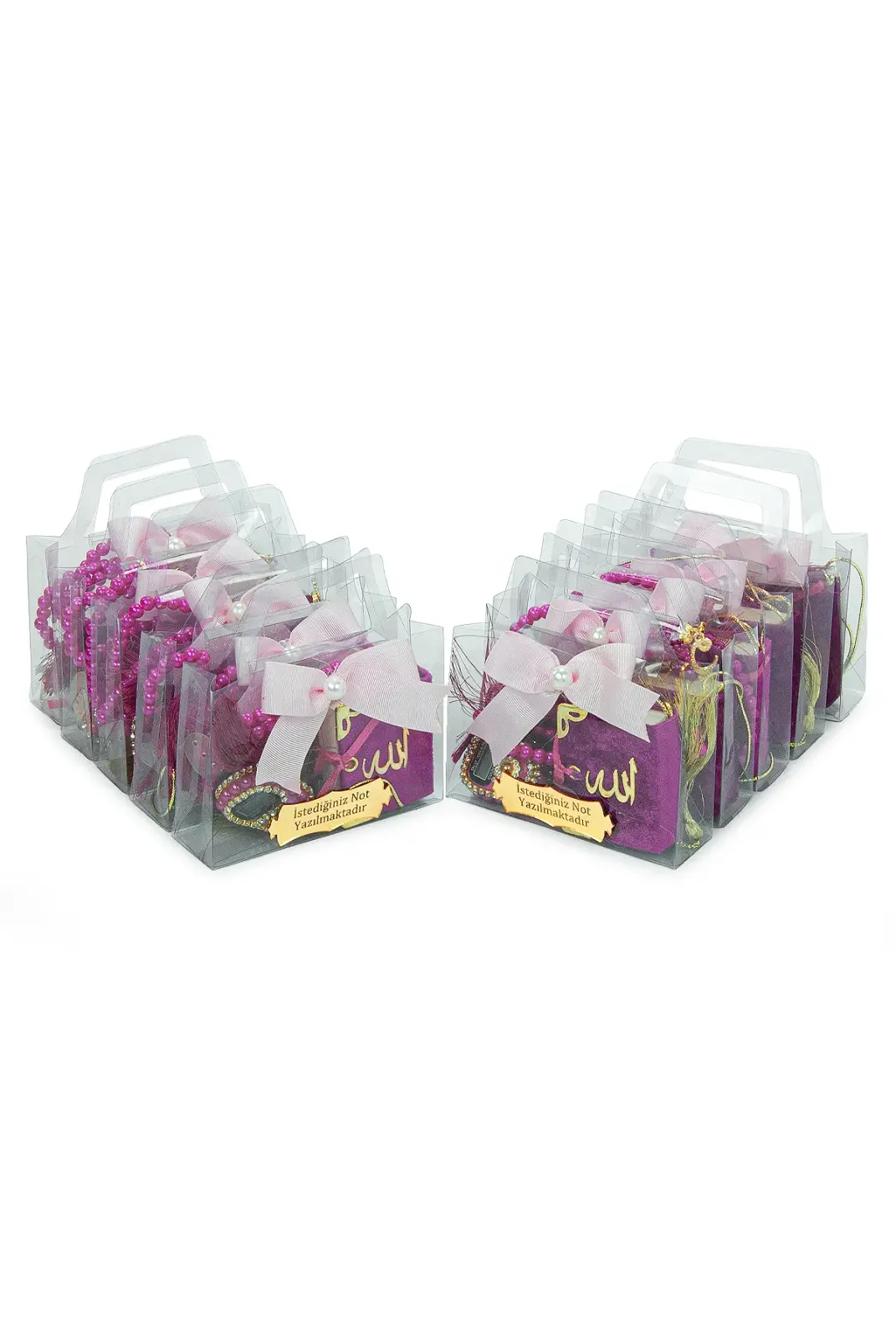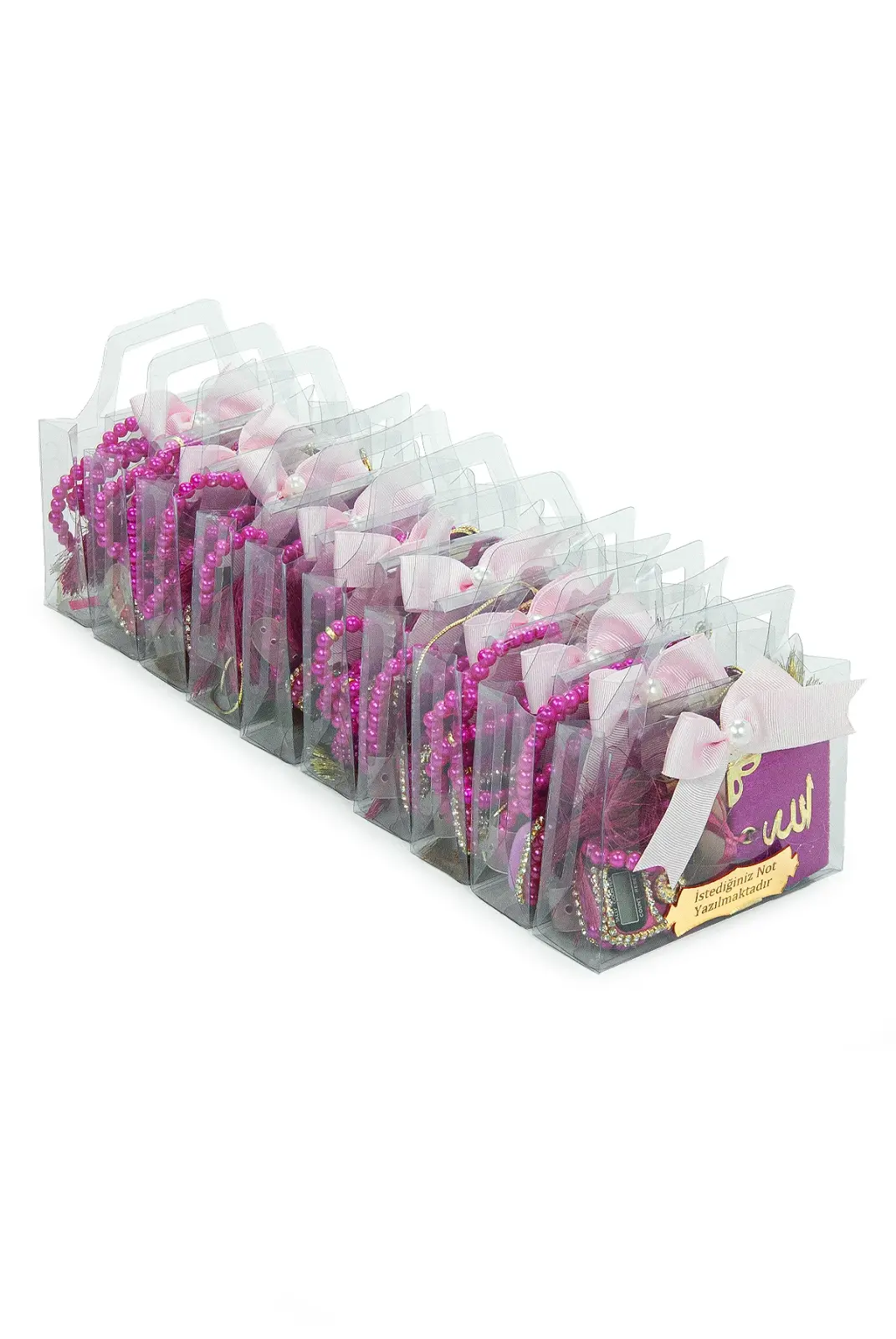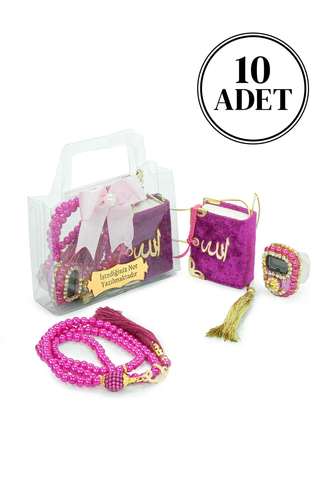 10 Adet İsme Özel Çantalı Mevlüt Hediyelik - Zikirmatik Tesbih Mini Kuranı Kerim Seti - Fuşya