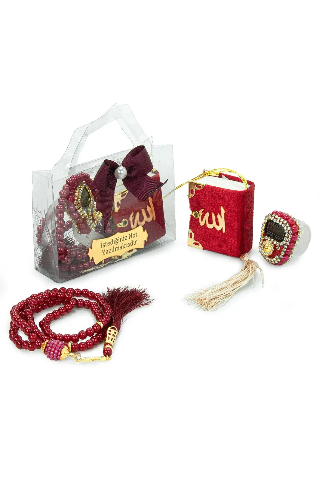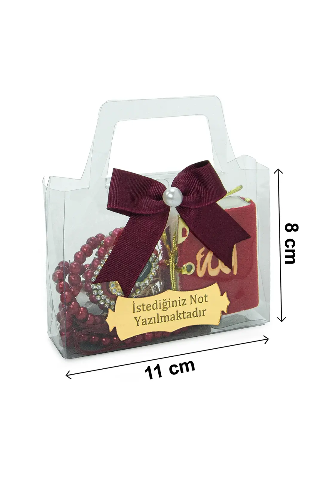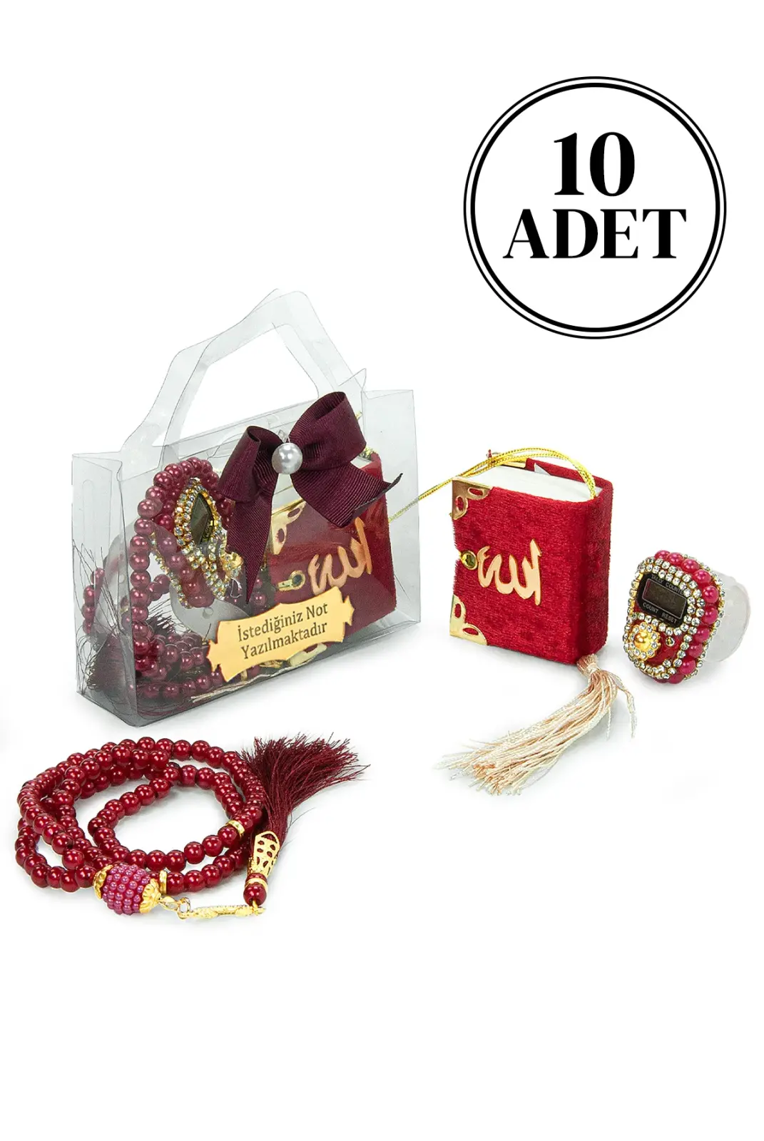 10 Adet İsme Özel Çantalı Mevlüt Hediyelik - Zikirmatik Tesbih Mini Kuranı Kerim Seti - Kırmızı
