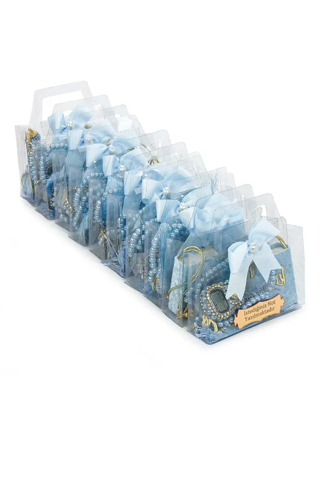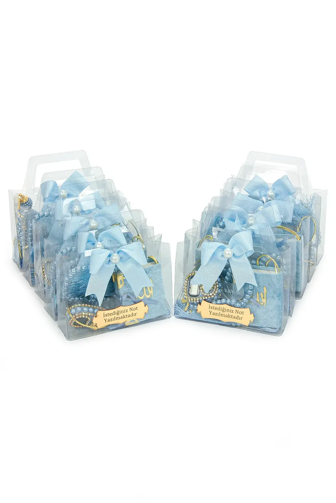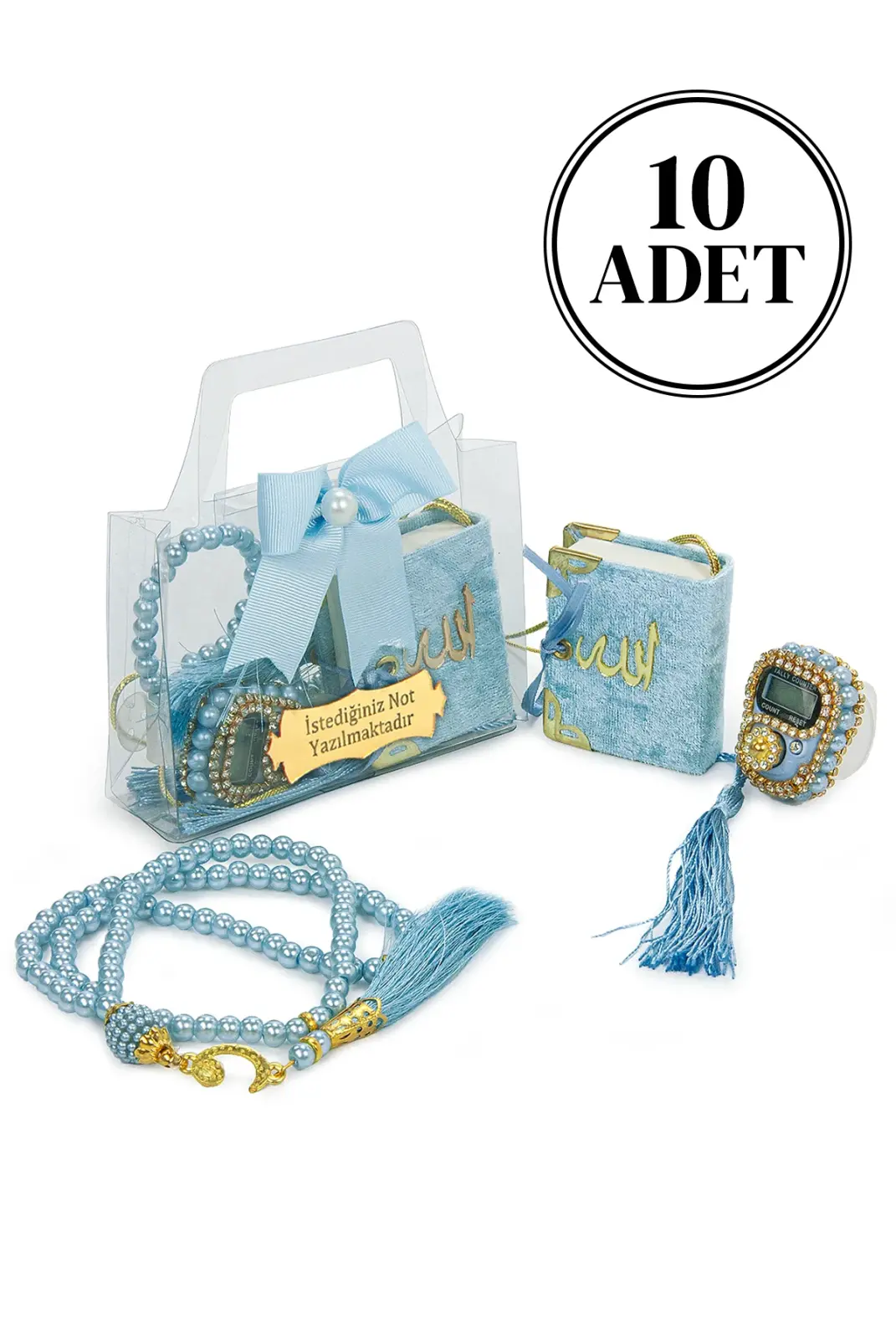 10 Adet İsme Özel Çantalı Mevlüt Hediyelik - Zikirmatik Tesbih Mini Kuranı Kerim Seti - Mavi