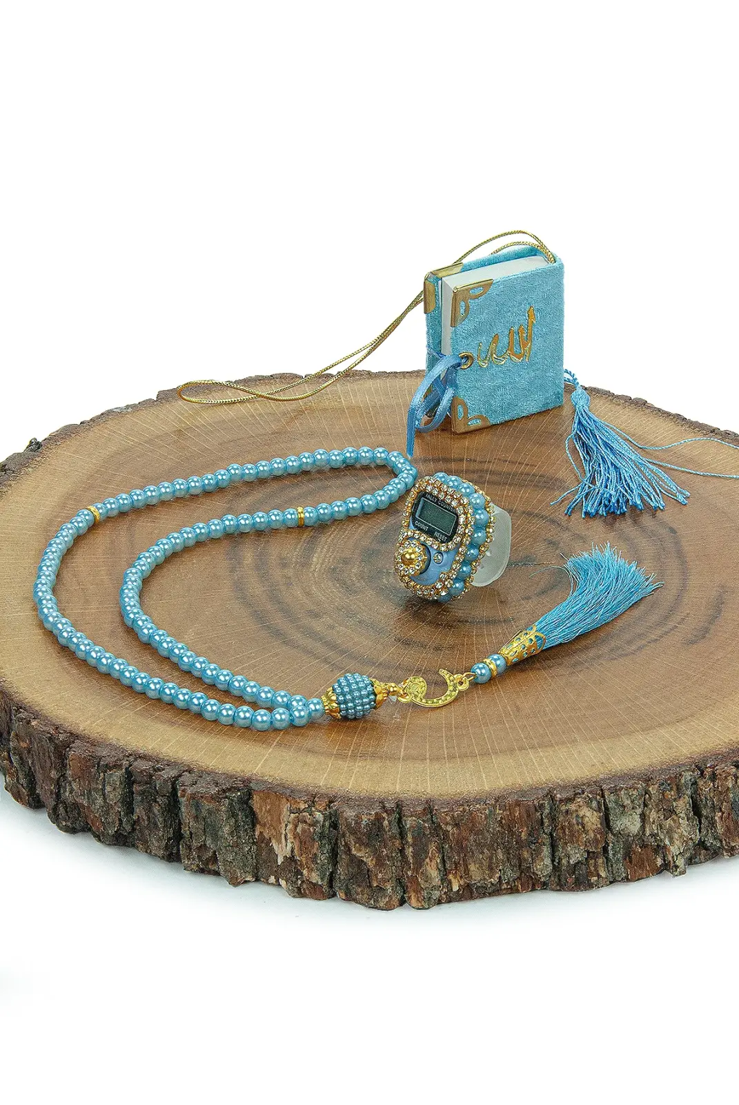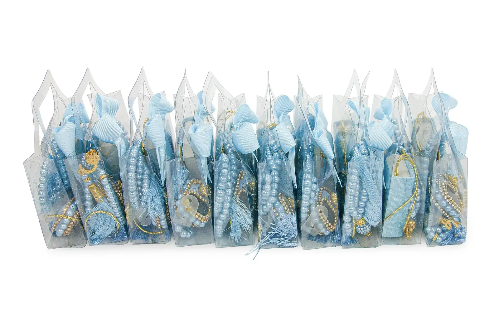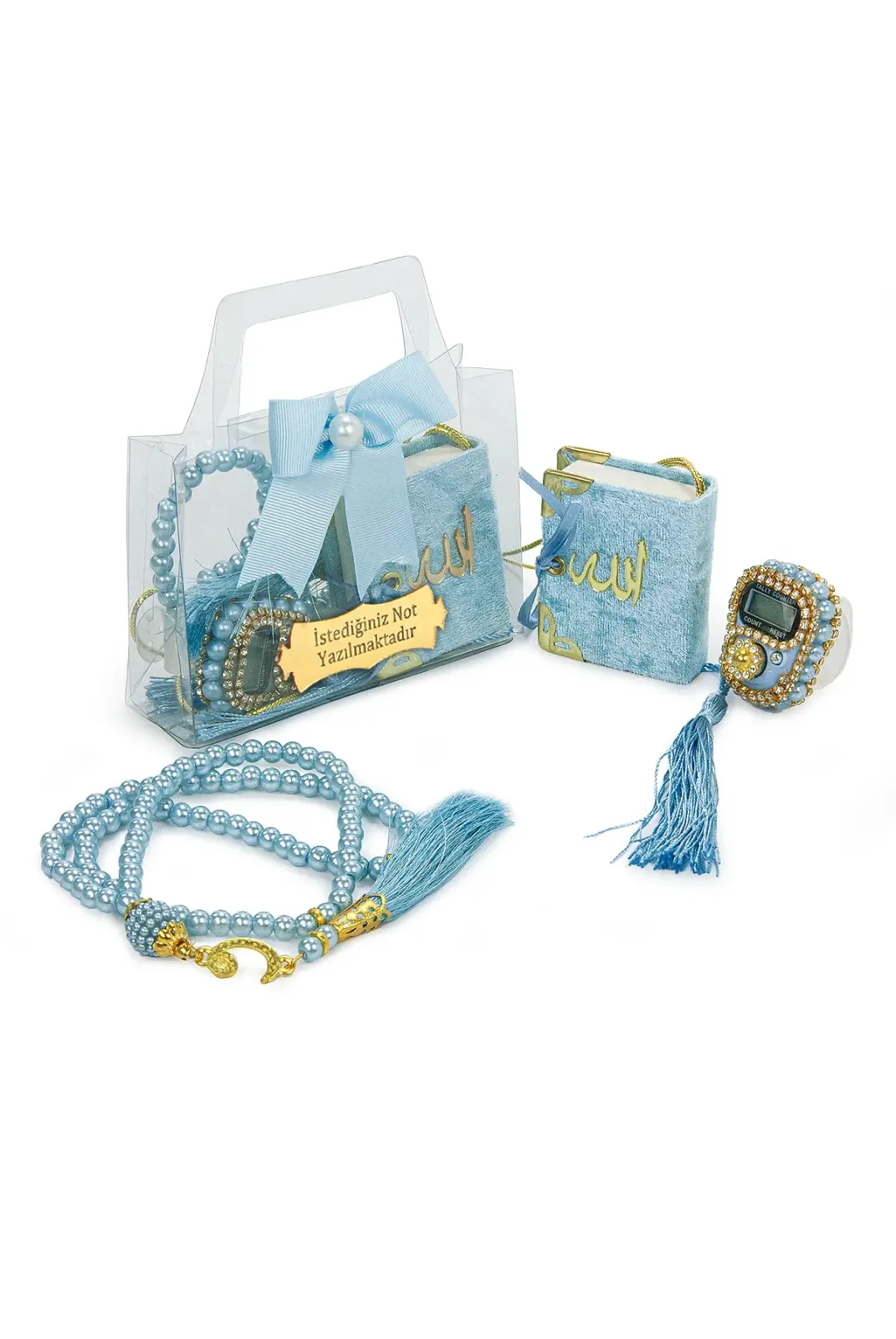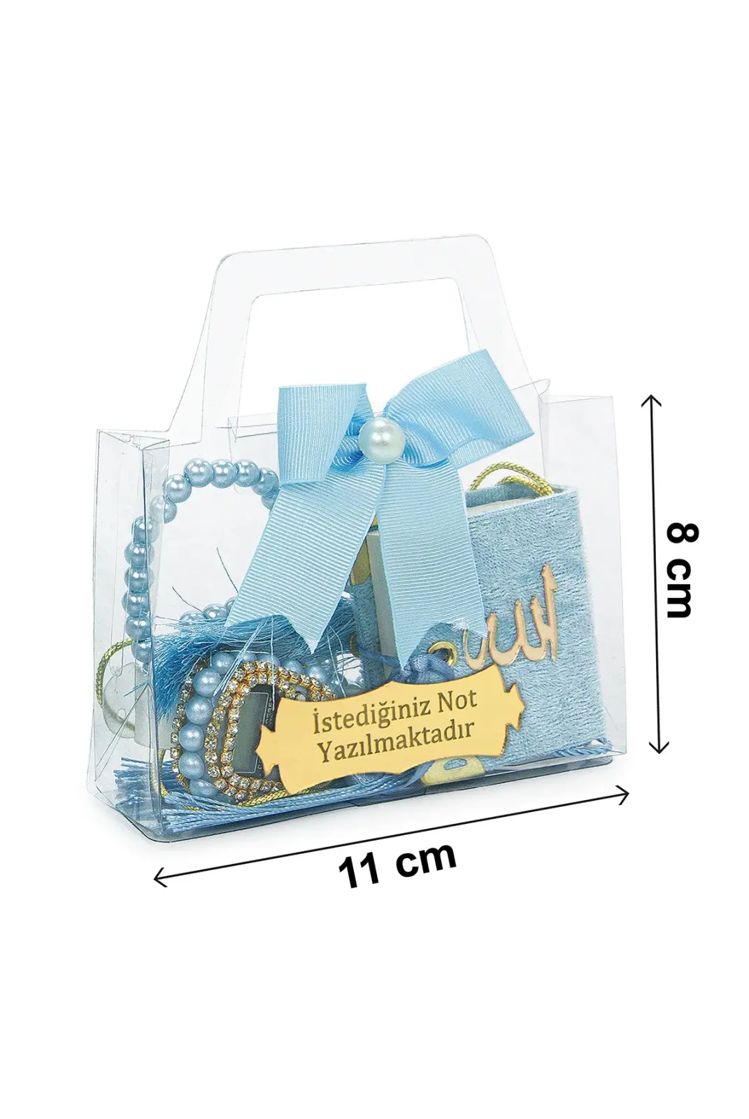 10 Adet İsme Özel Çantalı Mevlüt Hediyelik - Zikirmatik Tesbih Mini Kuranı Kerim Seti - Mavi