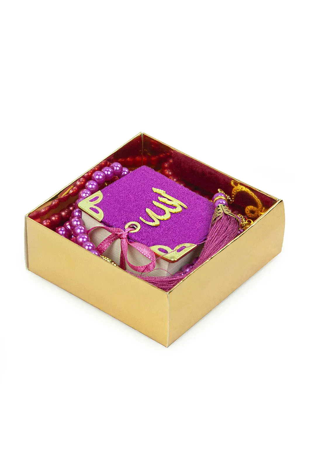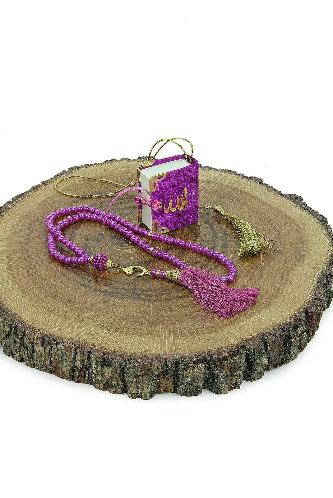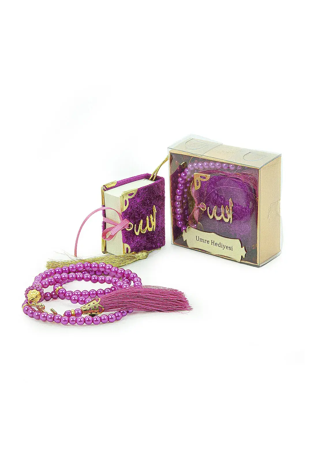 10 Adet İsme Özel Kutulu İnci Tesbihli Kadife Kaplı Mini Kuran Mevlüt Hediyesi Fuşya