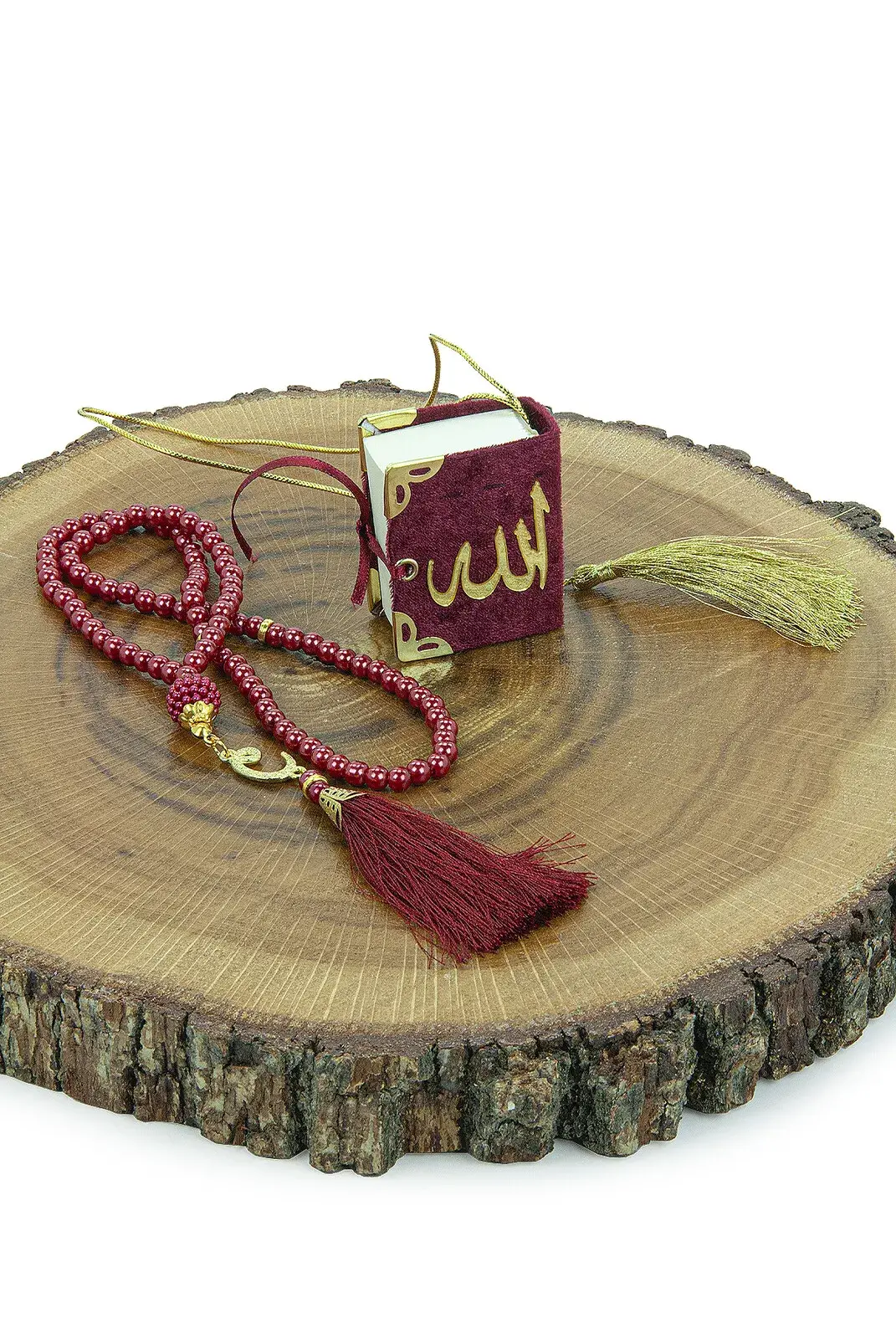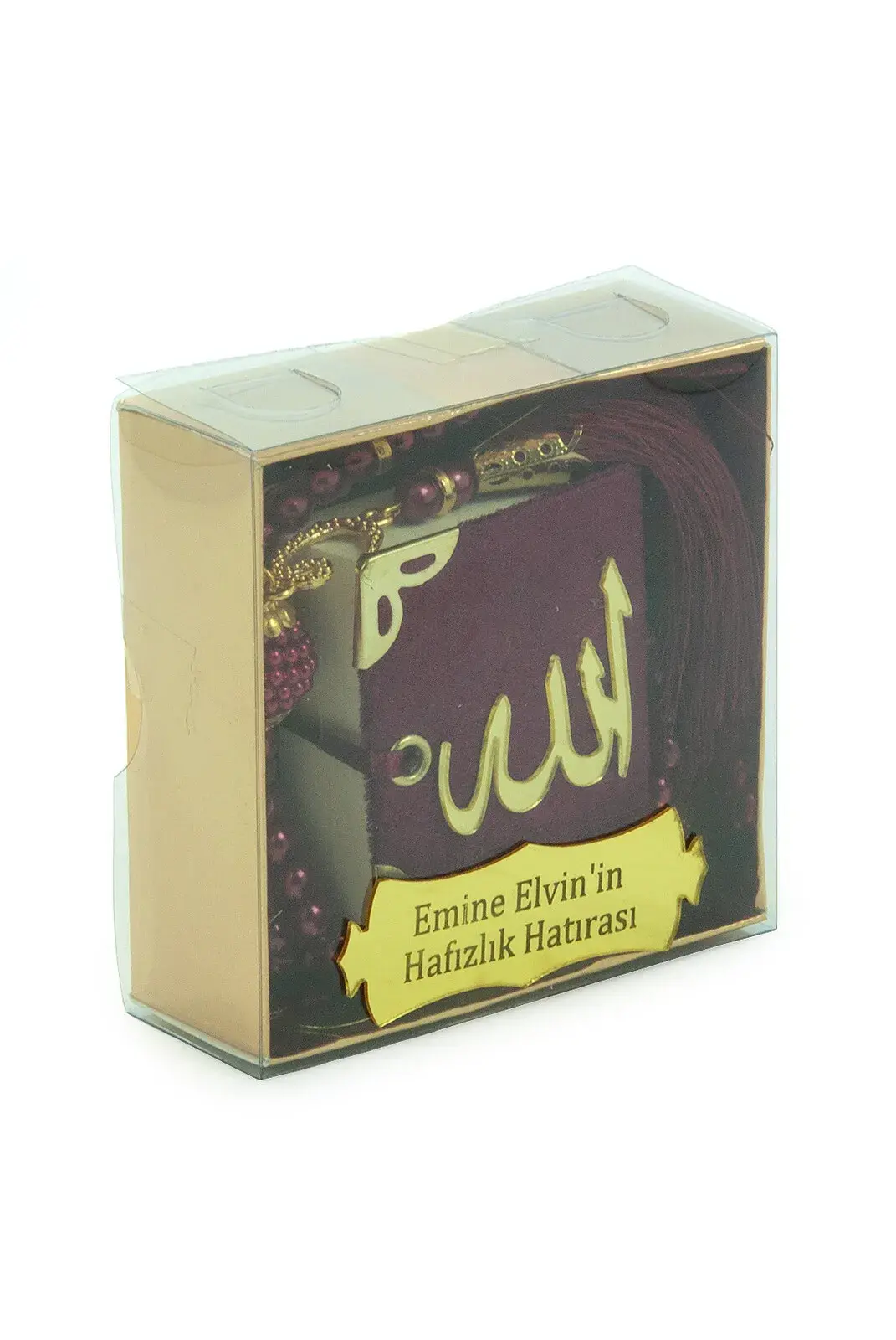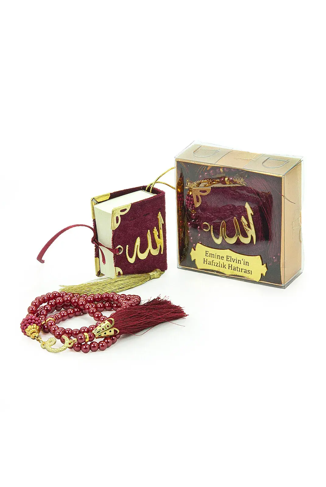 10 Adet İsme Özel Kutulu İnci Tesbihli Kadife Kaplı Mini Kuran Mevlüt Hediyesi Kırmızı