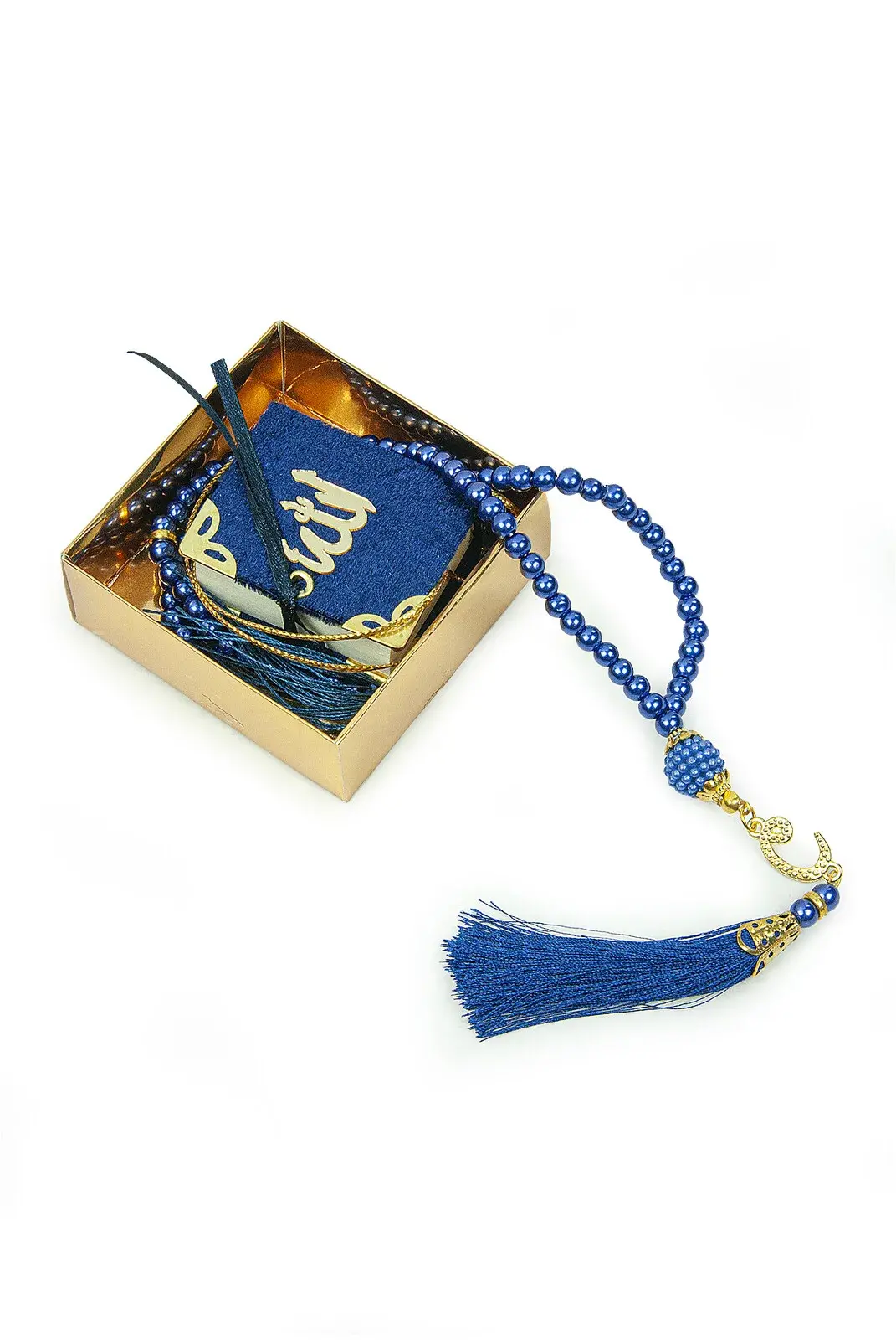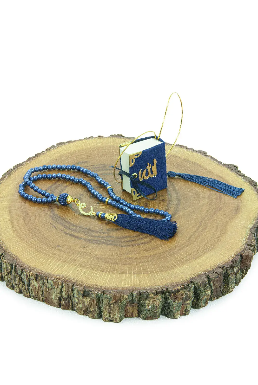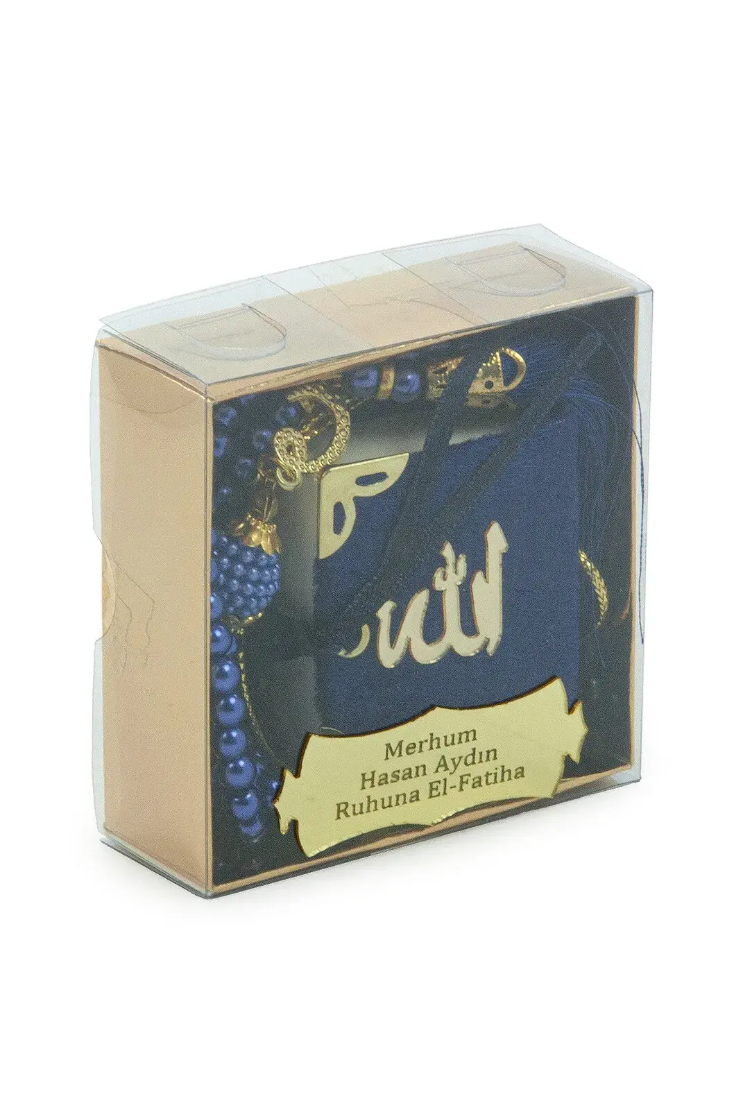 10 Adet İsme Özel Kutulu İnci Tesbihli Kadife Kaplı Mini Kuran Mevlüt Hediyesi Lacivert