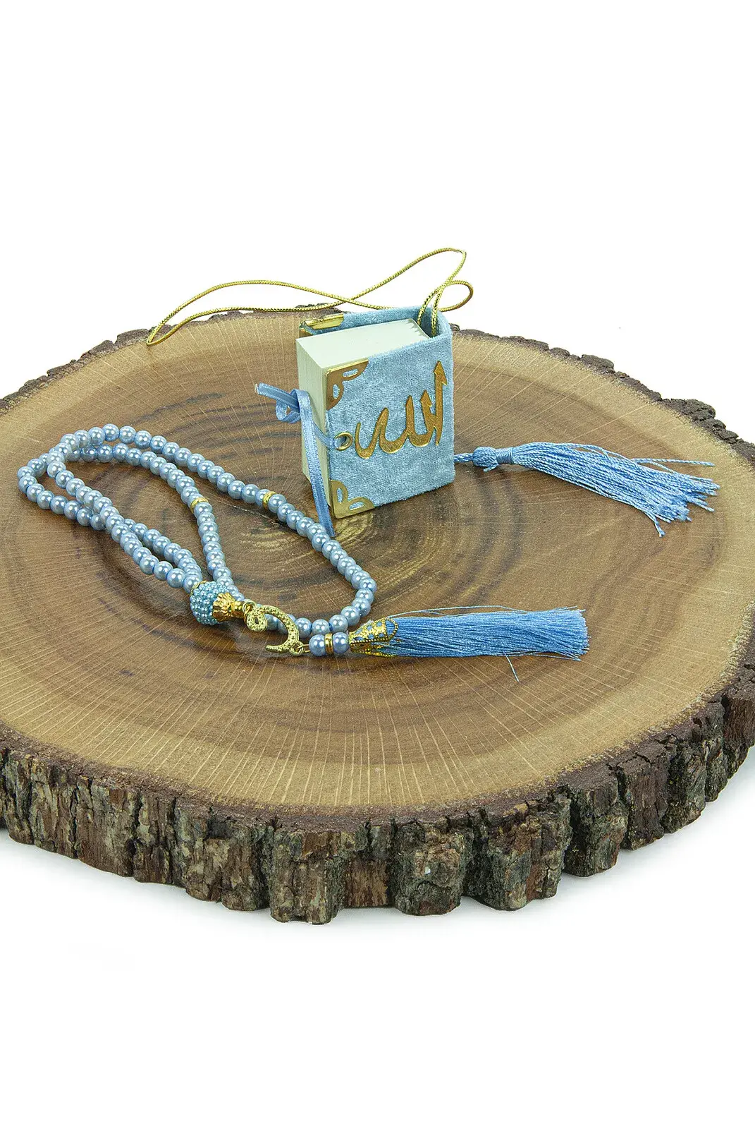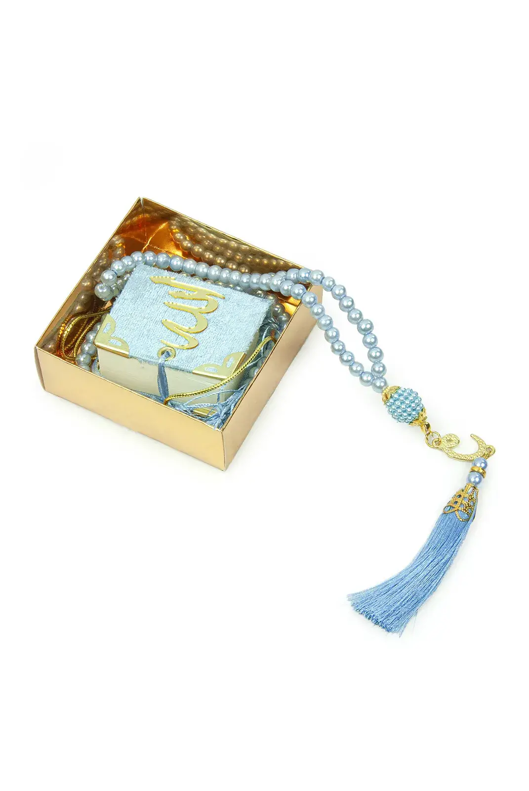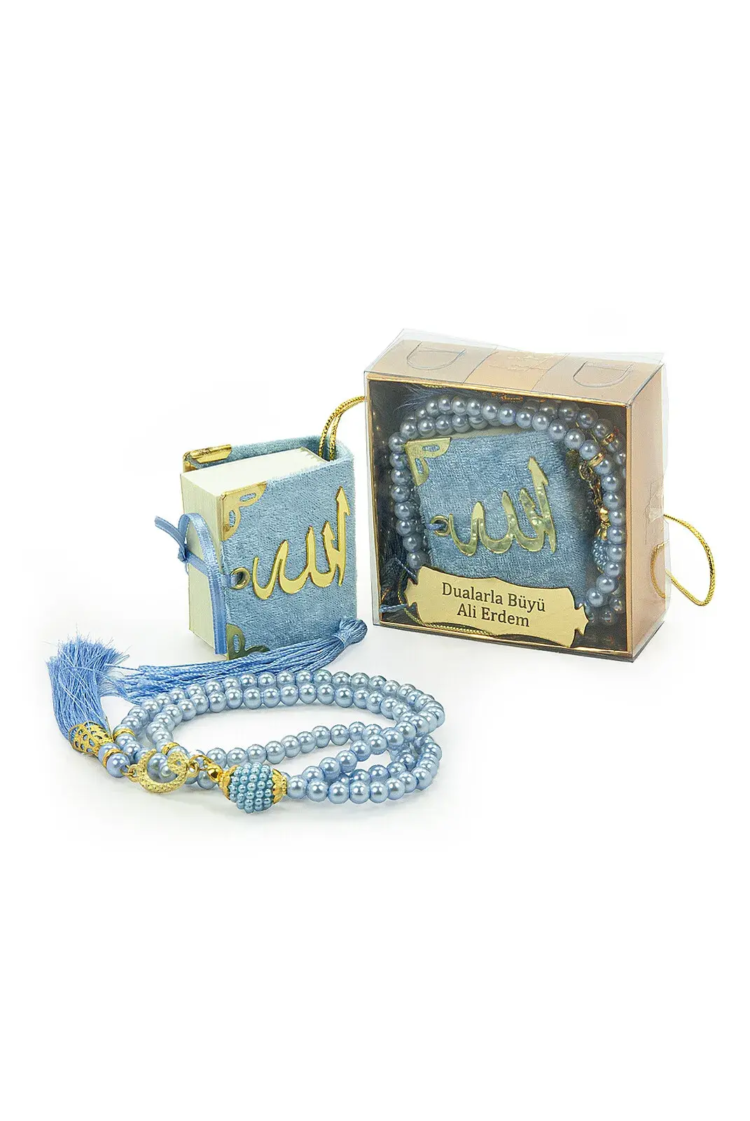 10 Adet İsme Özel Kutulu İnci Tesbihli Kadife Kaplı Mini Kuran Mevlüt Hediyesi Mavi