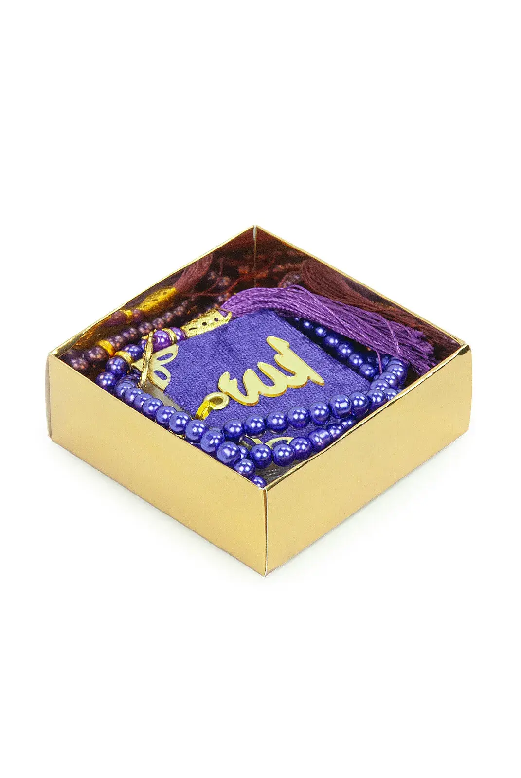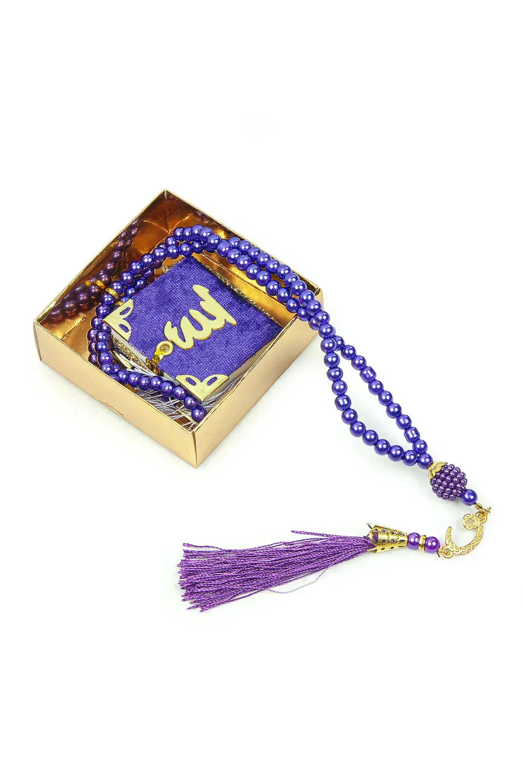 10 Adet İsme Özel Kutulu İnci Tesbihli Kadife Kaplı Mini Kuran Mevlüt Hediyesi Mor