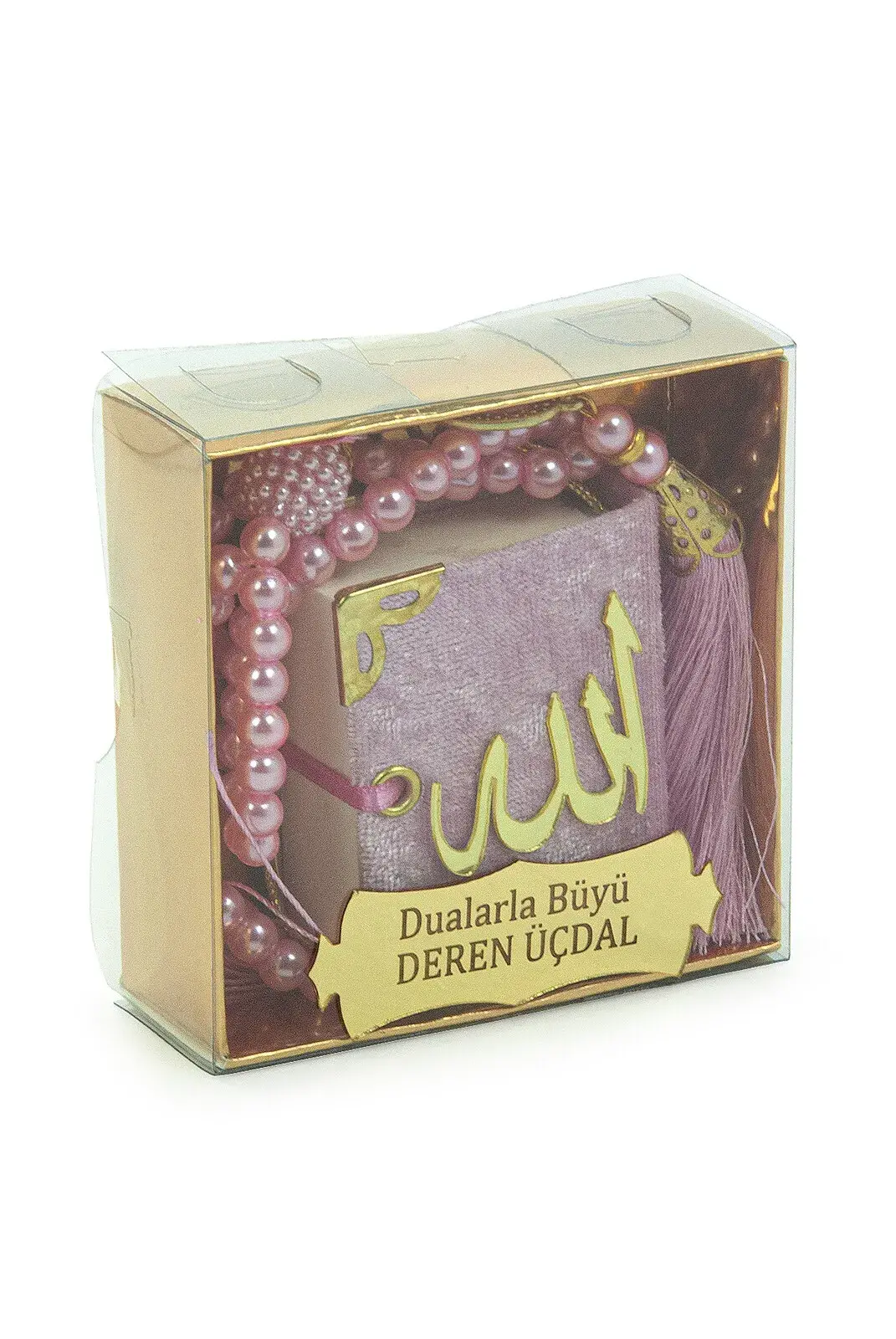10 Adet İsme Özel Kutulu İnci Tesbihli Kadife Kaplı Mini Kuran Mevlüt Hediyesi Pembe