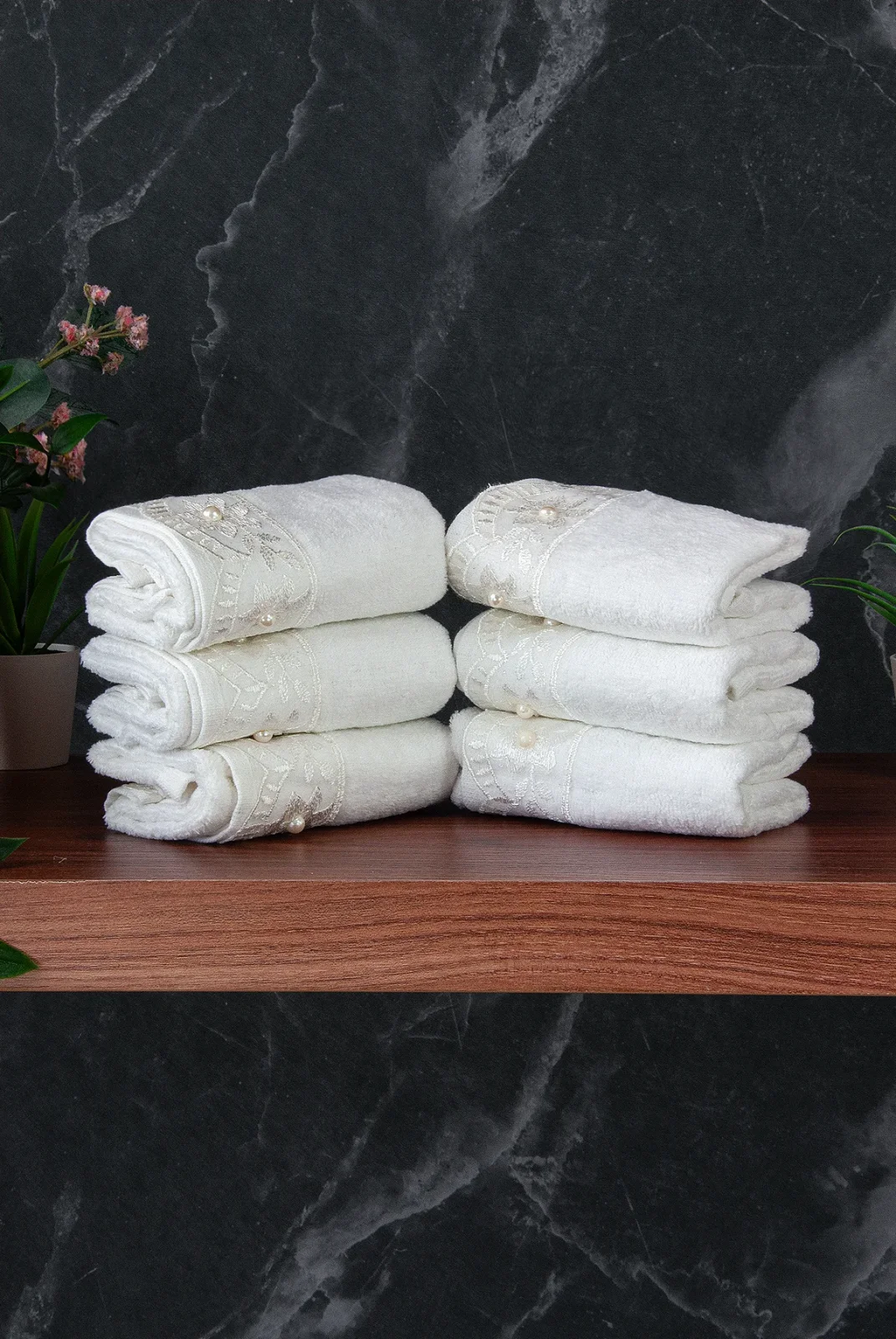 %100 Pamuklu Kadife Güpürlü İncili 6’lı Havlu Seti, hem zariftir hem de dokusuyla premium bir kullanım deneyimi sunar. Kadife dokusu sayesinde klasik pamuk havlulara göre çok daha yumuşak ve konforlu hissiyat sağlar. Kenar kısmındaki güpür işleme ve özenle eklenmiş inci detayları, ürünü özellikle çeyiz ve bohça hazırlıkları için ideal hale getirir.