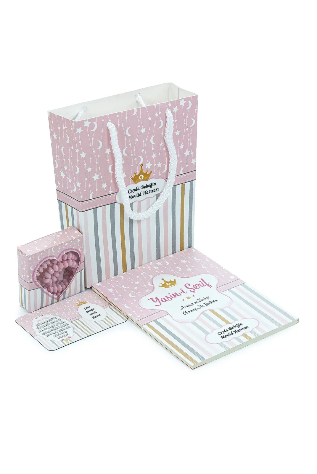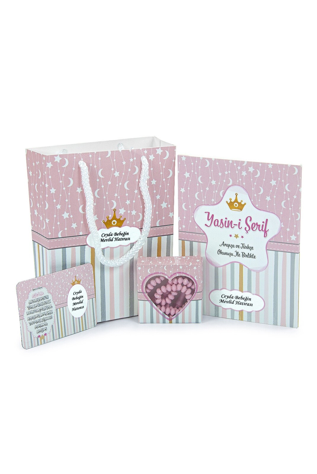 20 Adet Hediyelik 4'lü Mevlüt Seti - İsme Özel Etiketli - Çanta, Tesbih, Magnet Yasin Kitabı - Pembe