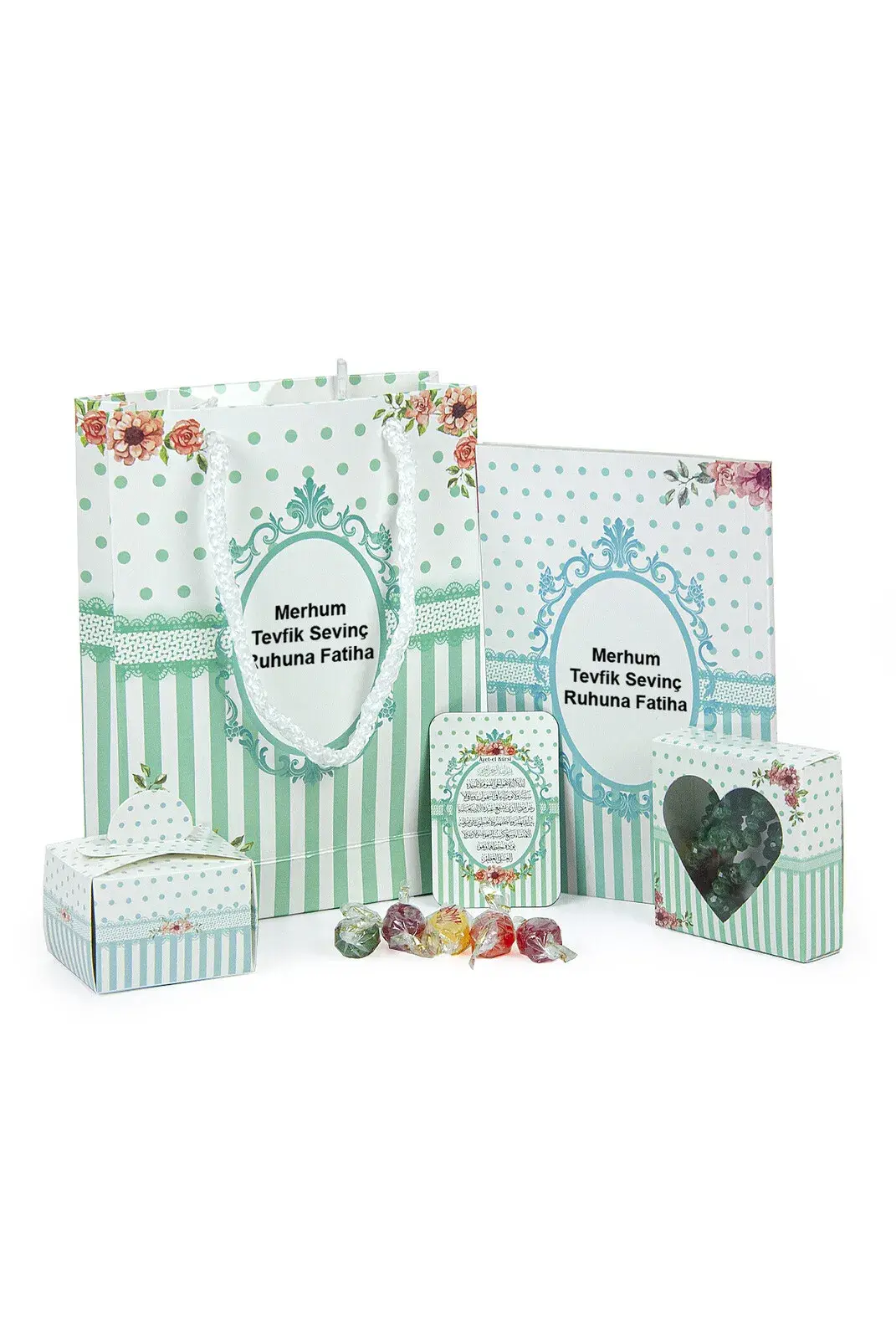 20 Adet Hediyelik 5'li Mevlüt Seti İsme Özel Etiketli Çantalı Tesbihli, Magnetli, Yasin Kitabı - Yeşil