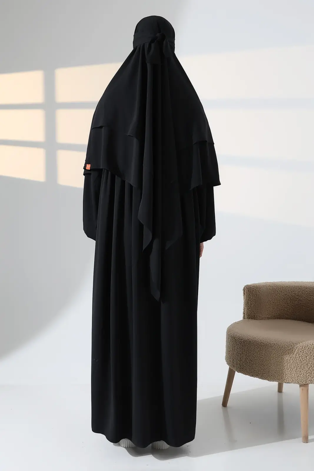 3 Parça Sufleli Peçeli Robalı Ferace Elbise Takım - Siyah