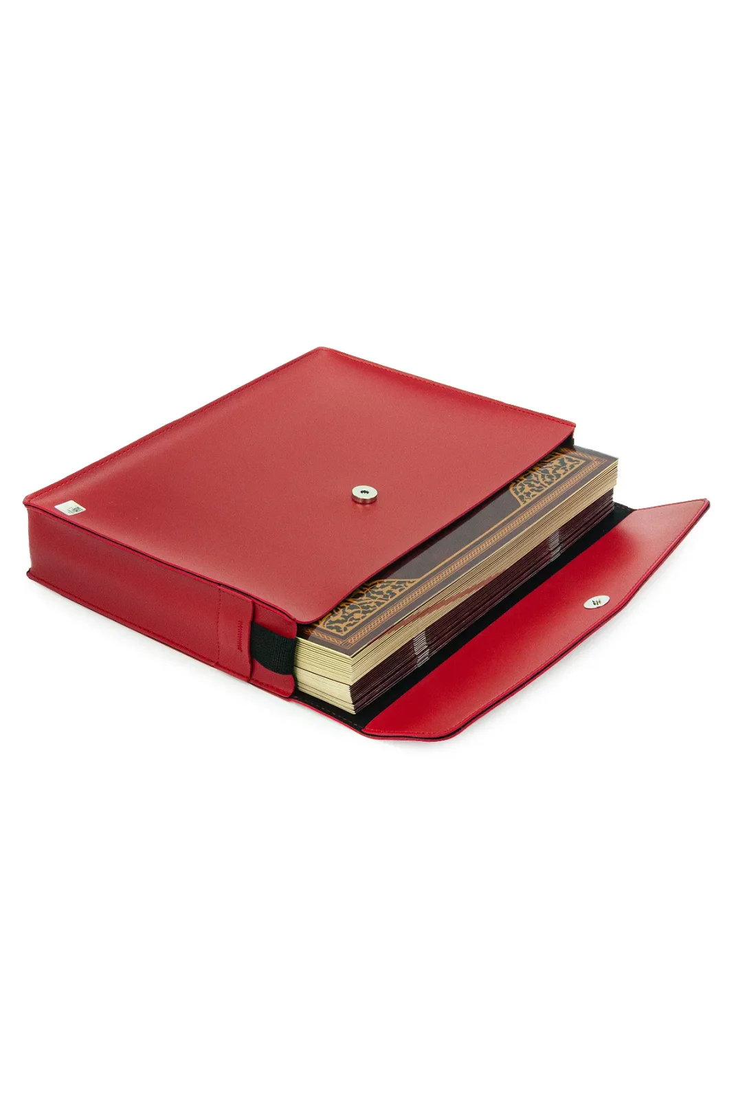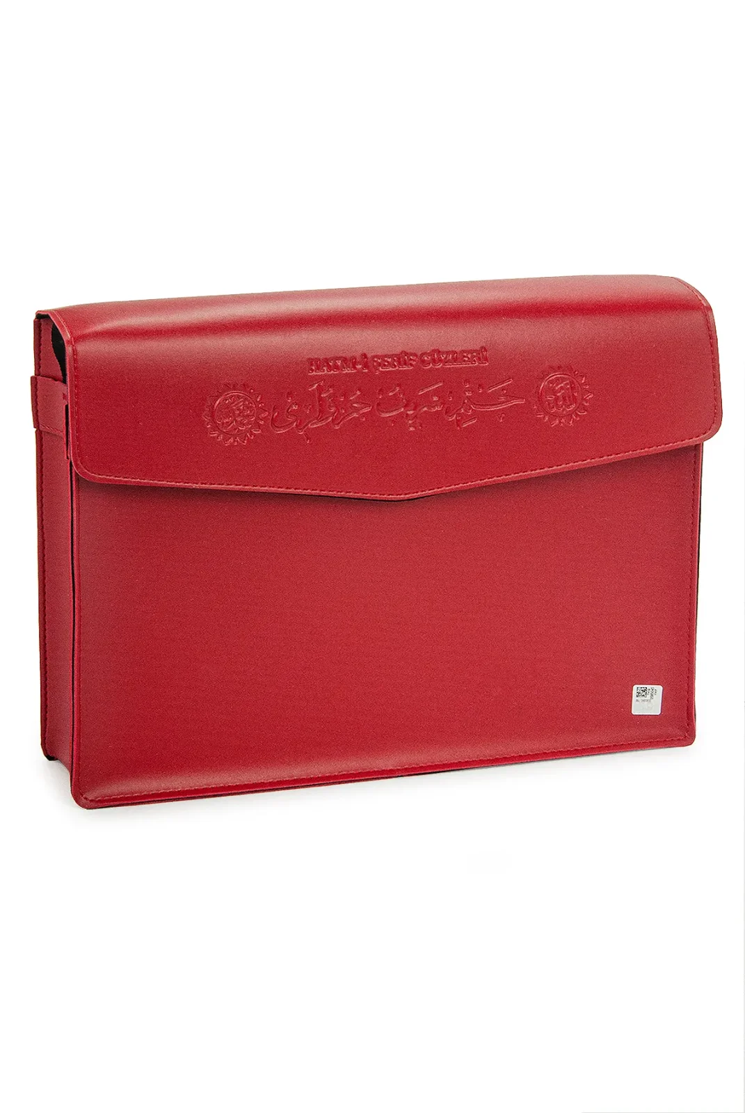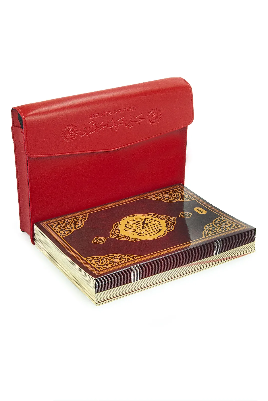 Bu 30 Cüz Suni Deri Çantalı Cami Boy Kuran-ı Kerim, kırmızı renkte olup, şık ve dayanıklı bir tasarıma sahiptir. Arapça bilgisayar hattıyla yazılmış olup, her bir sayfa dikkatlice yerleştirilmiş ve okunabilirliği artırılmıştır. Mıknatıslı kapak sayesinde, Kuran'ınız güvenle kapanır ve taşınması son derece kolaydır. Ürünün üzerinde tutma kayışı da bulunur, bu da pratik kullanım sağlar. Bu Kuran, hem evde hem de seyahatte rahatça kullanılabilecek mükemmel bir seçenektir.