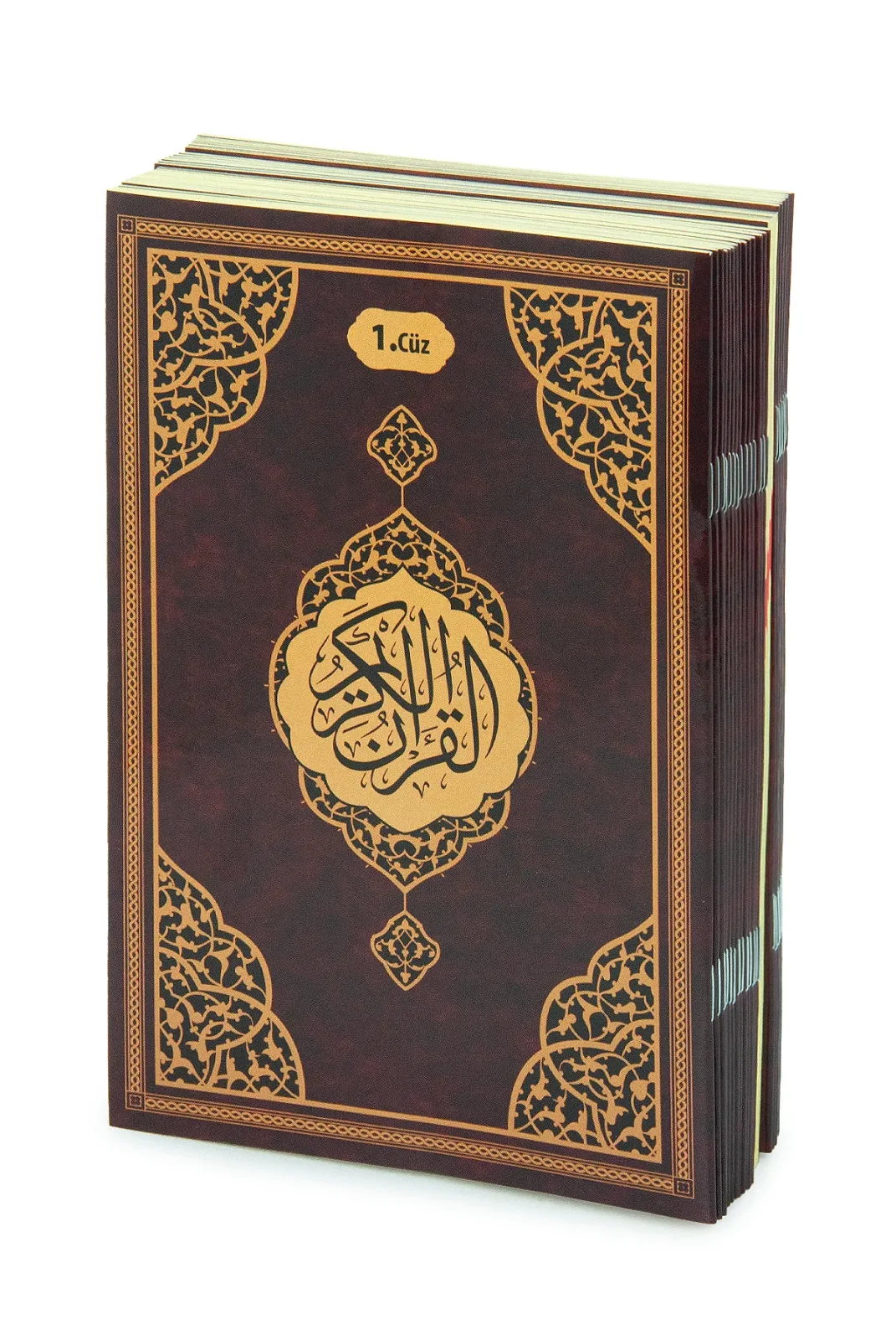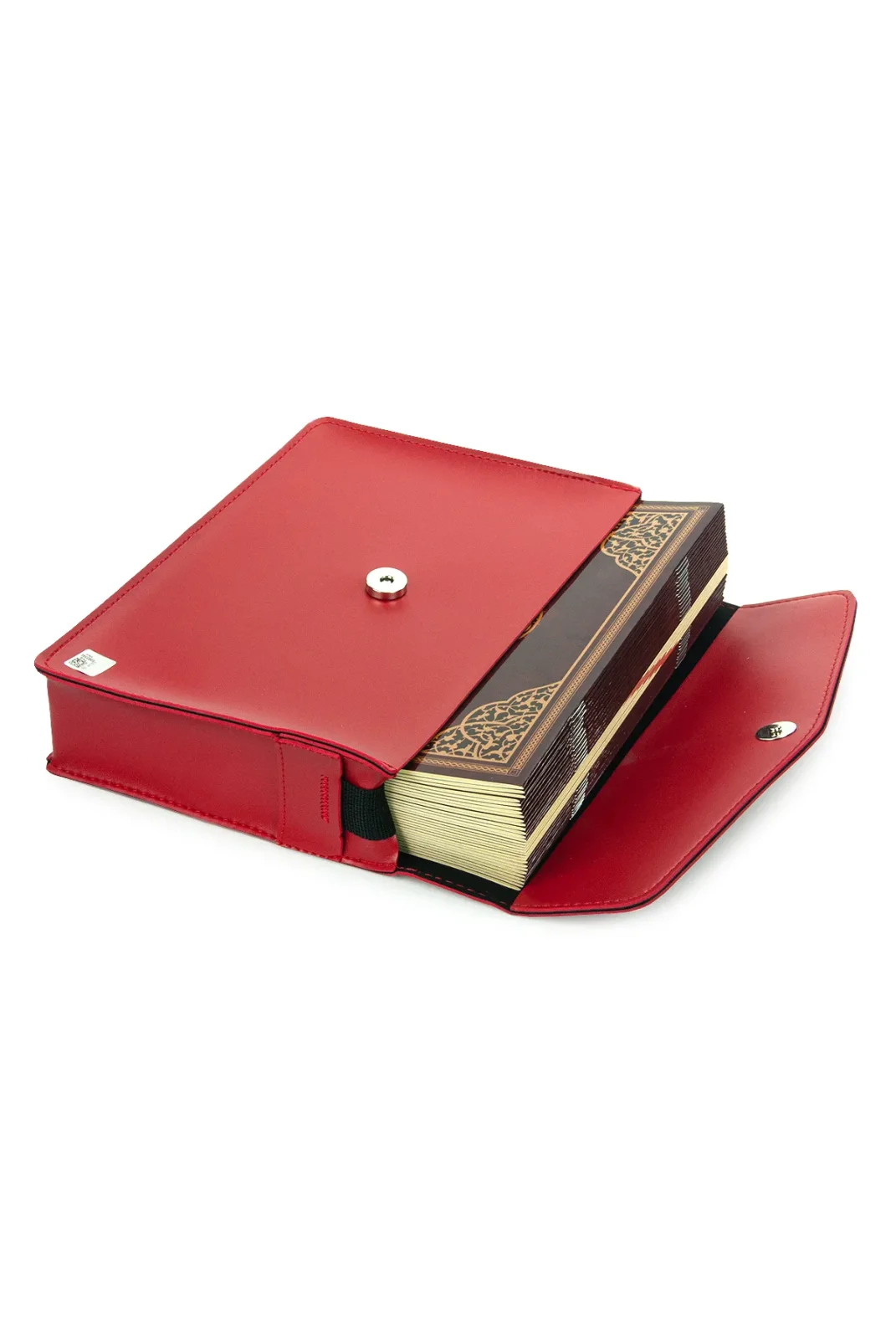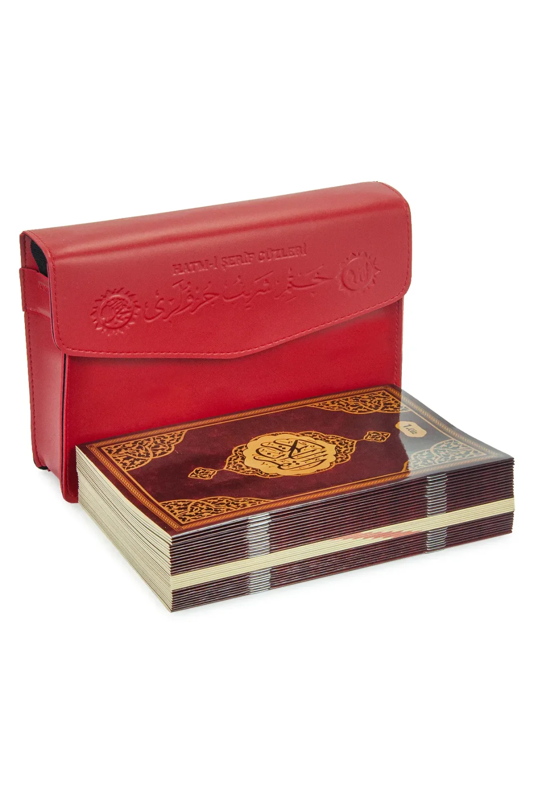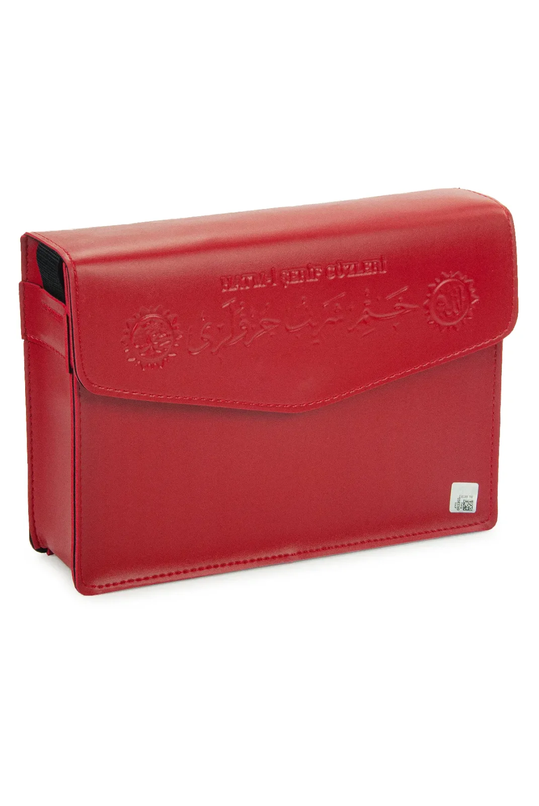 Bu 30 Cüz Suni Deri Çantalı Orta Boy Kuran-ı Kerim, kırmızı renkte olup, şık ve dayanıklı bir tasarıma sahiptir. Arapça bilgisayar hattıyla yazılmış olup, her bir sayfa dikkatlice yerleştirilmiş ve okunabilirliği artırılmıştır. Mıknatıslı kapak sayesinde, Kuran'ınız güvenle kapanır ve taşınması son derece kolaydır. Ürünün üzerinde tutma kayışı da bulunur, bu da pratik kullanım sağlar. Bu Kuran, hem evde hem de seyahatte rahatça kullanılabilecek mükemmel bir seçenektir.