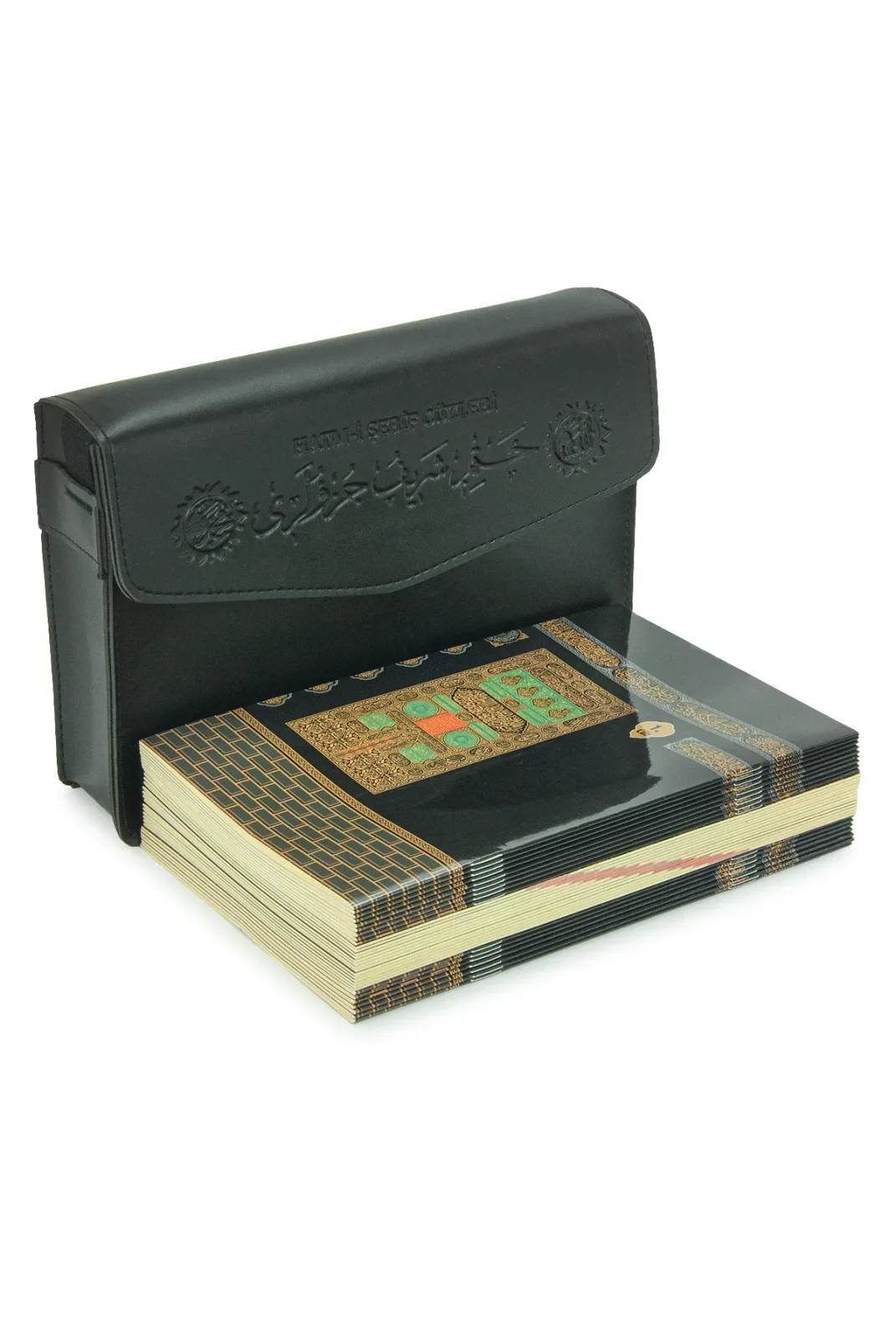 Bu 30 Cüz Suni Deri Çantalı Orta Boy Kuran-ı Kerim, siyah renkte olup, şık ve dayanıklı bir tasarıma sahiptir. Arapça bilgisayar hattıyla yazılmış olup, her bir sayfa dikkatlice yerleştirilmiş ve okunabilirliği artırılmıştır. Mıknatıslı kapak sayesinde, Kuran'ınız güvenle kapanır ve taşınması son derece kolaydır. Ürünün üzerinde tutma kayışı da bulunur, bu da pratik kullanım sağlar. Bu Kuran, hem evde hem de seyahatte rahatça kullanılabilecek mükemmel bir seçenektir.