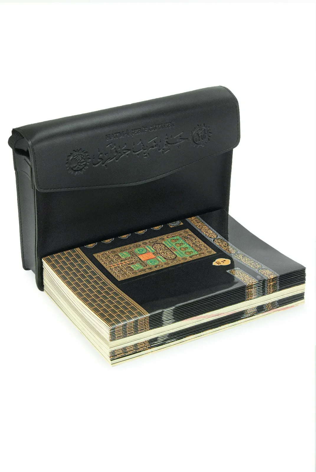 Bu 30 Cüz Suni Deri Çantalı Rahle Boy Kuran-ı Kerim, siyah renkte olup, şık ve dayanıklı bir tasarıma sahiptir. Arapça bilgisayar hattıyla yazılmış olup, her bir sayfa dikkatlice yerleştirilmiş ve okunabilirliği artırılmıştır. Mıknatıslı kapak sayesinde, Kuran'ınız güvenle kapanır ve taşınması son derece kolaydır. Ürünün üzerinde tutma kayışı da bulunur, bu da pratik kullanım sağlar. Bu Kuran, hem evde hem de seyahatte rahatça kullanılabilecek mükemmel bir seçenektir.
