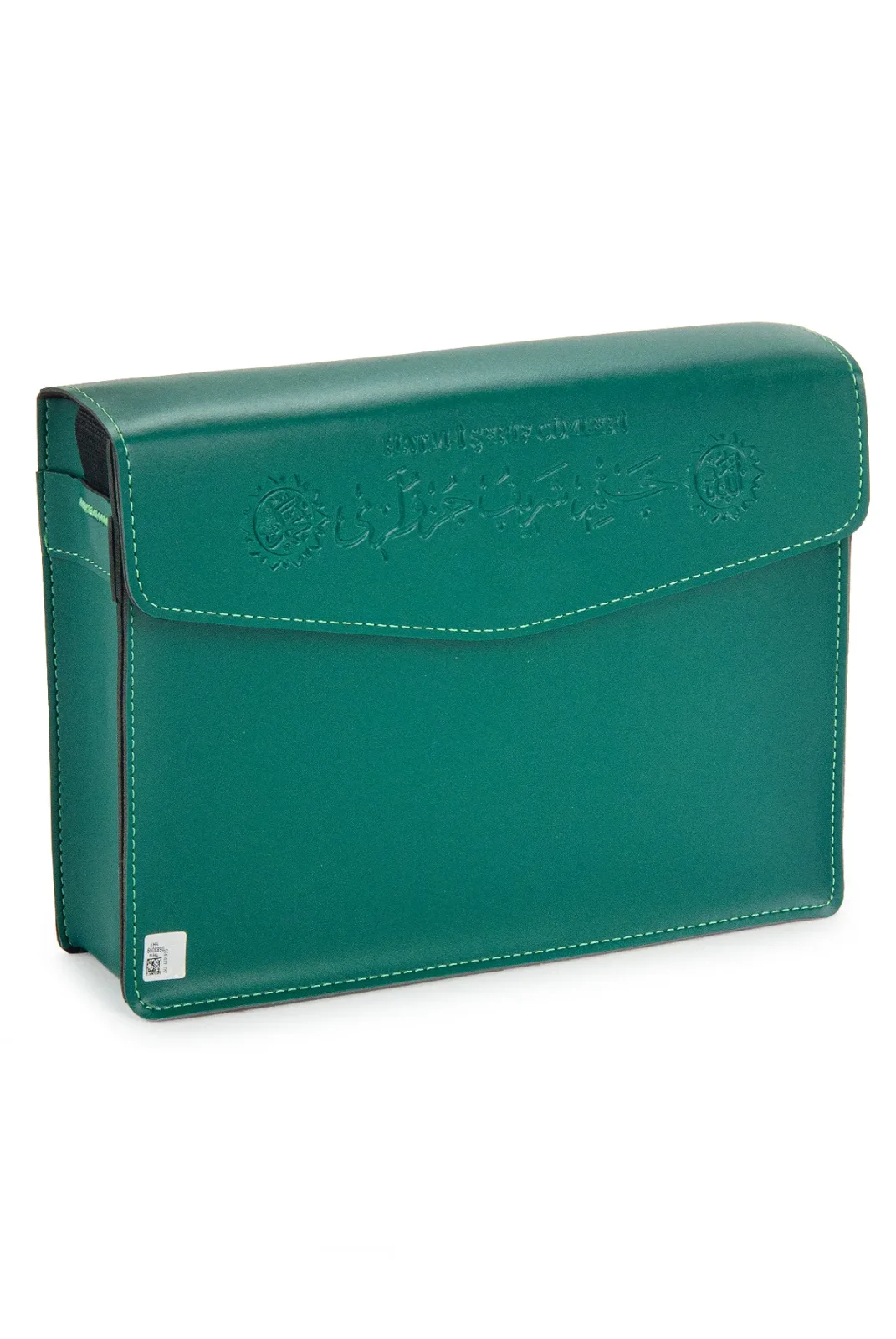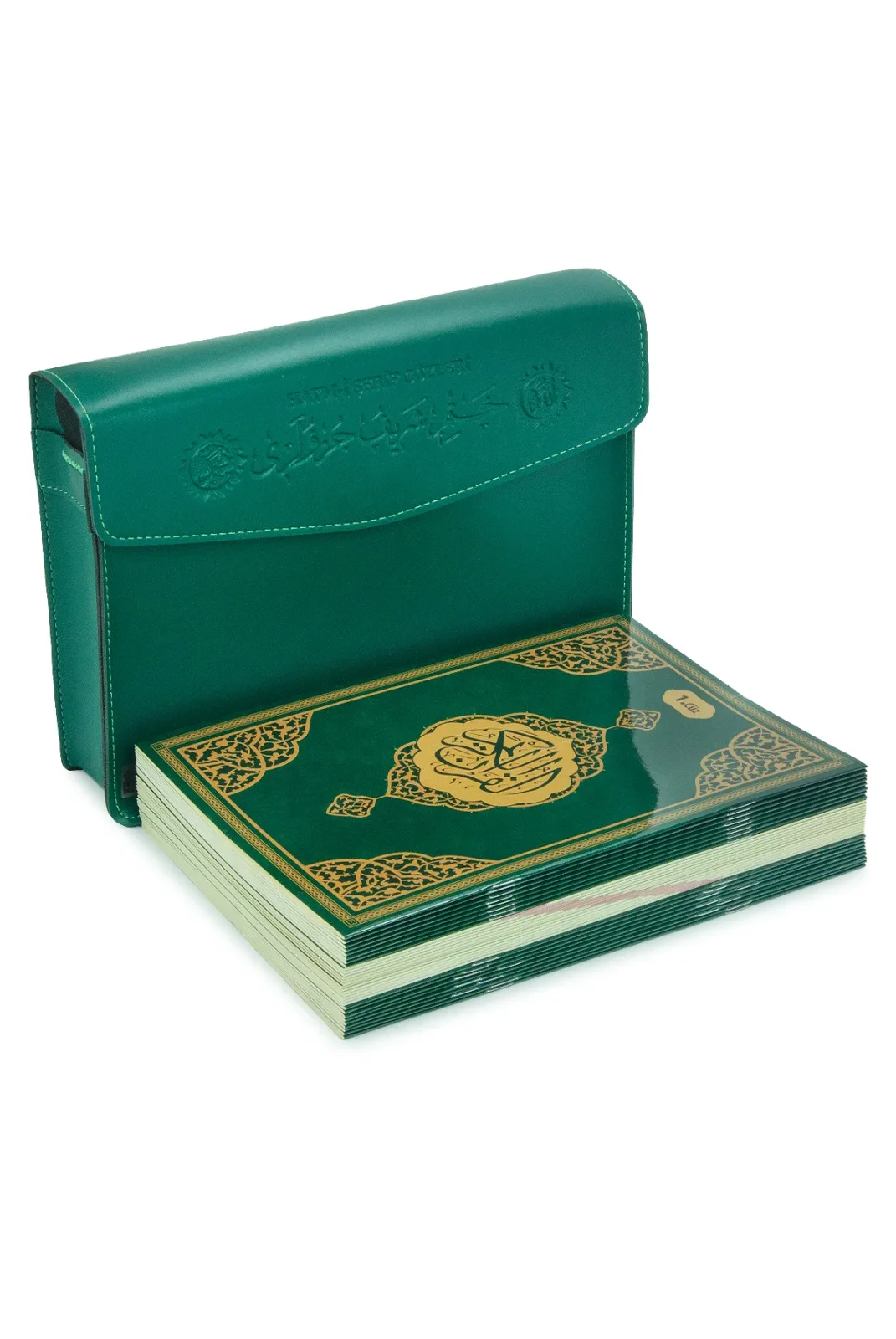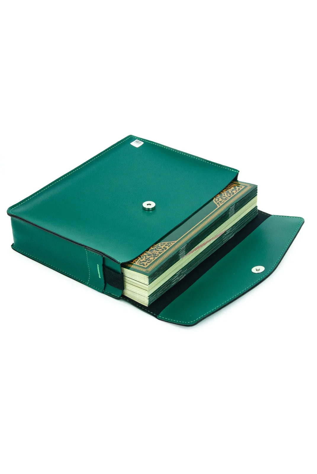Bu 30 Cüz Suni Deri Çantalı Rahle Boy Kuran-ı Kerim, yeşil renkte olup, şık ve dayanıklı bir tasarıma sahiptir. Arapça bilgisayar hattıyla yazılmış olup, her bir sayfa dikkatlice yerleştirilmiş ve okunabilirliği artırılmıştır. Mıknatıslı kapak sayesinde, Kuran'ınız güvenle kapanır ve taşınması son derece kolaydır. Ürünün üzerinde tutma kayışı da bulunur, bu da pratik kullanım sağlar. Bu Kuran, hem evde hem de seyahatte rahatça kullanılabilecek mükemmel bir seçenektir.
