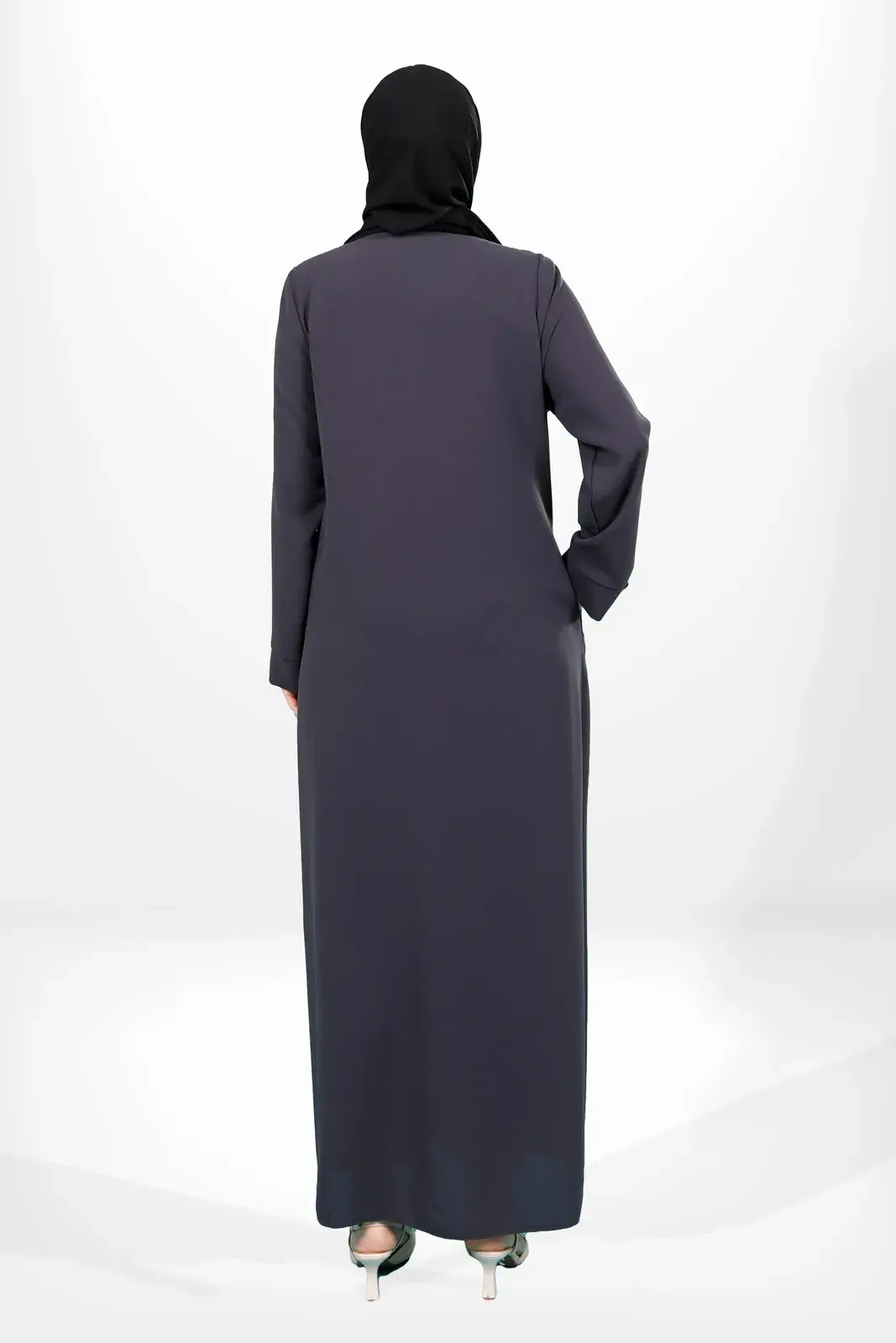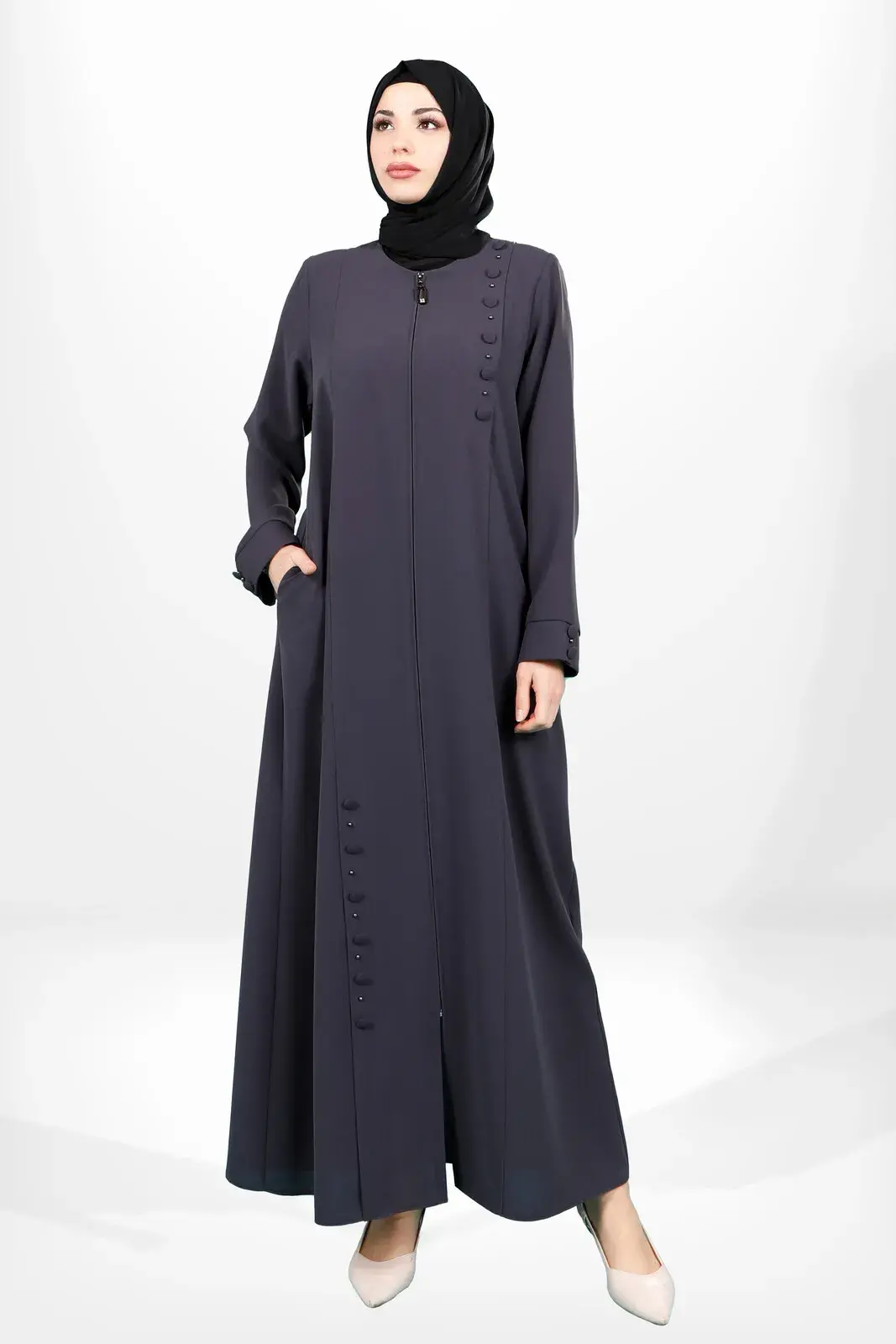 Astarsız ürün fermuarlı yan cep kısmı fermuarlı kloş tesettür füme ferace.