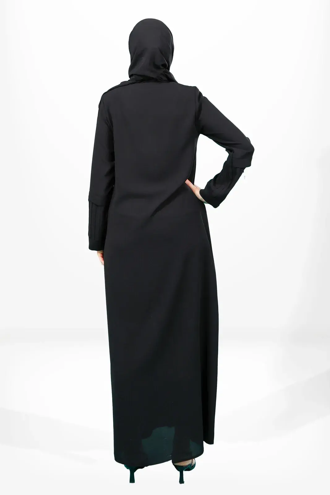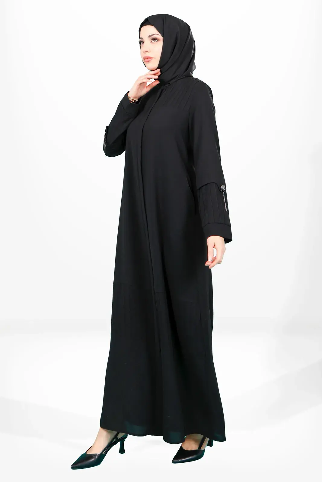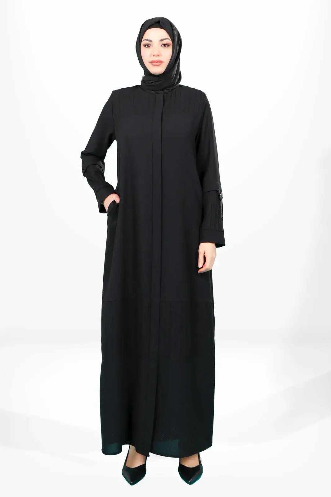 Astarsız, ürün fermuarlı ön üst kısmı, kol kenarları nervürlü ve aksesuarı olan bej tesettür siyah ferace. .