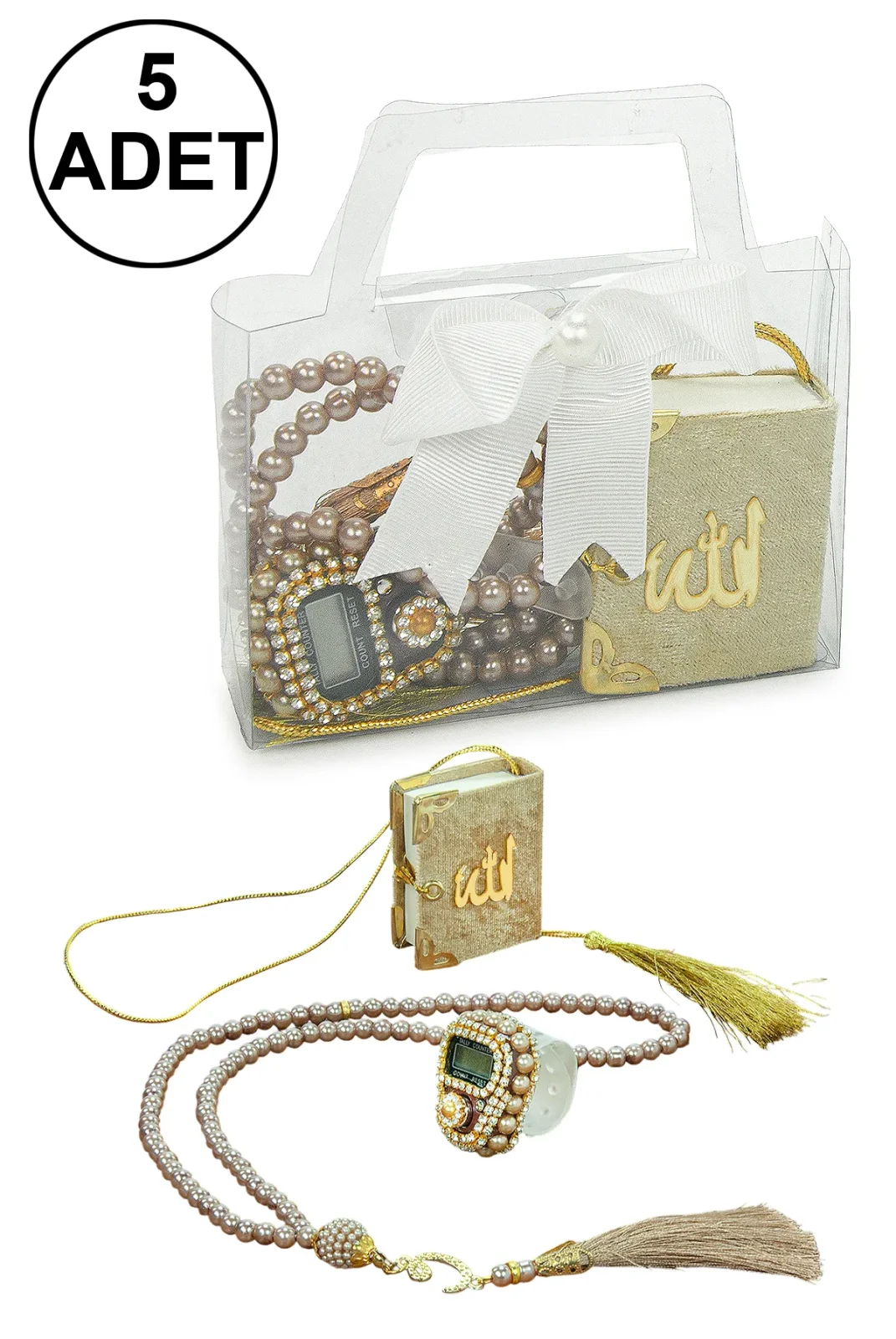 5 Adet Zikirmatik: Dijital zikirmatik, taş detaylarıyla süslenmiş, pratik kullanımı sayesinde zikirleri saymayı kolaylaştırır.