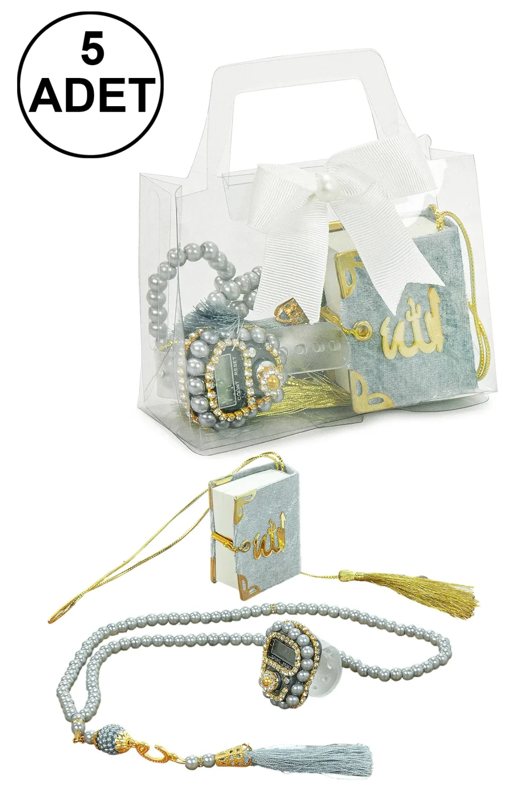 5 Adet Zikirmatik: Dijital zikirmatik, taş detaylarıyla süslenmiş, pratik kullanımı sayesinde zikirleri saymayı kolaylaştırır.