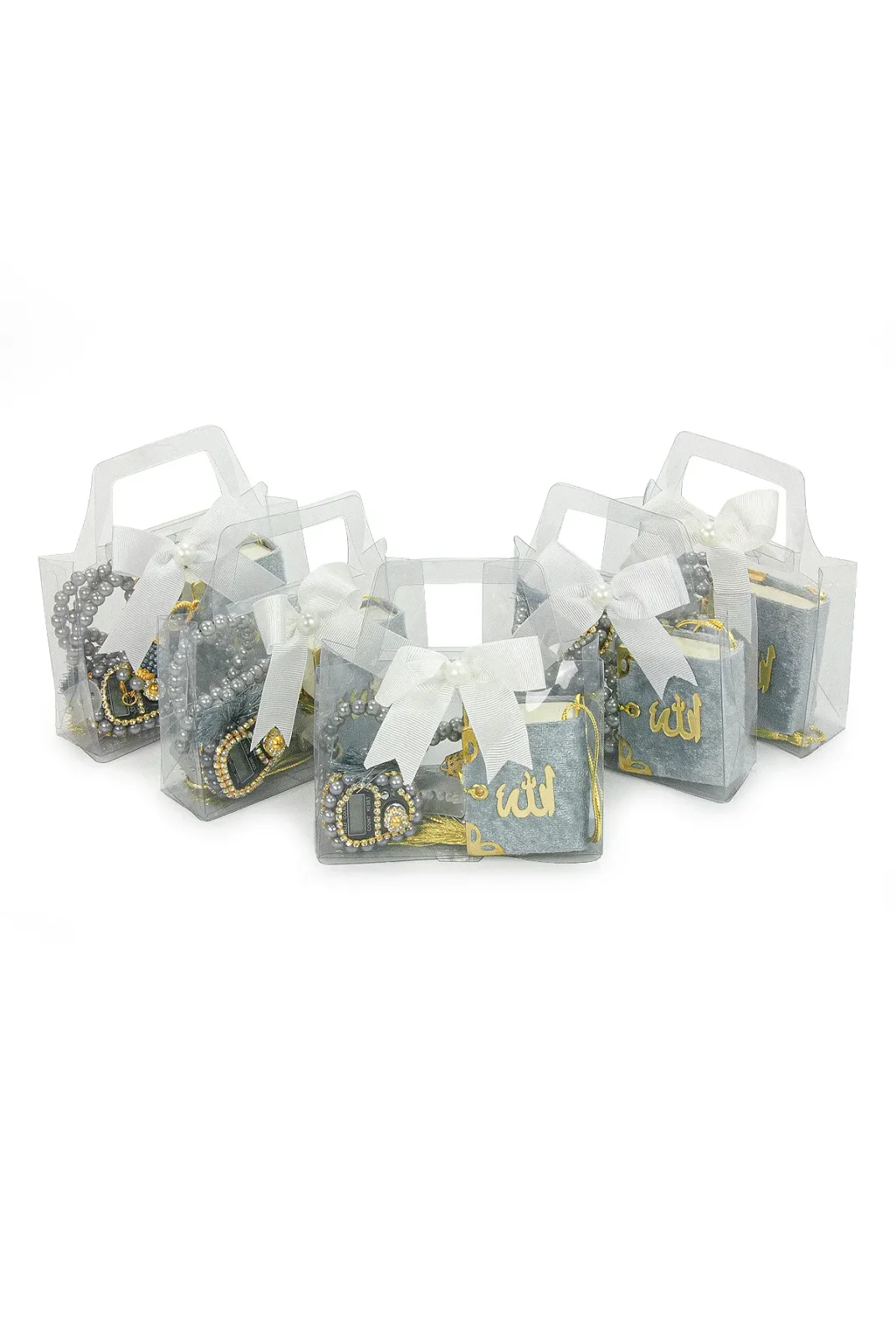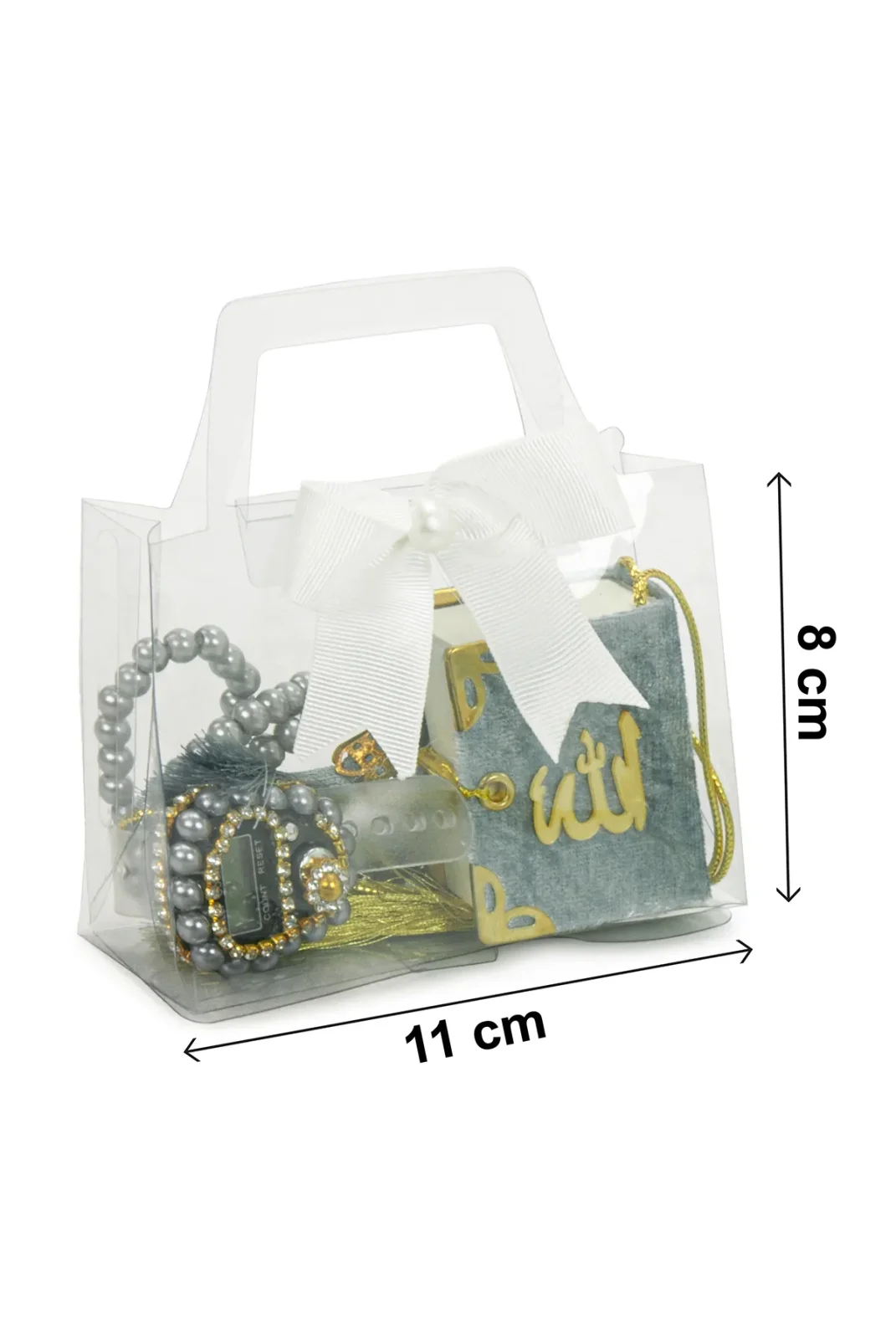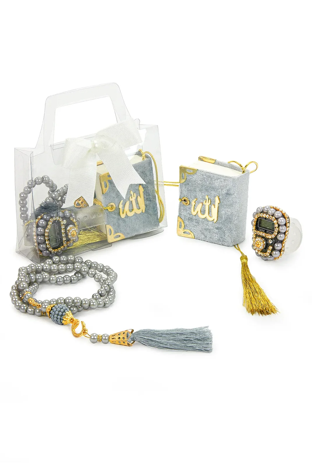Sevdiklerinizi özel tasarlanmış ve anlam yüklü bir hediye ile mutlu edin! Bu hediye seti, her detayıyla şıklığı ve manevi değeri bir araya getiriyor. Set, gri renginde zarif bir tasarıma sahip olup, mini boy Kuran-ı Kerim, zikirmatik, tesbih ve şık bir hediye çantası ile birlikte sunulmaktadır. Hem kadınlar hem de erkekler için uygundur, özel günlerde unutulmaz bir hediye alternatifi olarak tercih edilebilir.