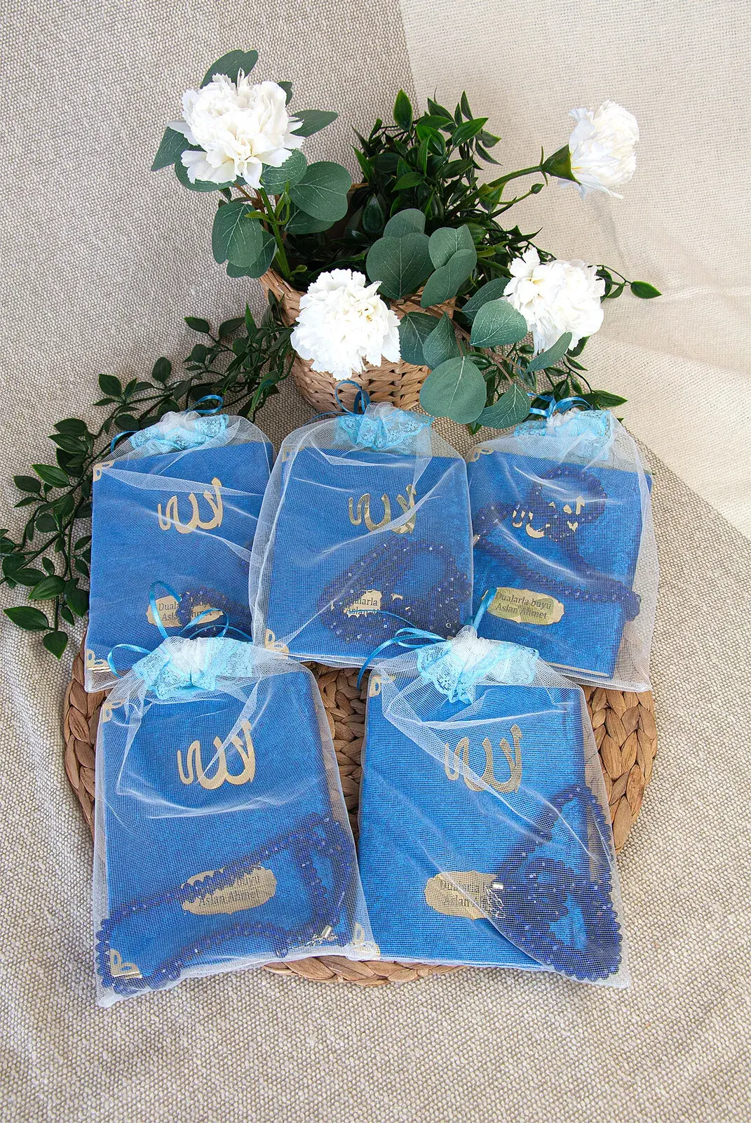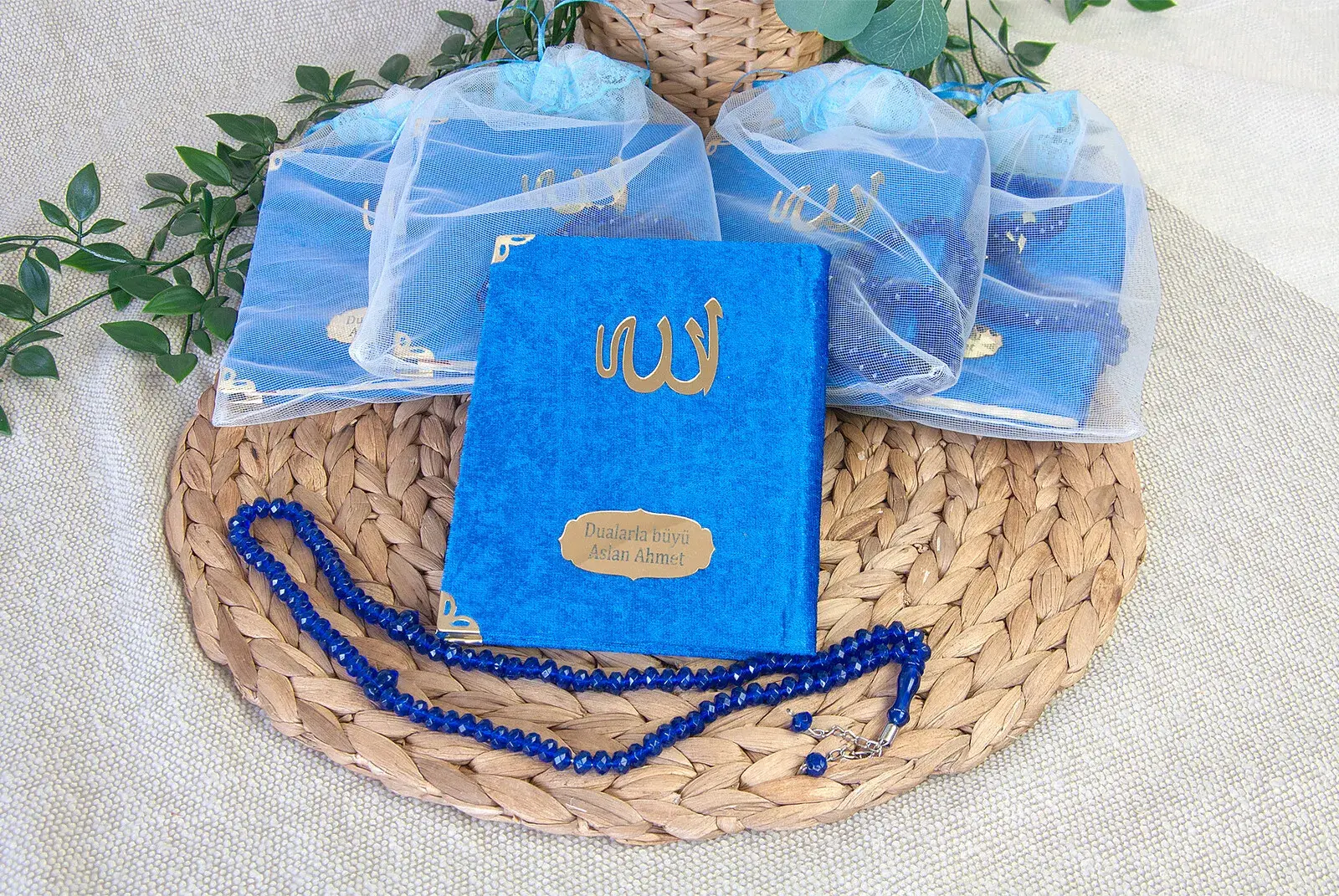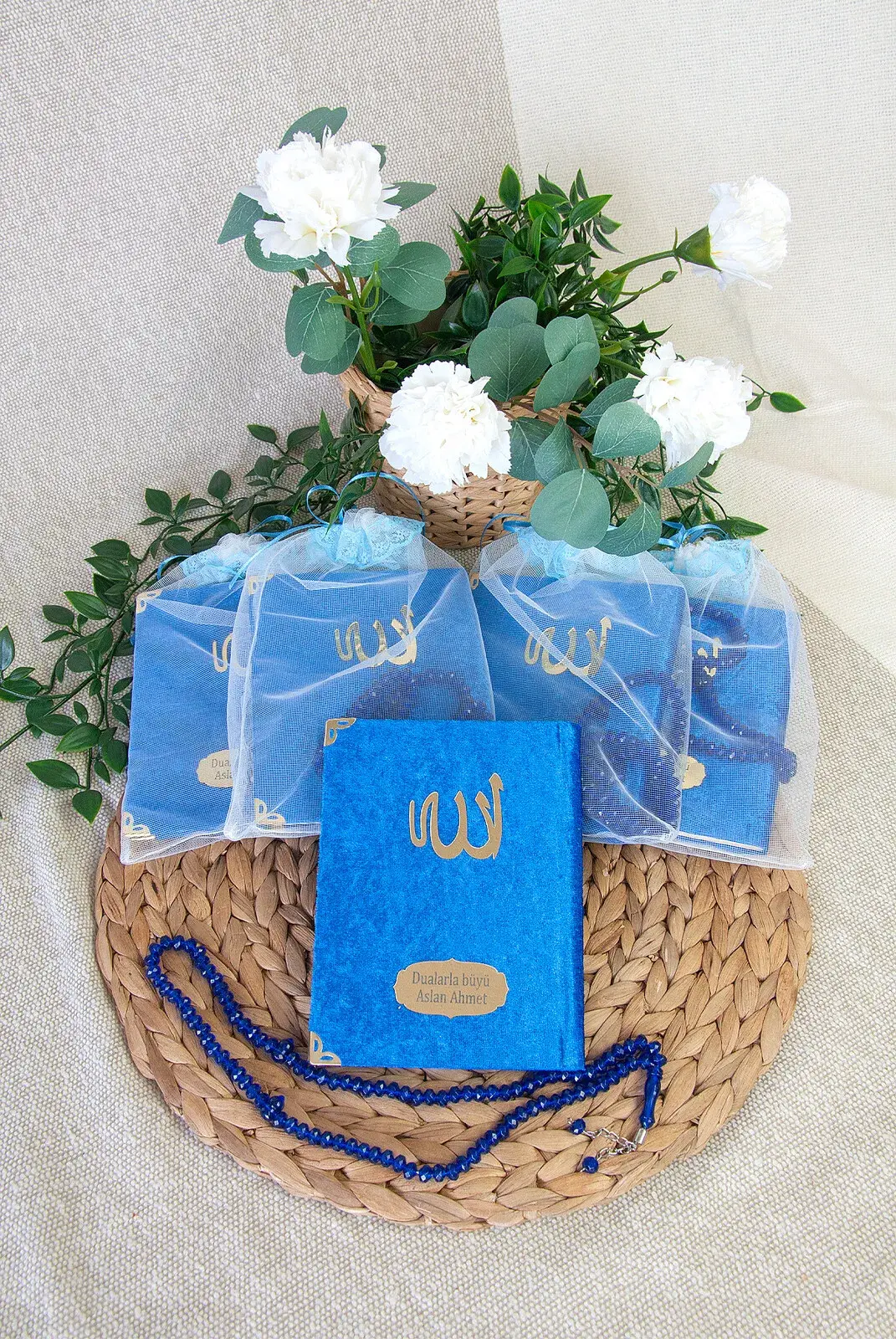 5 Adet Keseli Tesbihli İsim Baskılı Kadife Kaplı Yasin Mevlüt Kitabı Seti Hediyesi Lacivert