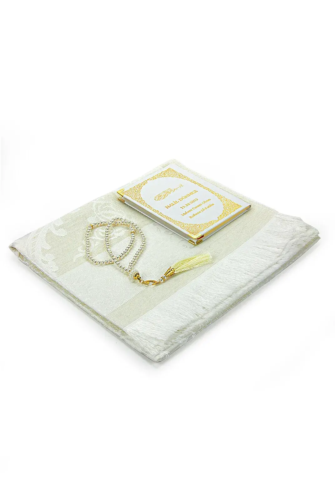 Beyaz 50 Adet İsim Baskılı Deri Ciltli Çanta Boy Yasin Kitabı Seccade Seti Mevlit Hediyesi