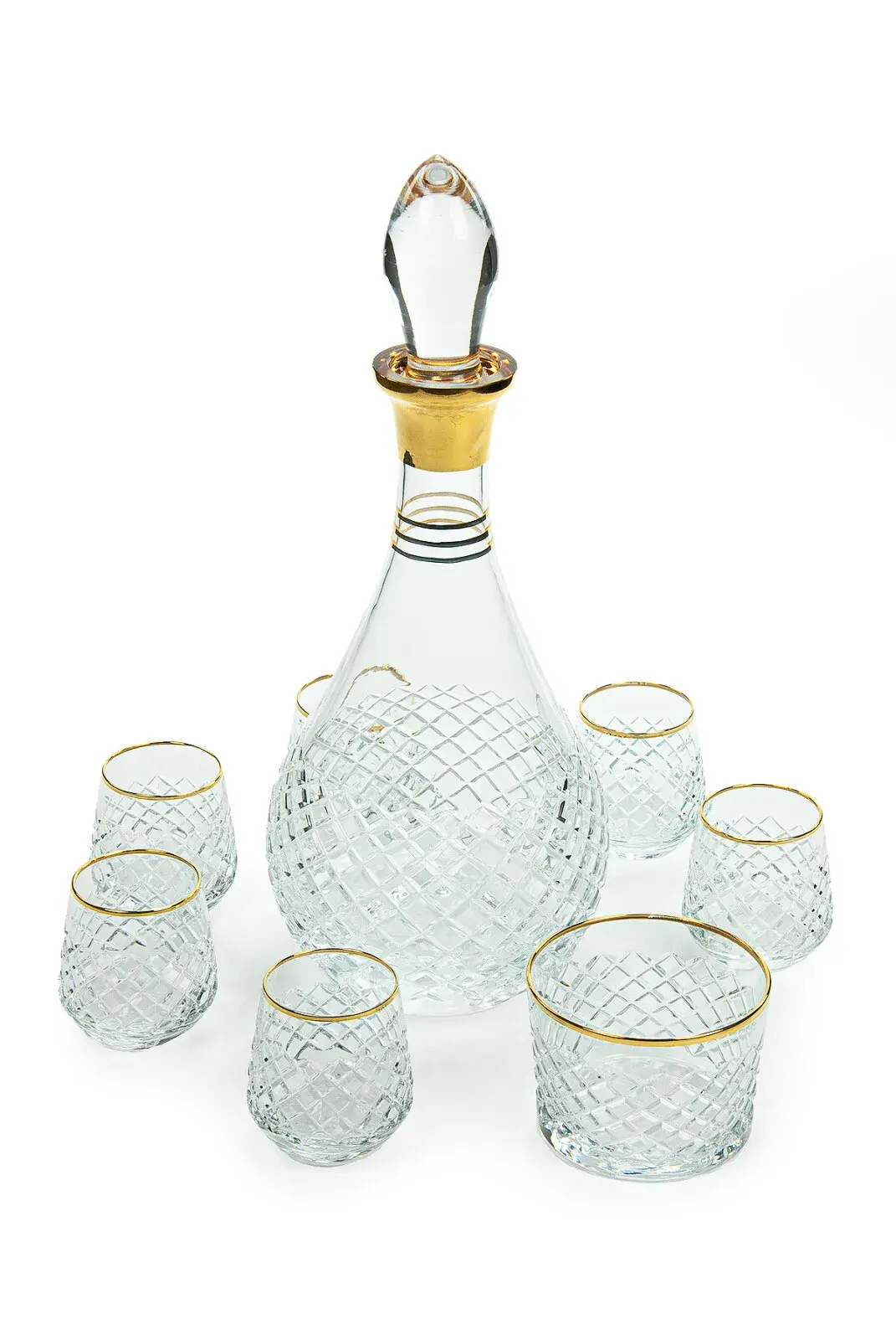 Bu zarif zemzem takımı, kristal kesim detayları ve altın işlemeleriyle sofralarınıza şıklık katar. Özel günlerde misafirlerinize unutulmaz bir sunum yaparken, günlük kullanımda da sofistike bir hava yaratır. Dayanıklılığı ve estetik tasarımıyla uzun yıllar keyifle kullanılabilir.