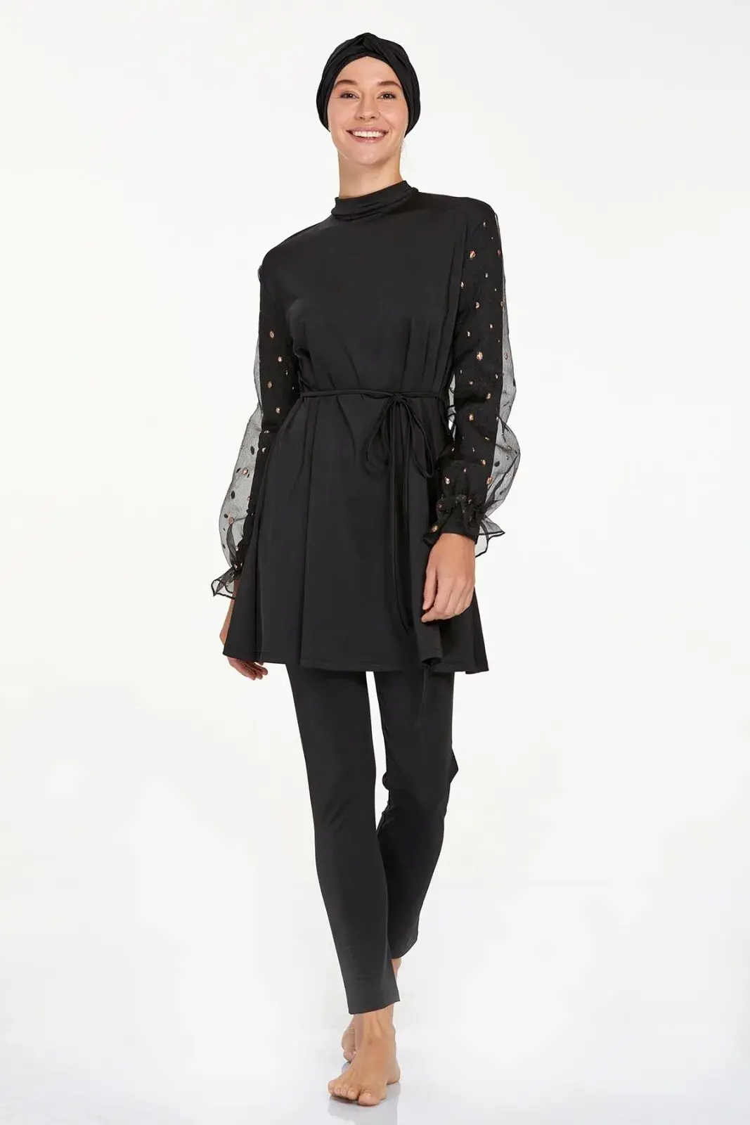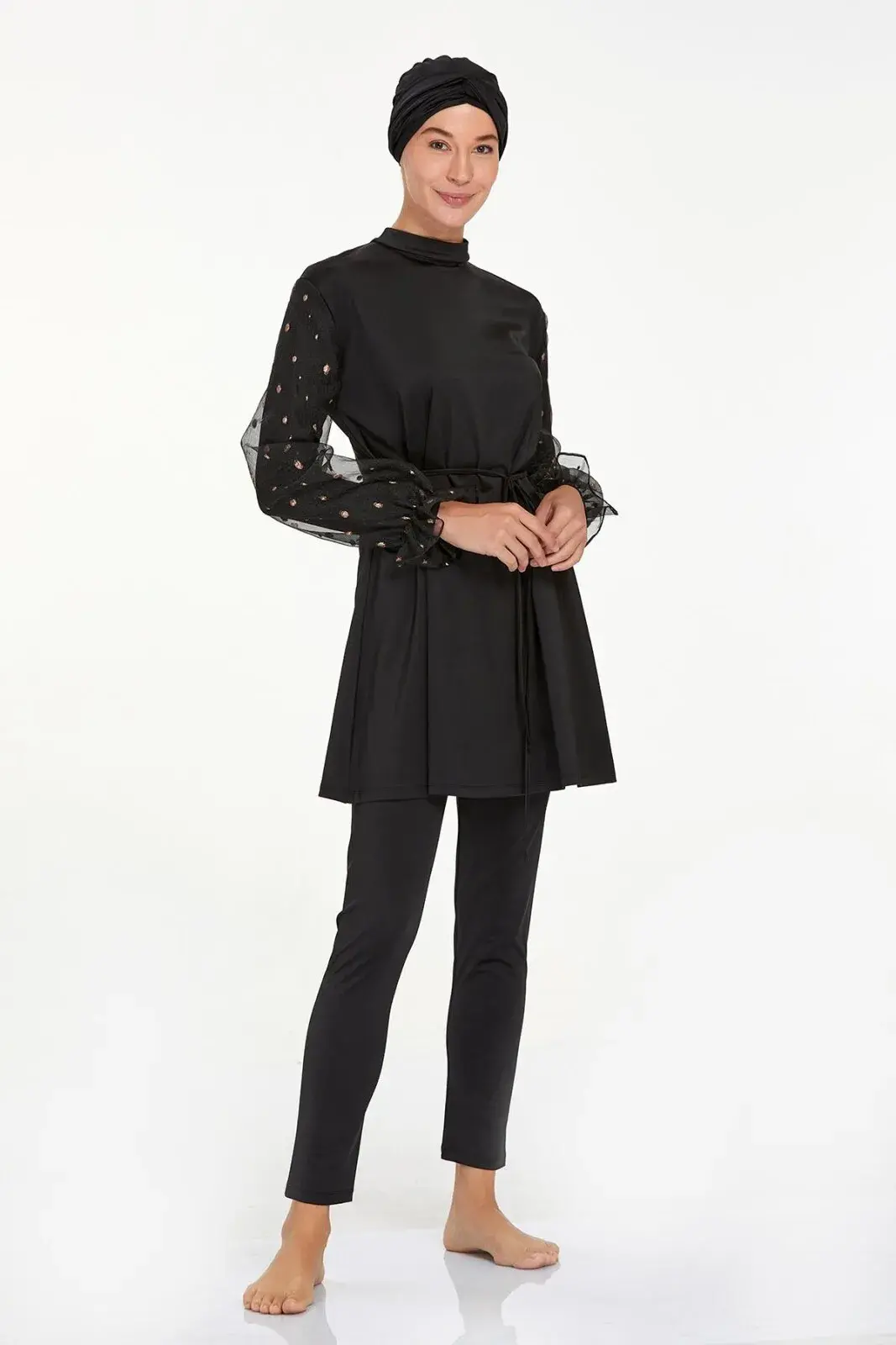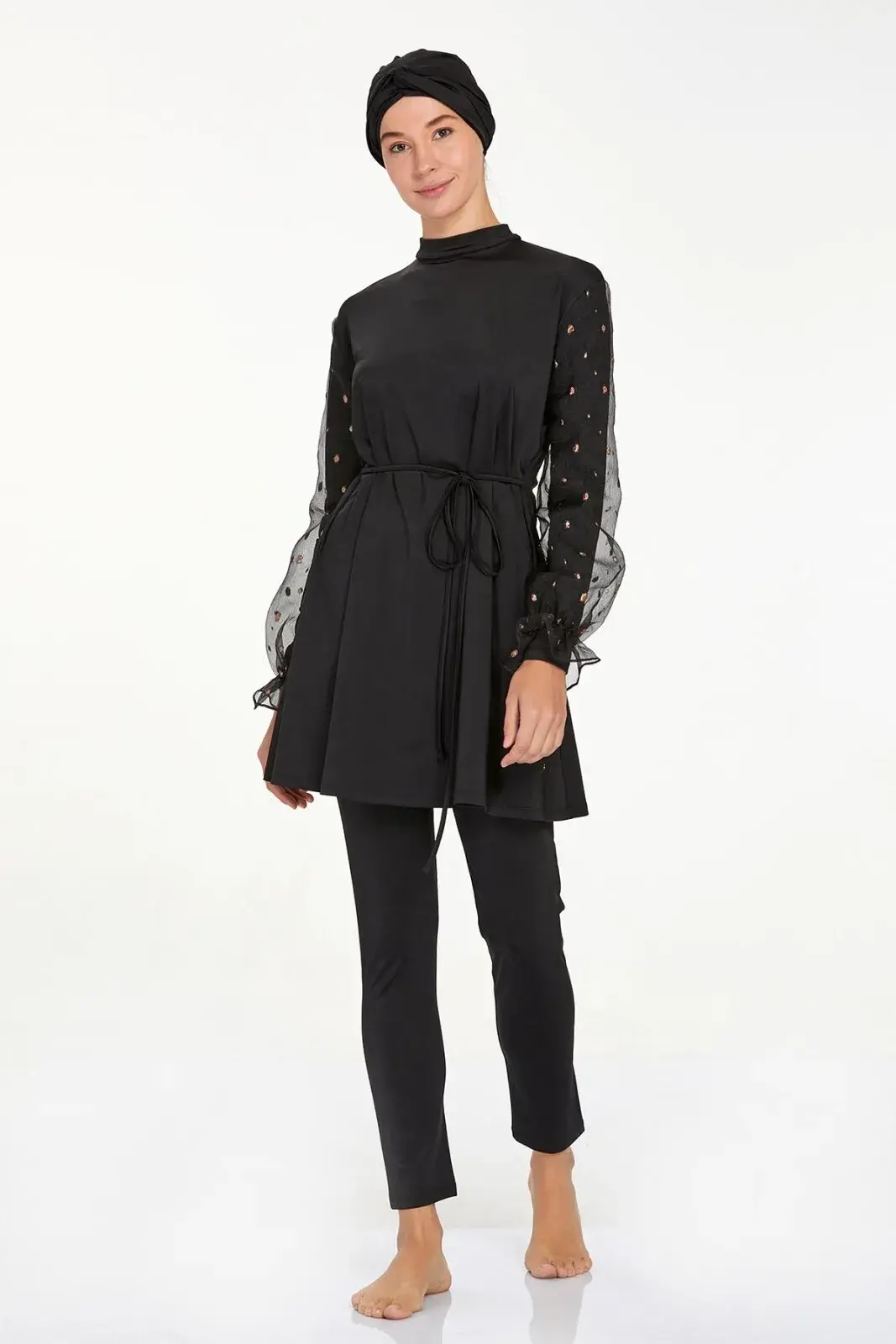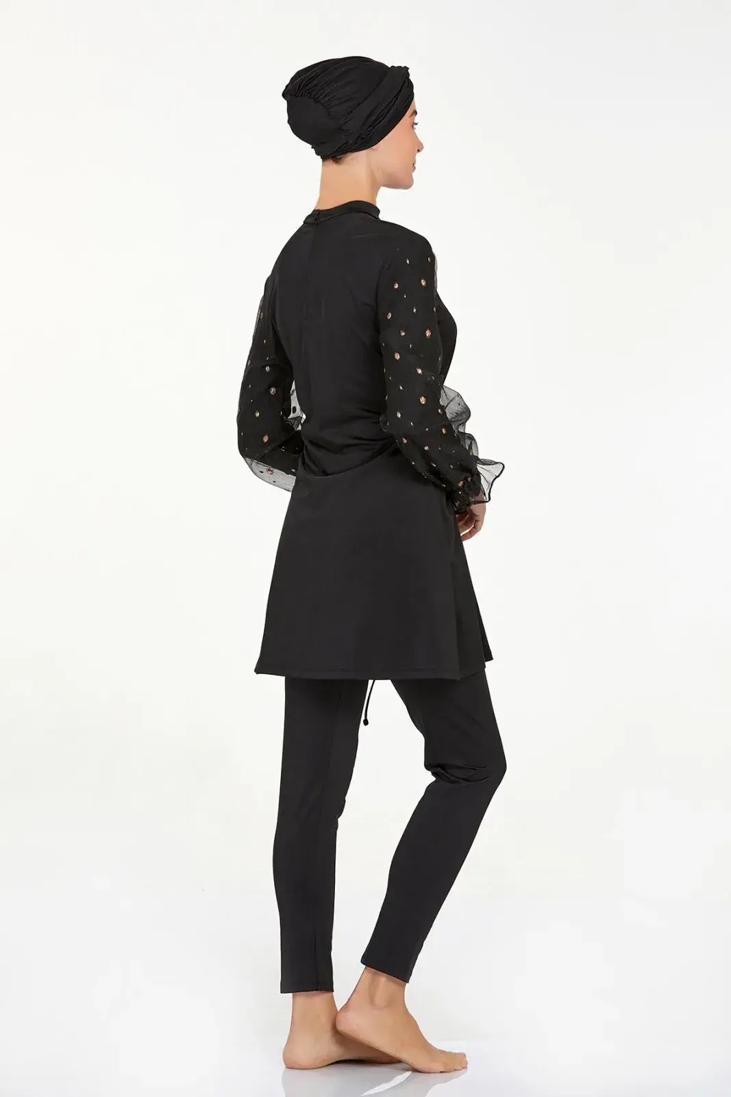 Adasea 4557 Siyah Likralı Şifon Kol Detaylı Tam Kapalı Tesettür Mayo Takımı