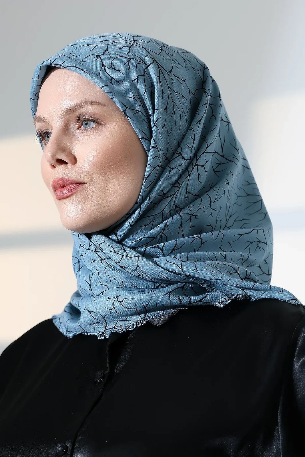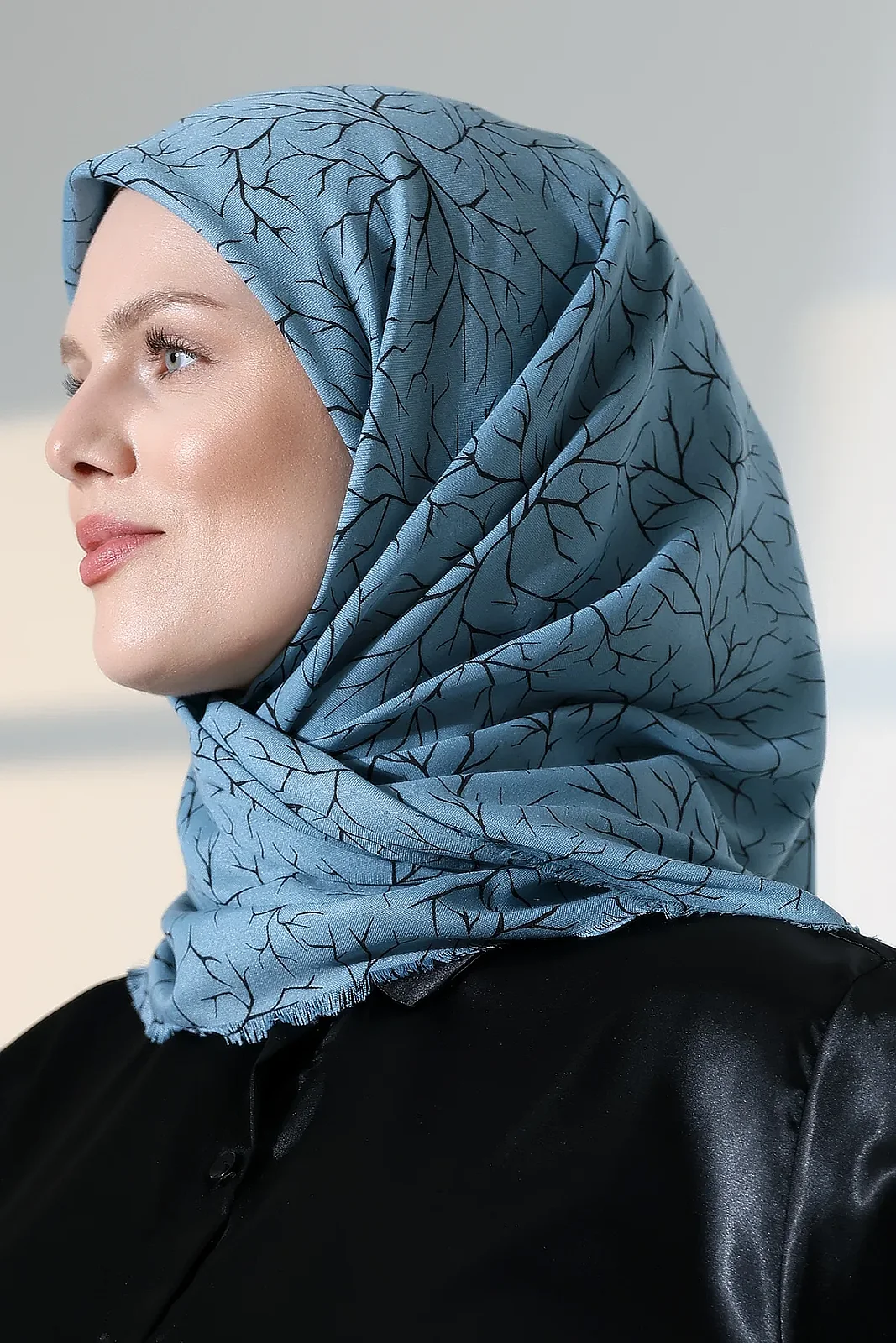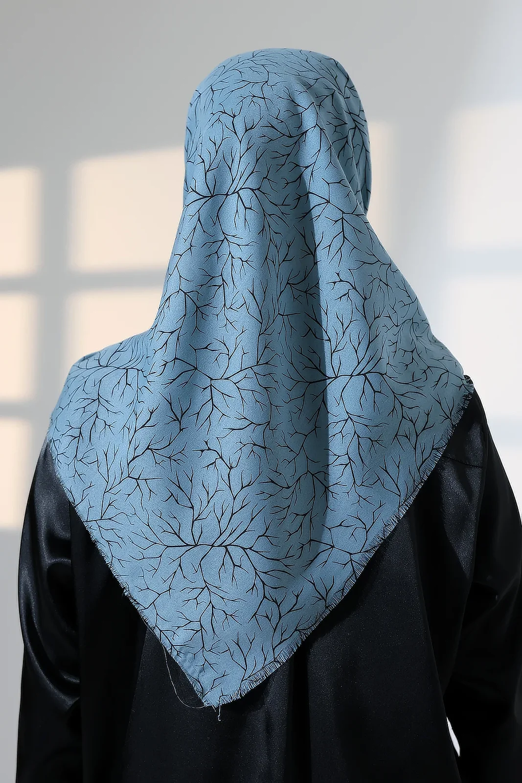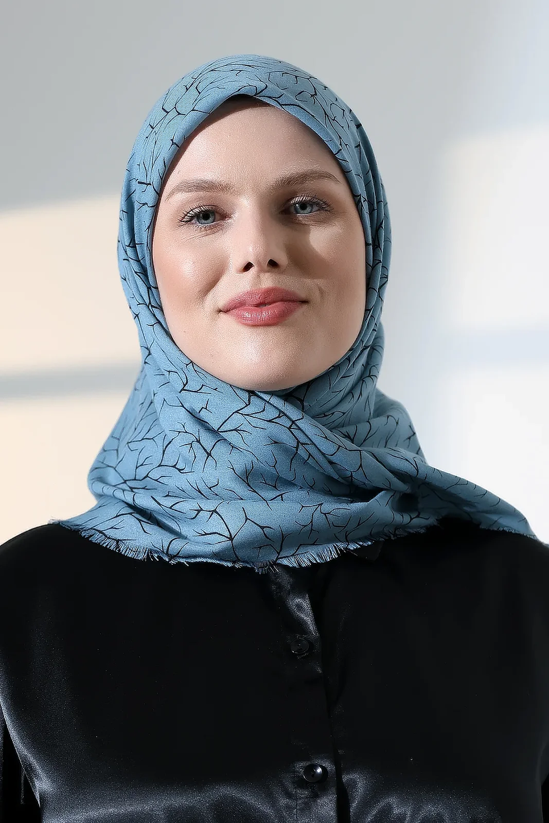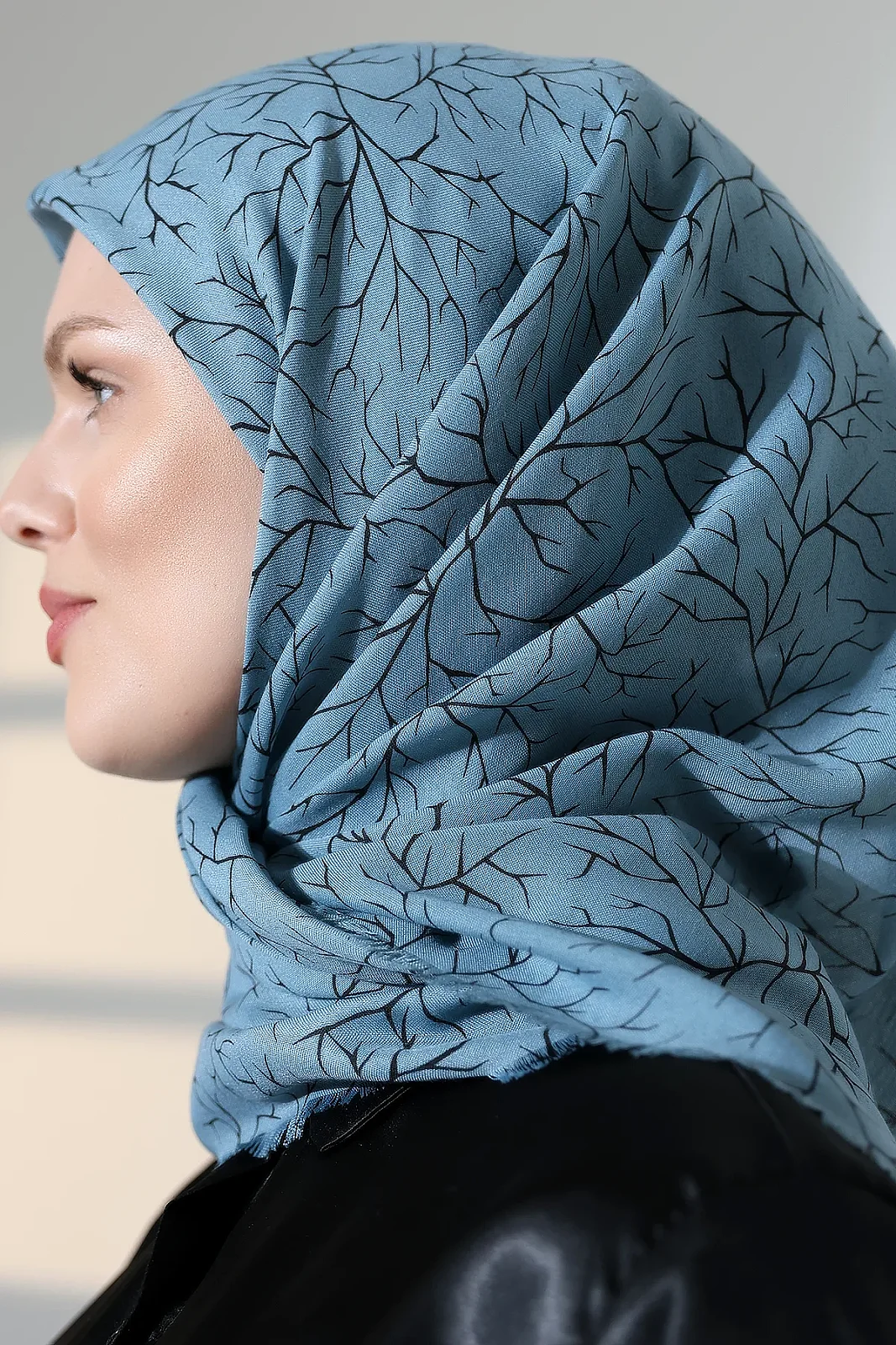 Ağaç Desenli Pamuklu Eşarp, Yumuşak Dokulu Flamlı Yazma Başörtüsü - Mavi