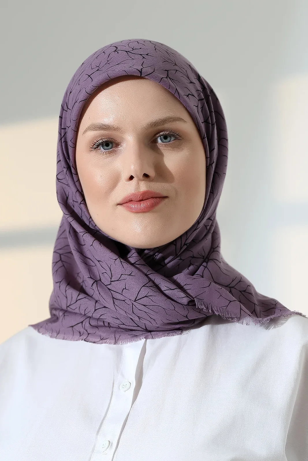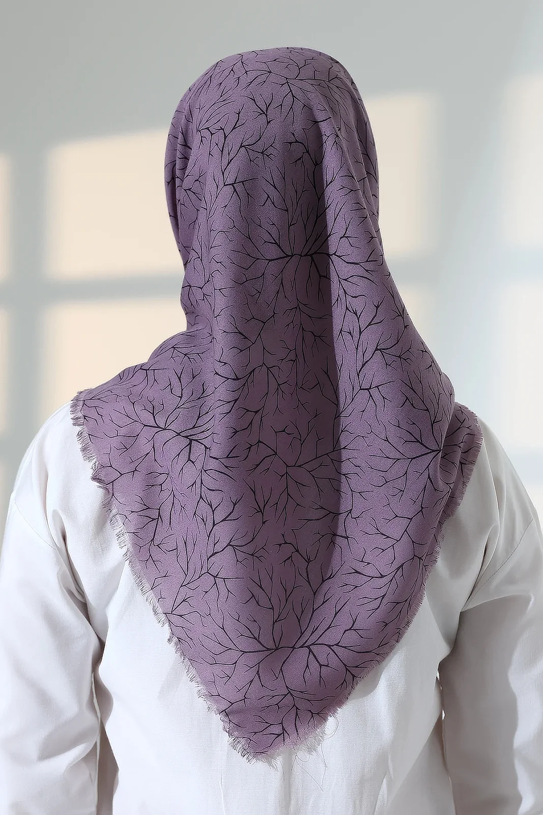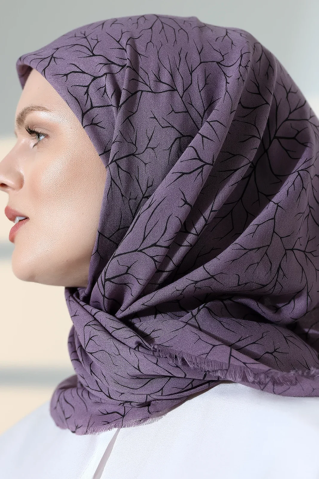 Ağaç Desenli Pamuklu Eşarp, Yumuşak Dokulu Flamlı Yazma Başörtüsü - Mor