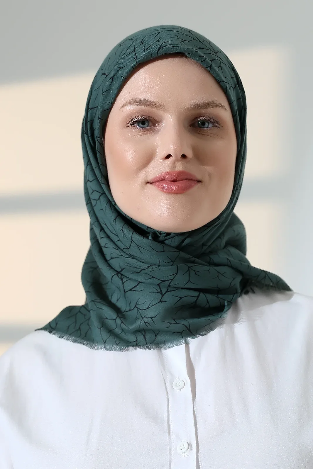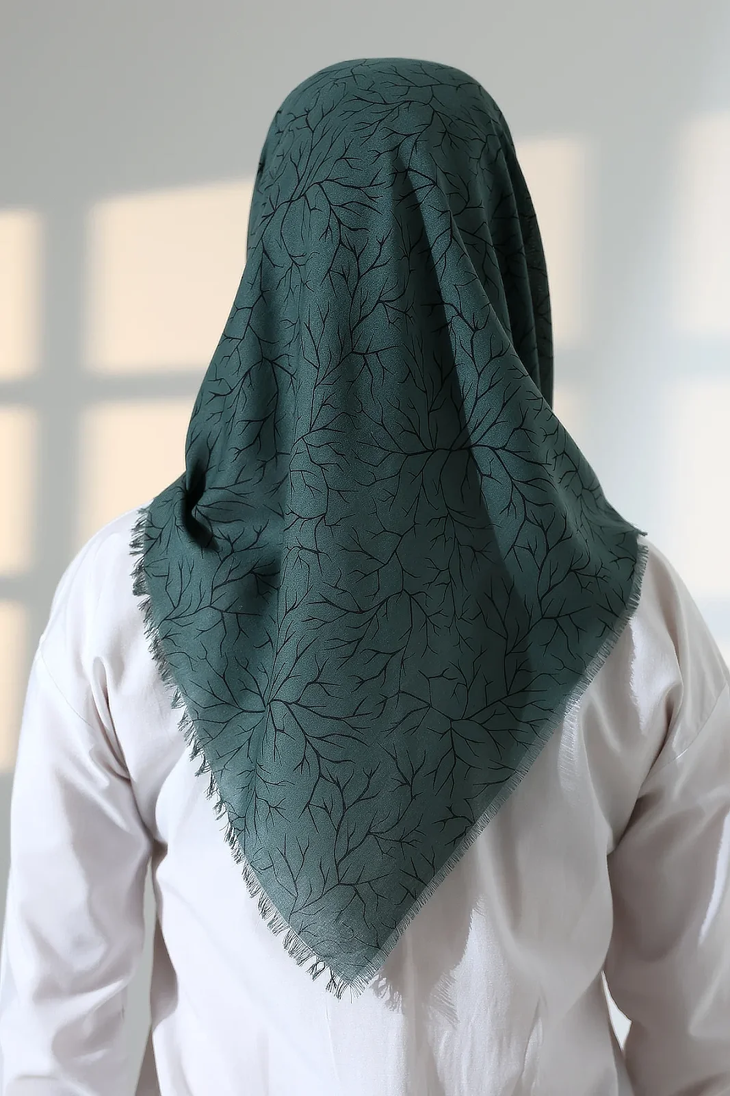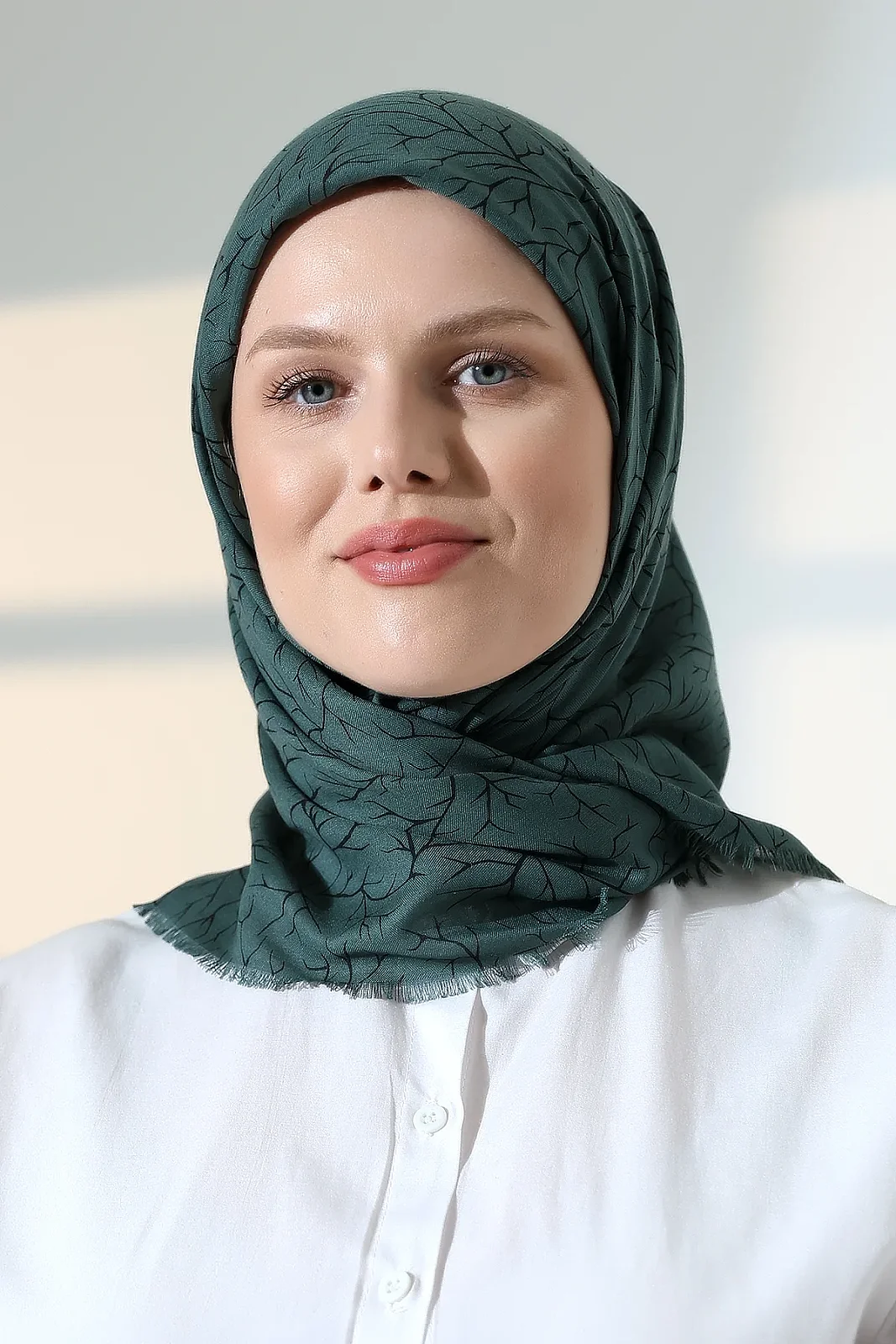 Ağaç Desenli Pamuklu Eşarp, Yumuşak Dokulu Flamlı Yazma Başörtüsü - Yeşil