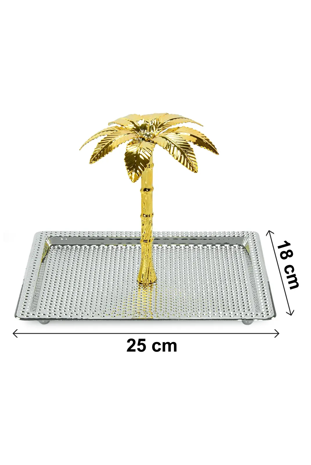 Modern ve zarif tasarımıyla öne çıkan ağaç kulplu dikdörtgen tepsi, hem günlük kullanımda hem de özel sunumlarda şıklığı ve pratikliği bir arada sunar. Gümüş renk parlak yüzeyi ve ortasında yer alan palmiye formundaki kulp detayı, ürünü dekoratif bir sunum parçası haline getirir.
