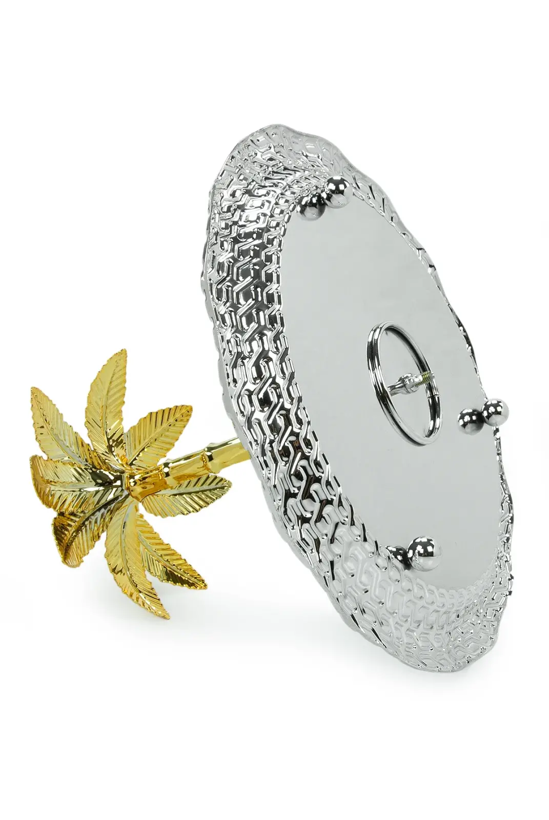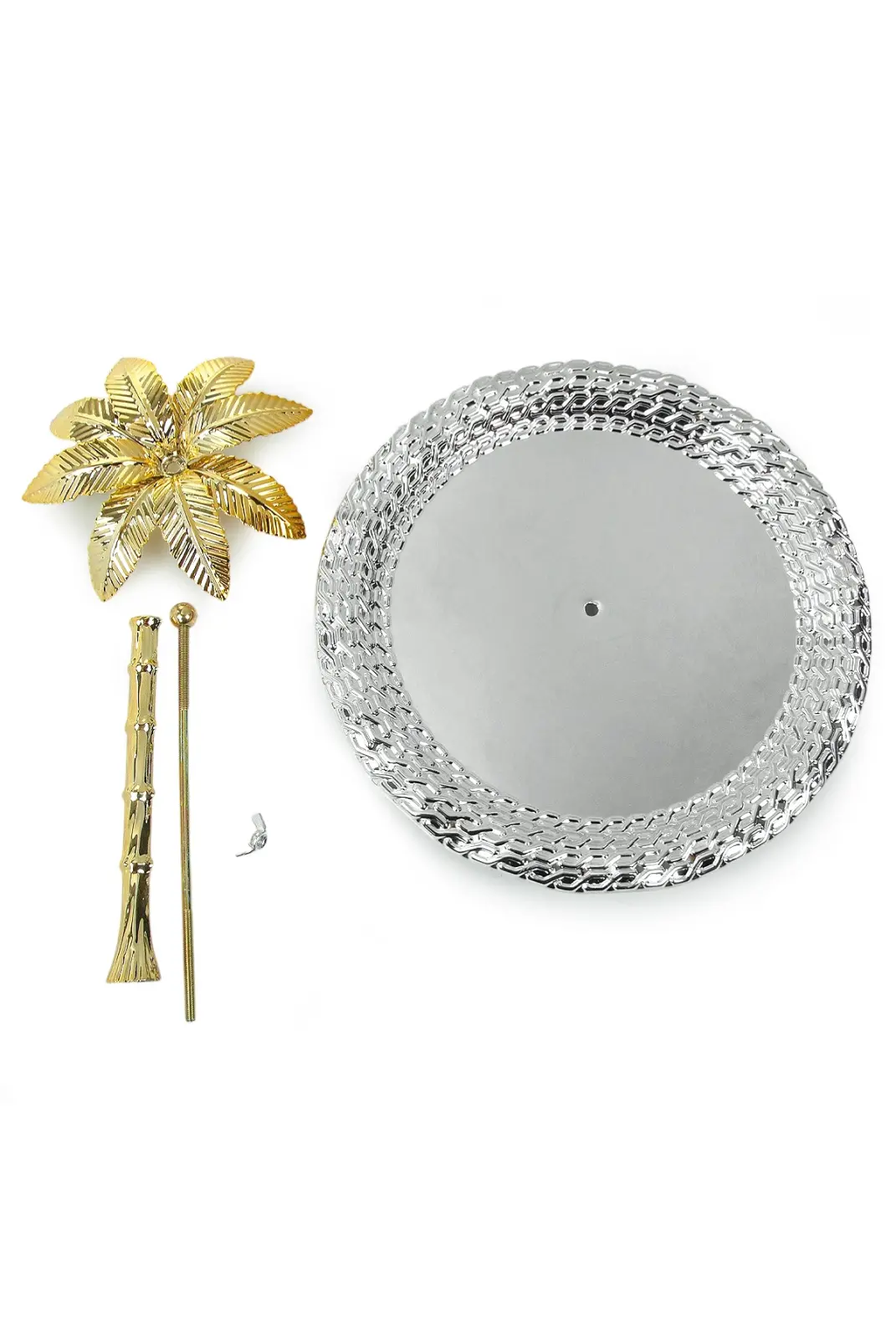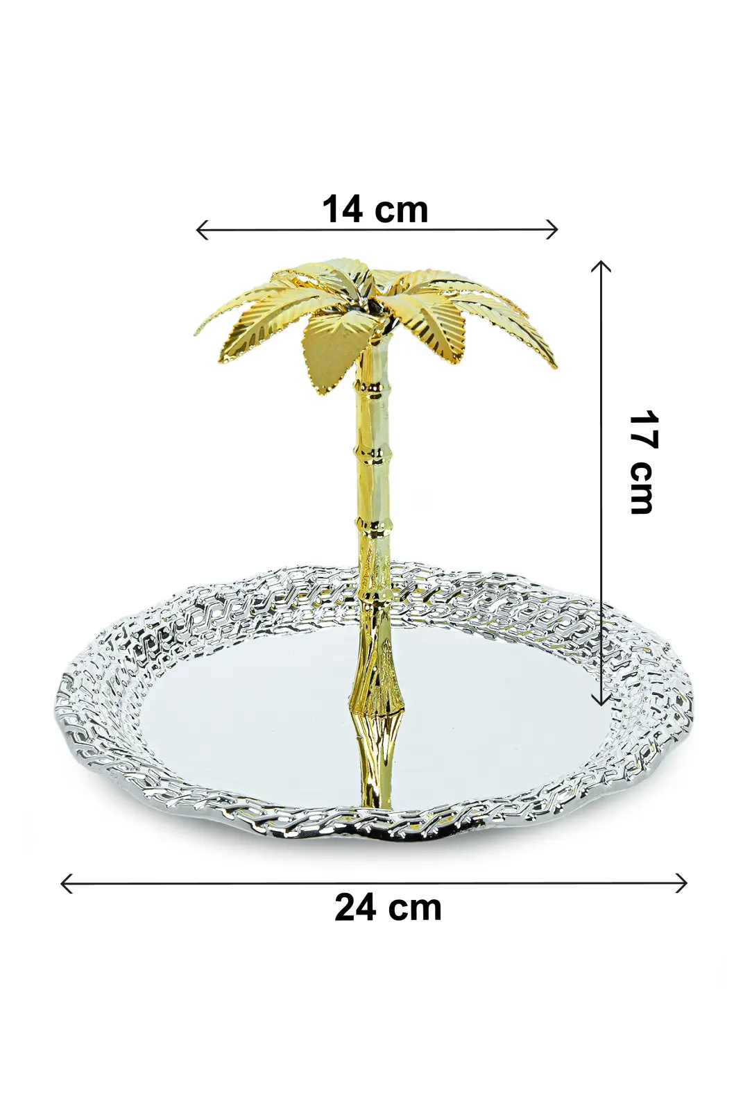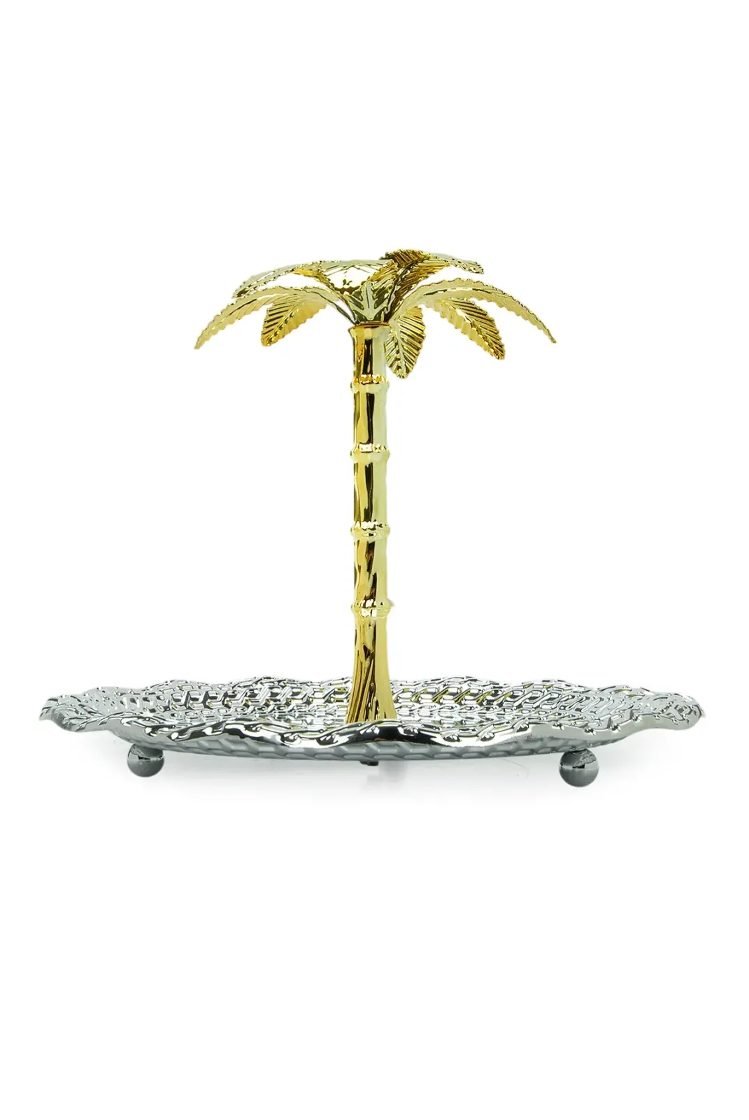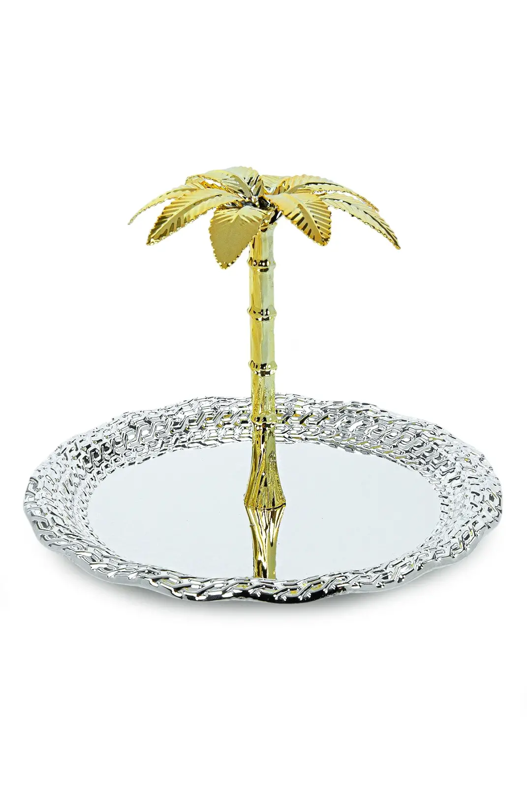 Zarif oval formu ve detaylı işçiliğiyle öne çıkan ağaç kulplu sunum tepsisi, sofralarınıza şıklık ve estetik katmak için tasarlanmıştır. Gümüş renk parlak yüzeyi ve kenar kısmındaki dekoratif desenler, ürüne premium bir görünüm kazandırırken ortasında yer alan palmiye formundaki kulp tasarımı dikkat çekici bir detay sunar.