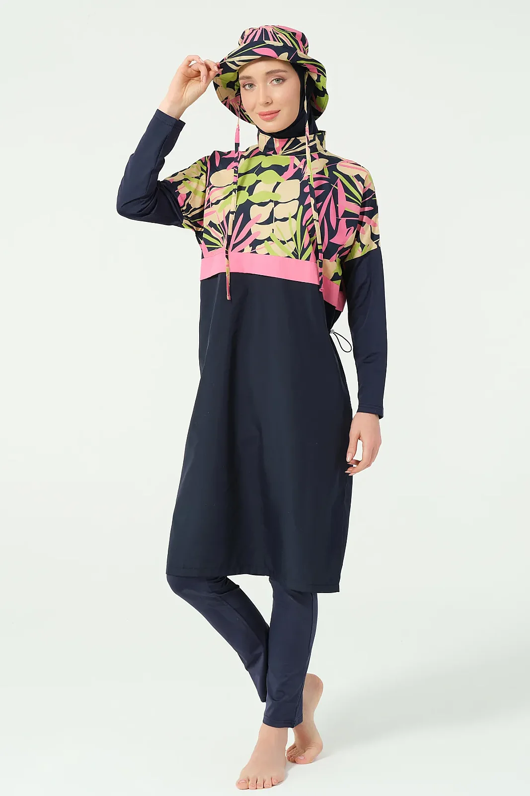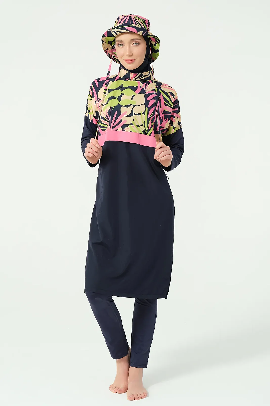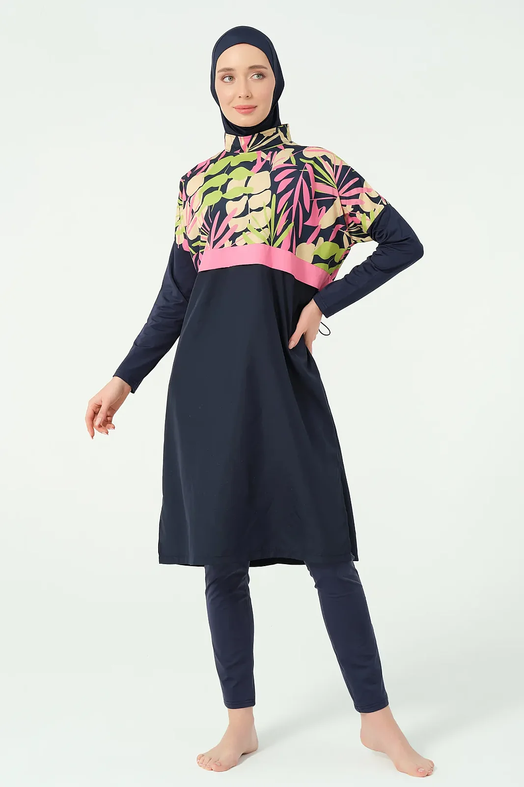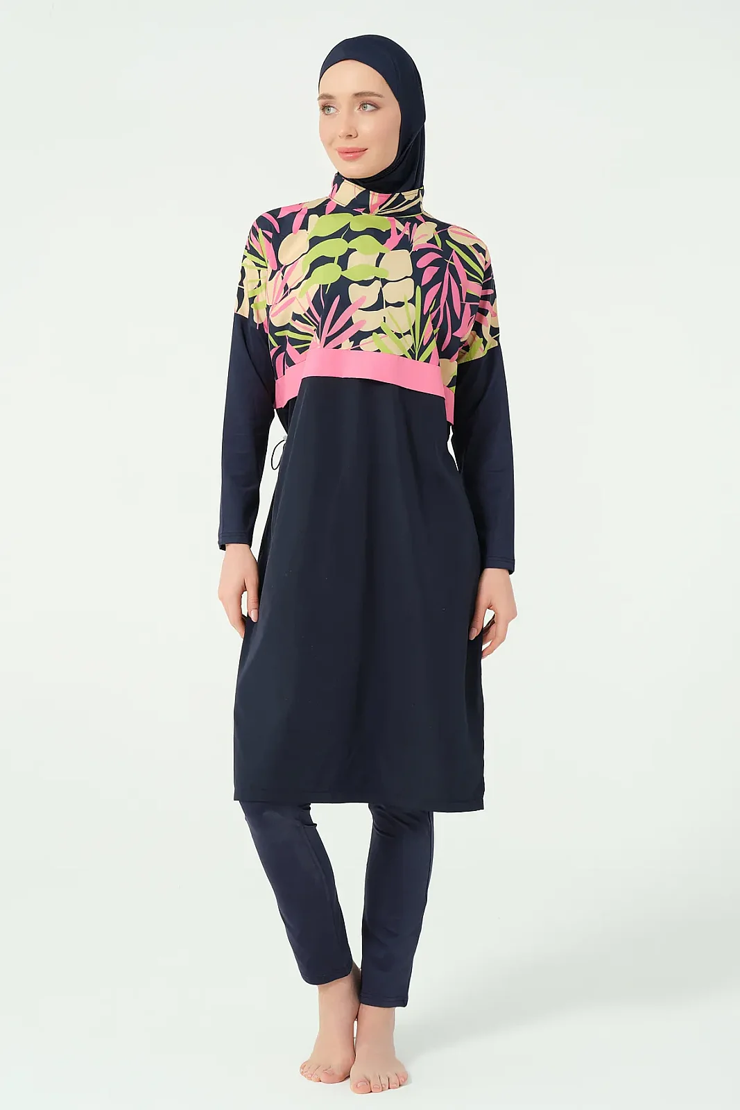 Alfasa’nın modern tasarım çizgisine sahip crop görünümlü tesettür mayo modeli, sade alt parça ve desenli üst kombinasyonu ile dikkat çeker. Rahat kesimi ve hafif yapısı sayesinde yaz sezonunda konforlu bir kullanım sunar.