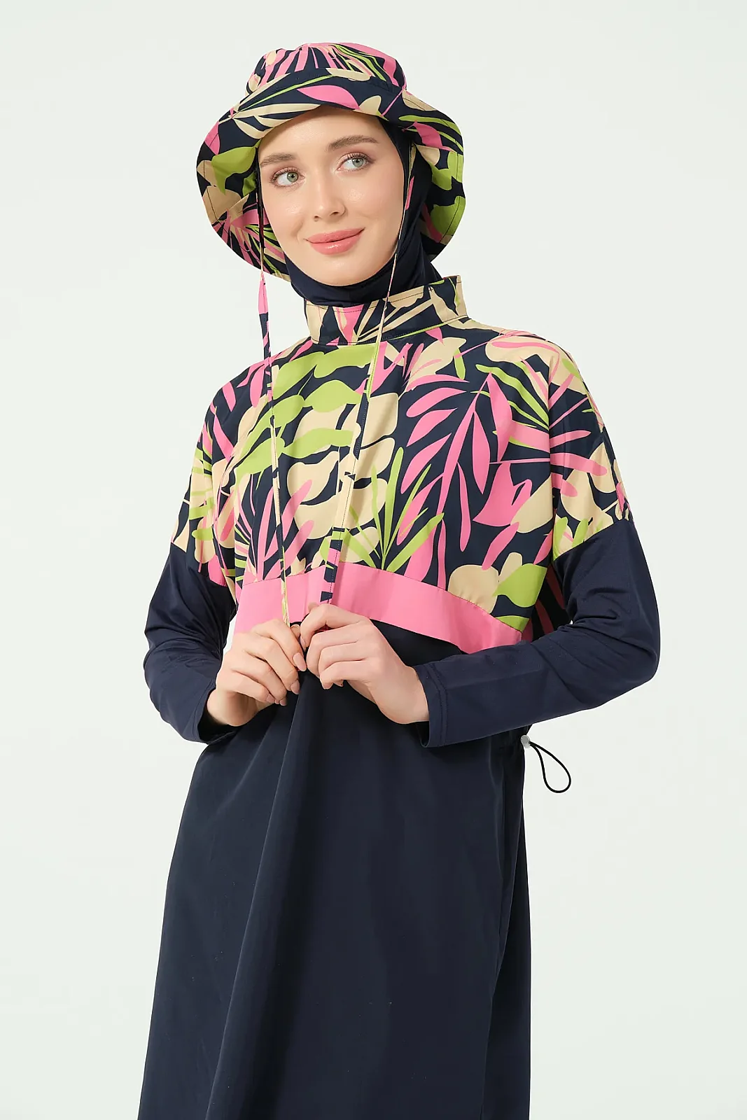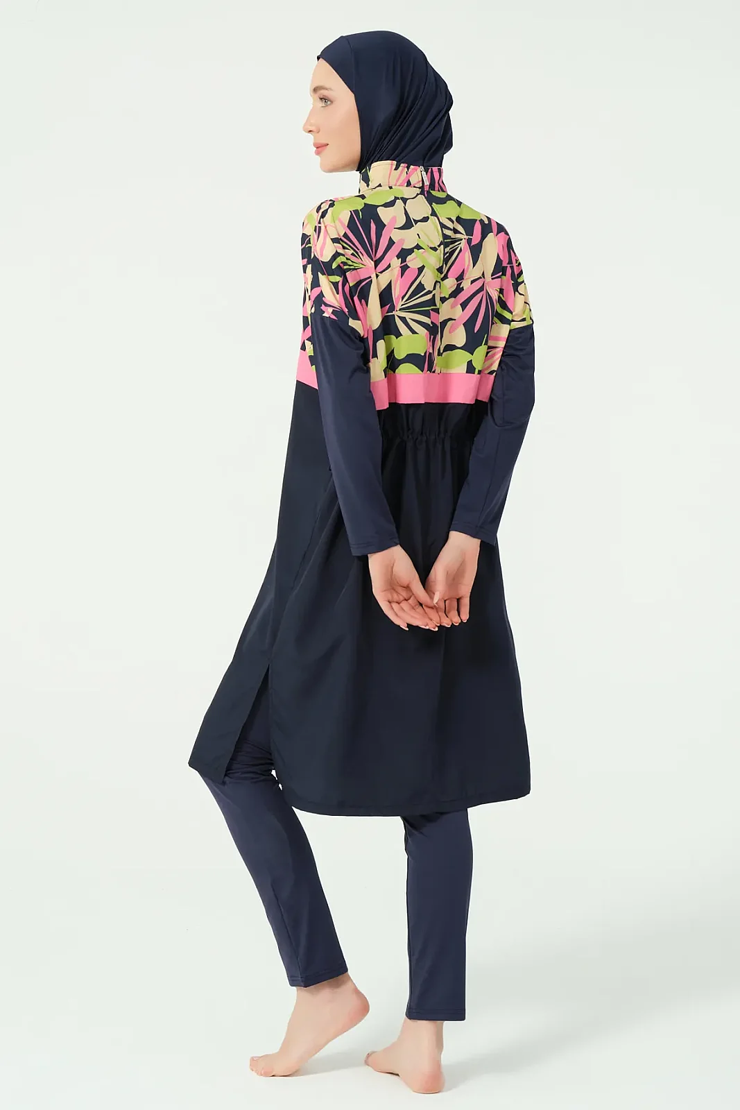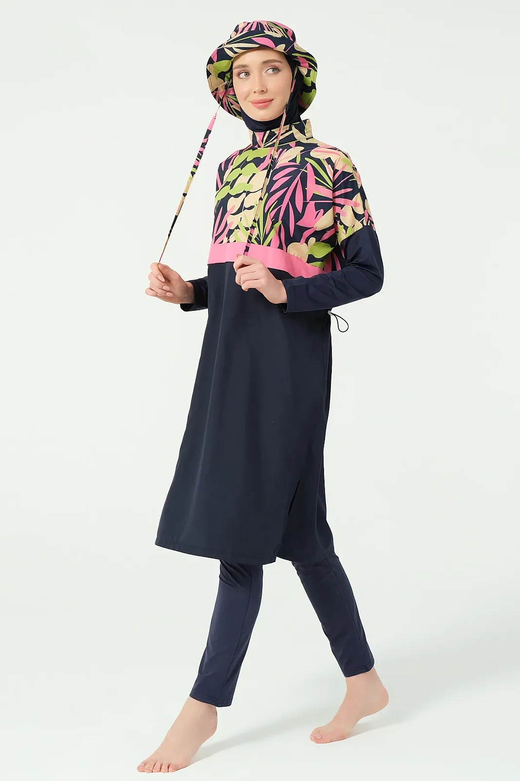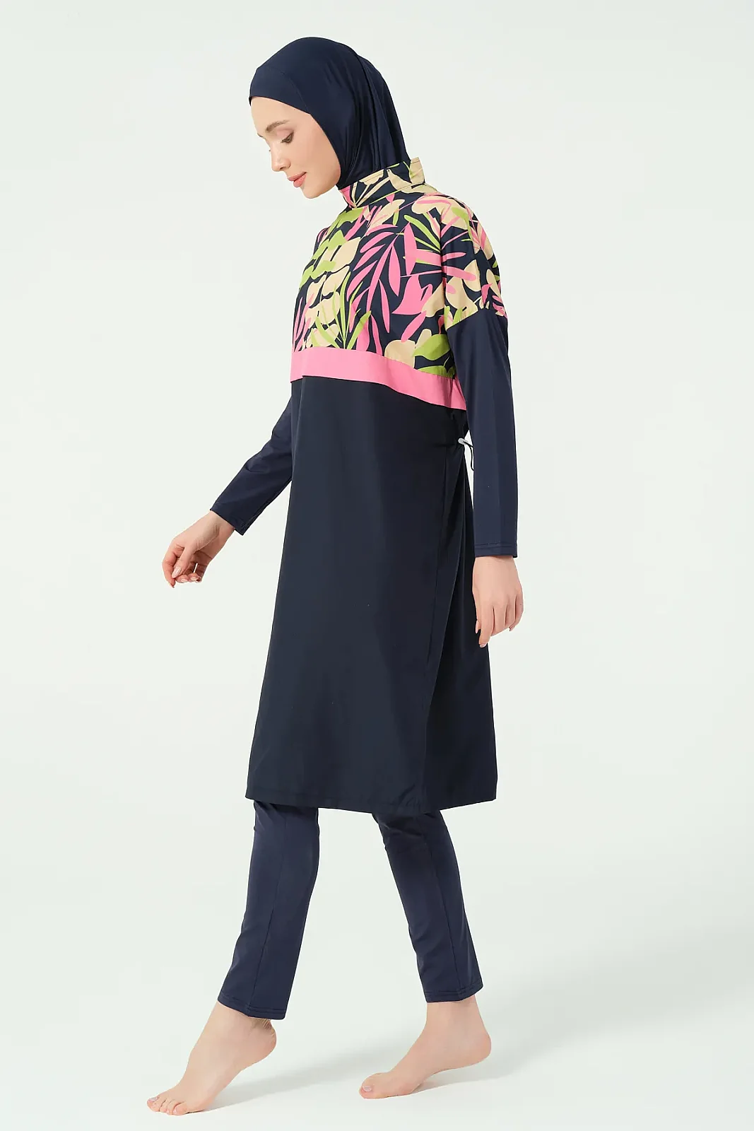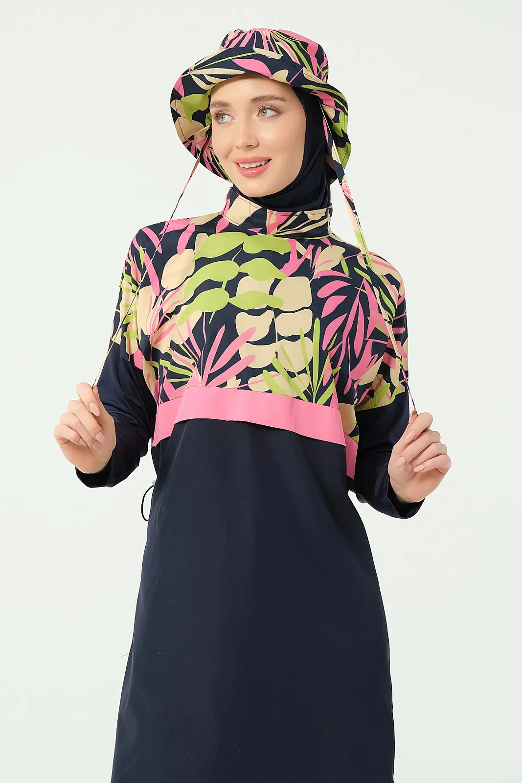 Alfasa’nın modern tasarım çizgisine sahip crop görünümlü tesettür mayo modeli, sade alt parça ve desenli üst kombinasyonu ile dikkat çeker. Rahat kesimi ve hafif yapısı sayesinde yaz sezonunda konforlu bir kullanım sunar.