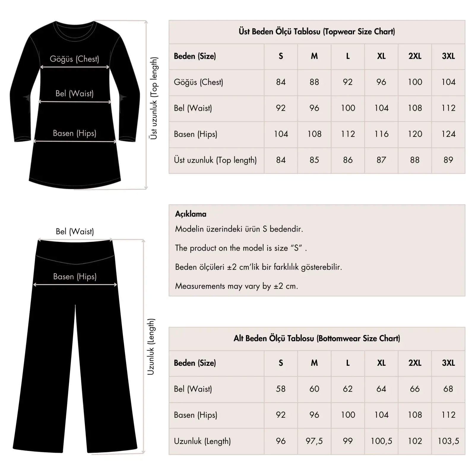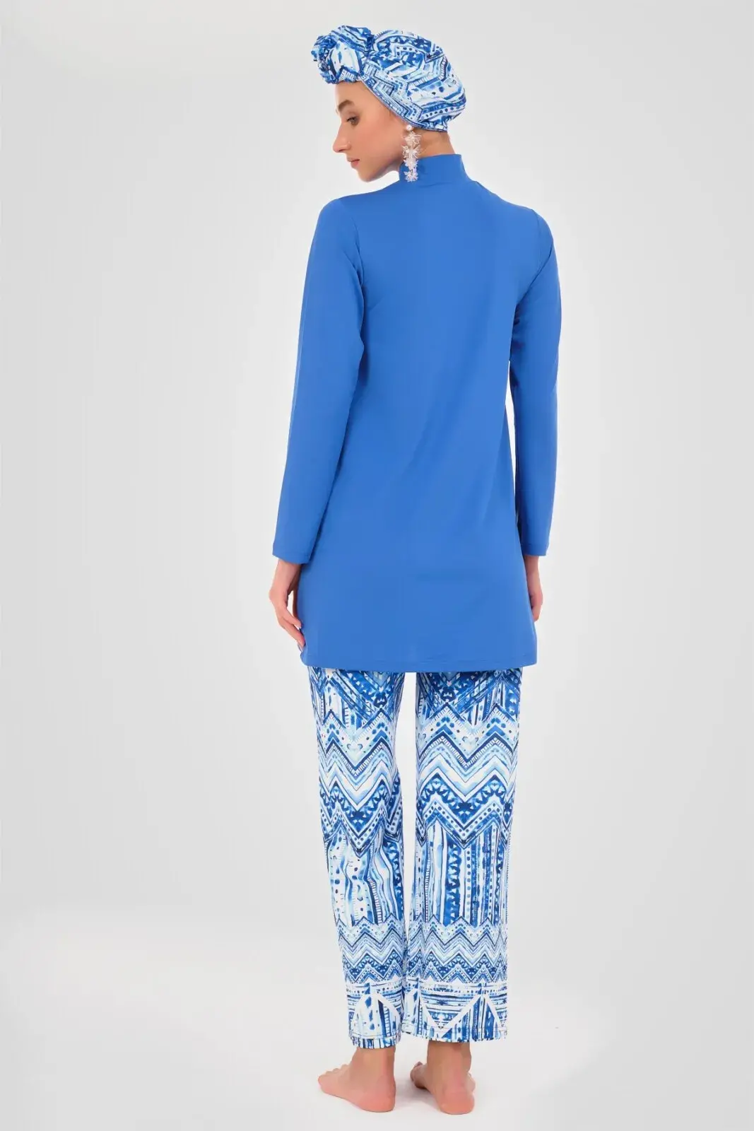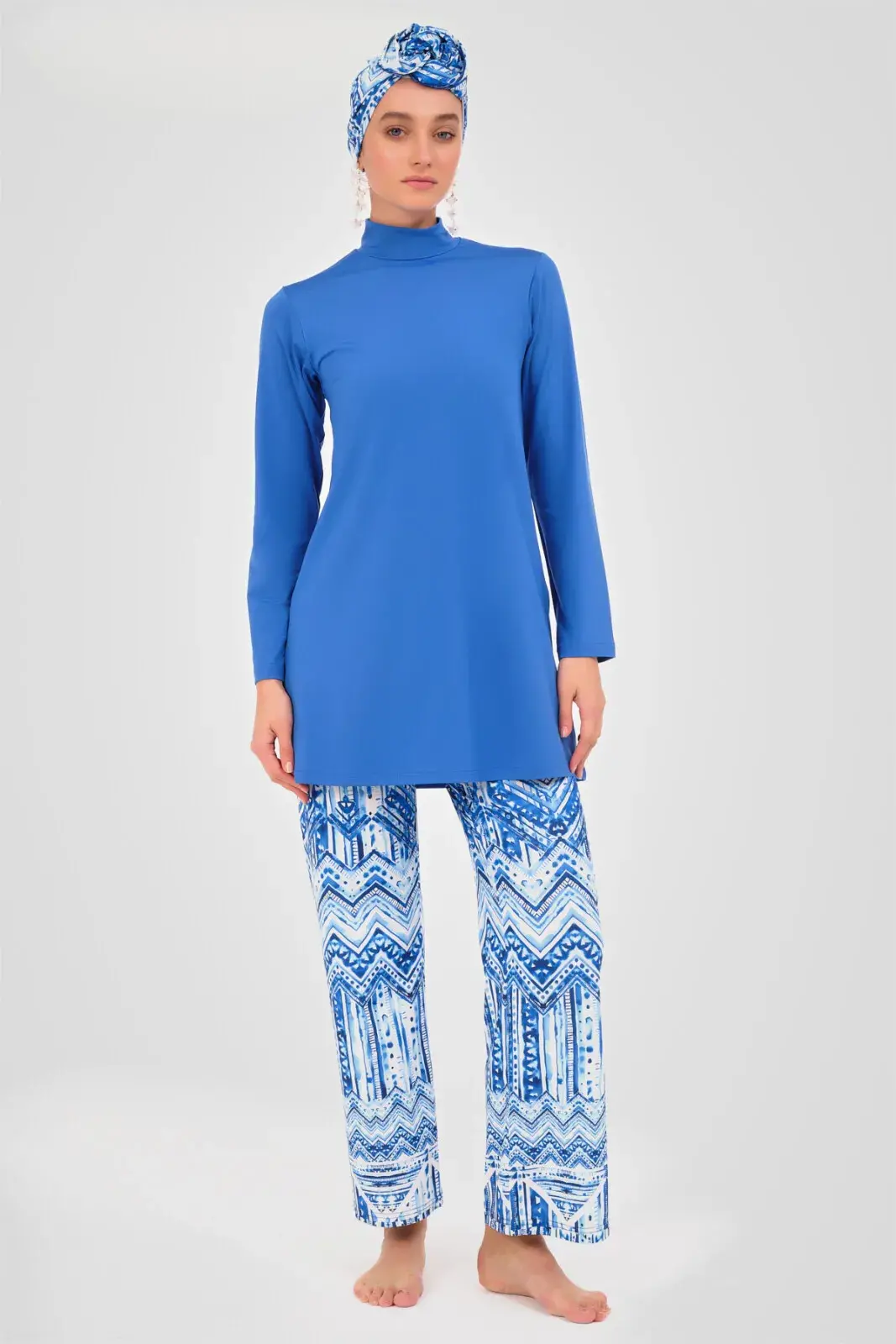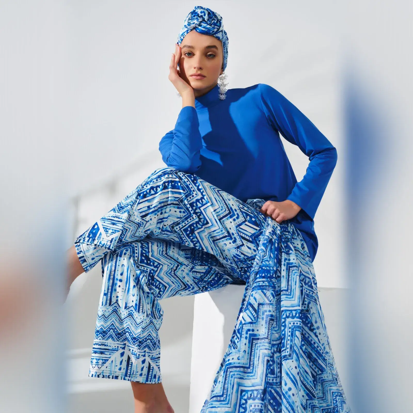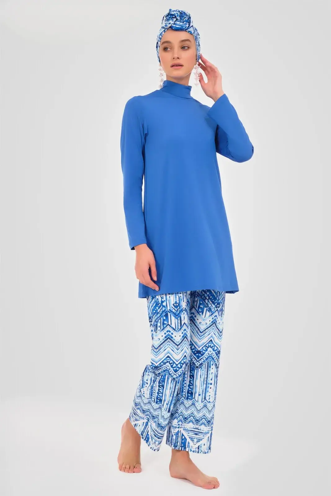 Suyu iten apreli likra kumaş. Üst klasik bol kalıp. Uzun kollu. Dik yaka. Bol paça desenli pantolon. Tek parça iç çamaşır. Desenli üçgen eşarp ve bone.