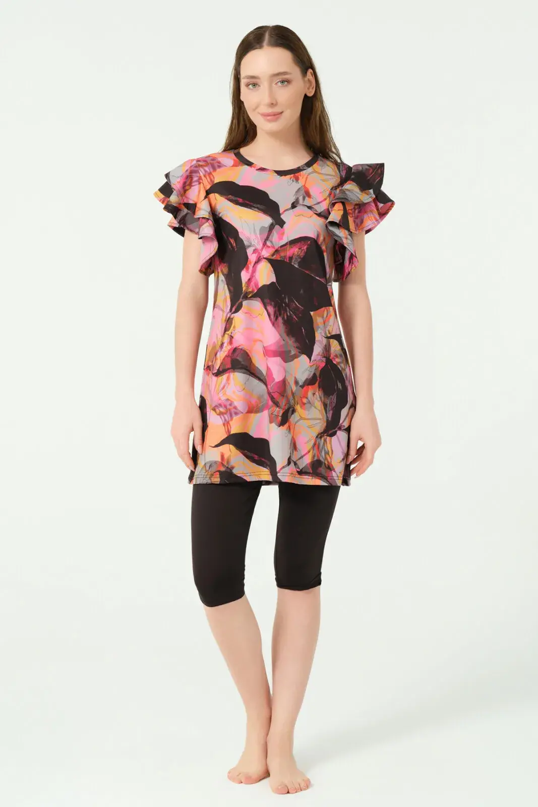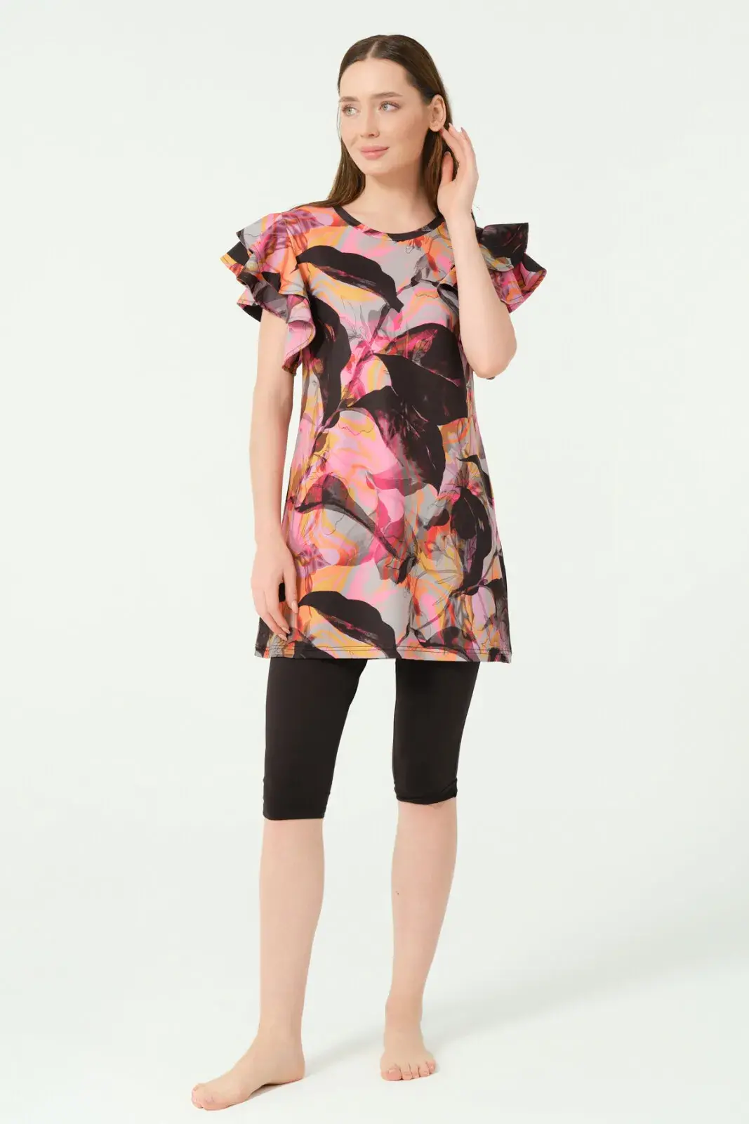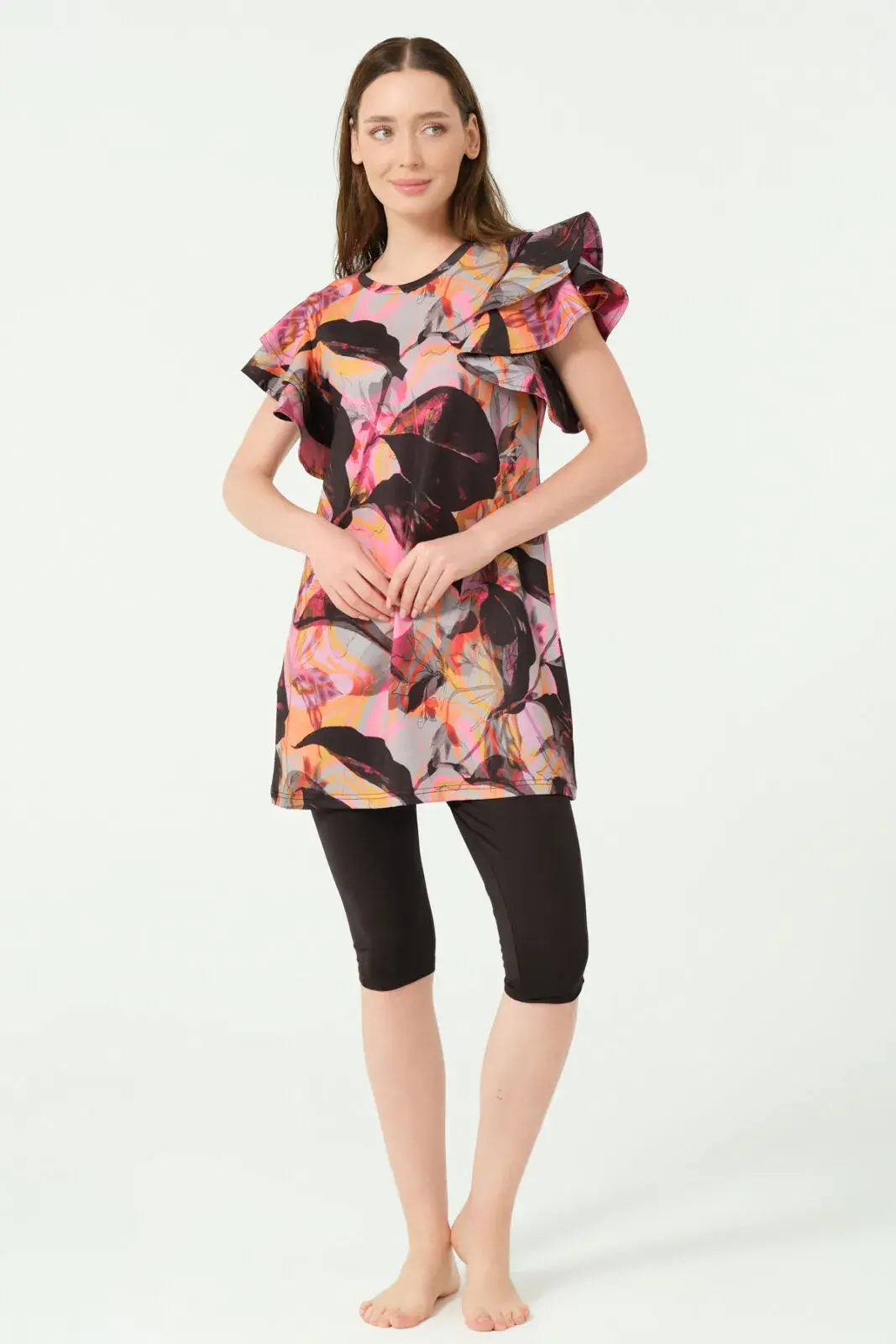 Üst: Desenli, paraşüt volan detaylı kısa kol, bisiklet yaka