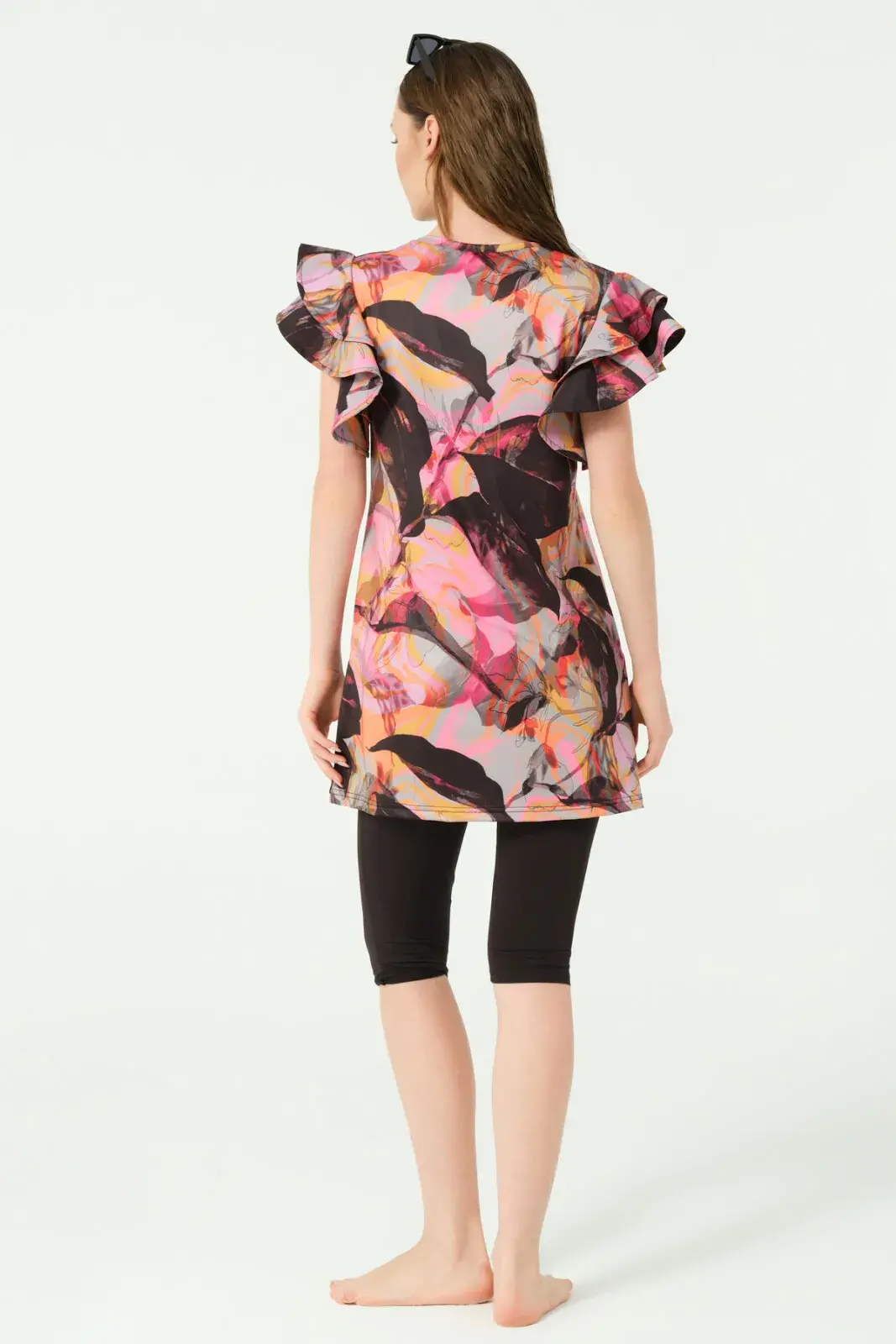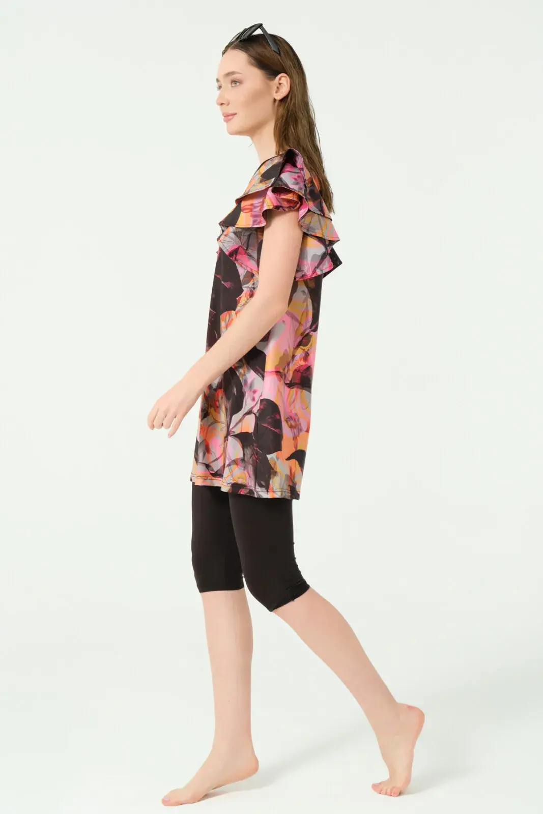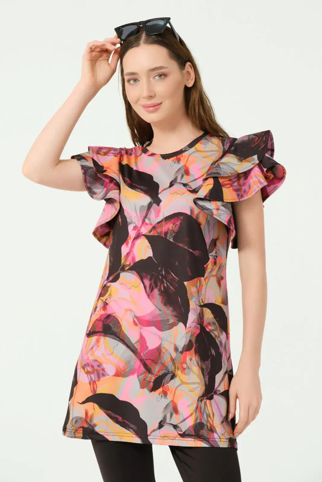 Üst: Desenli, paraşüt volan detaylı kısa kol, bisiklet yaka