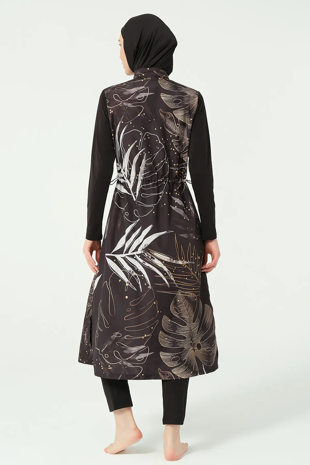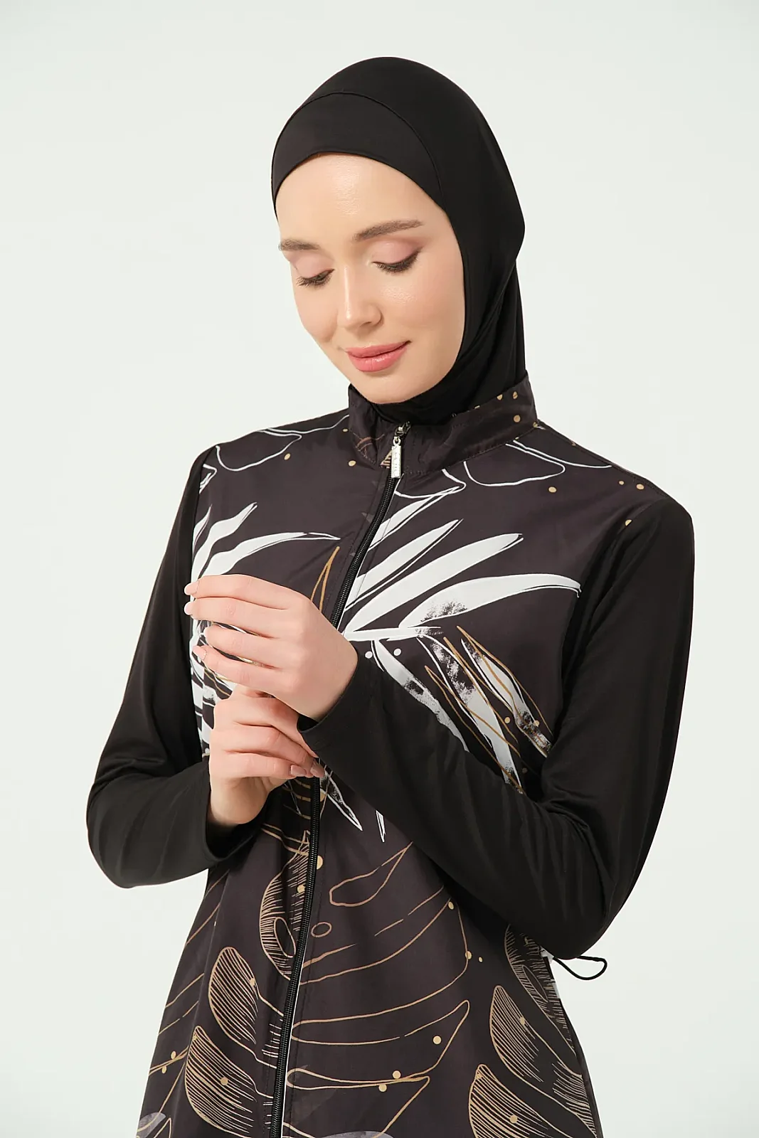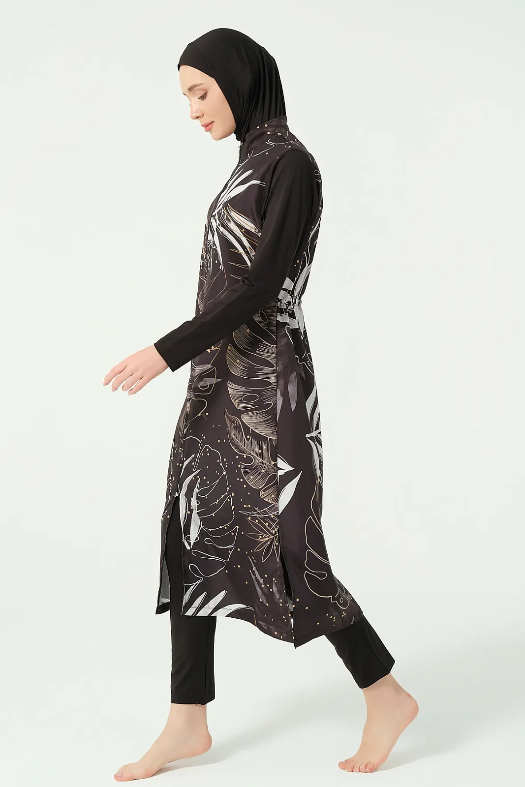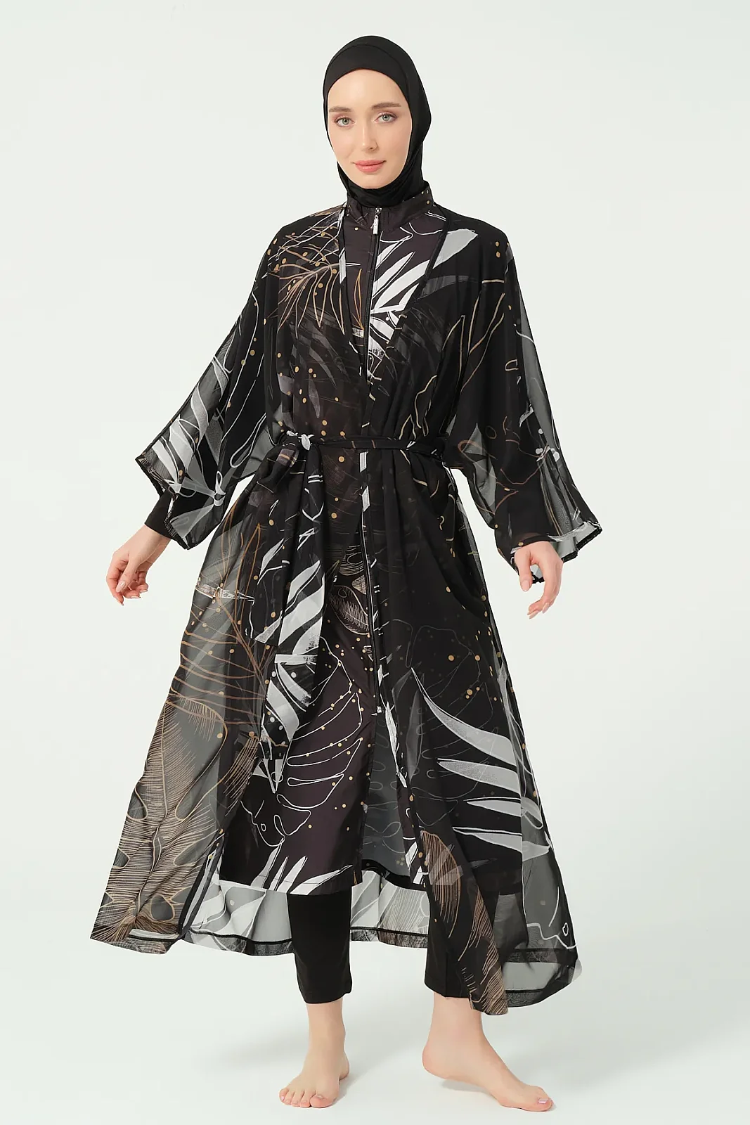Gold detaylı modern desenleri ve akışkan dış katman tasarımı ile öne çıkan bu tesettür mayo modeli, klasik mayo formunun dışına çıkarak şık ve dikkat çekici bir stil sunar. Siyah zemin üzerine işlenen gold desenler, ürüne sofistike bir görünüm kazandırır.