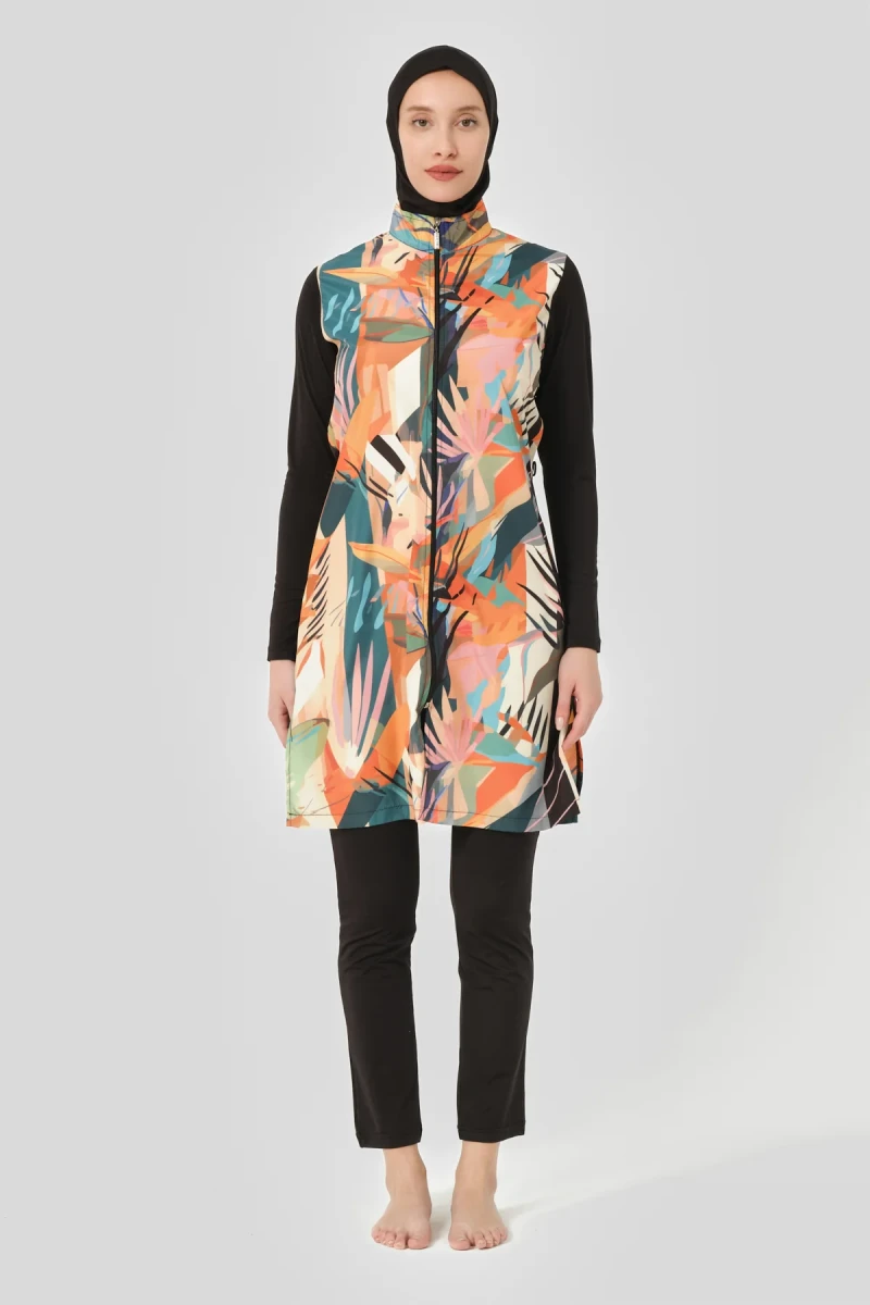Üst, Tayt, Eşarp, Bone, Tek parça iç çamaşırı olmak üzere 5 parçadan oluşmaktadır. Hızlı kuruma, kolay yüzme olanağı sağlar.