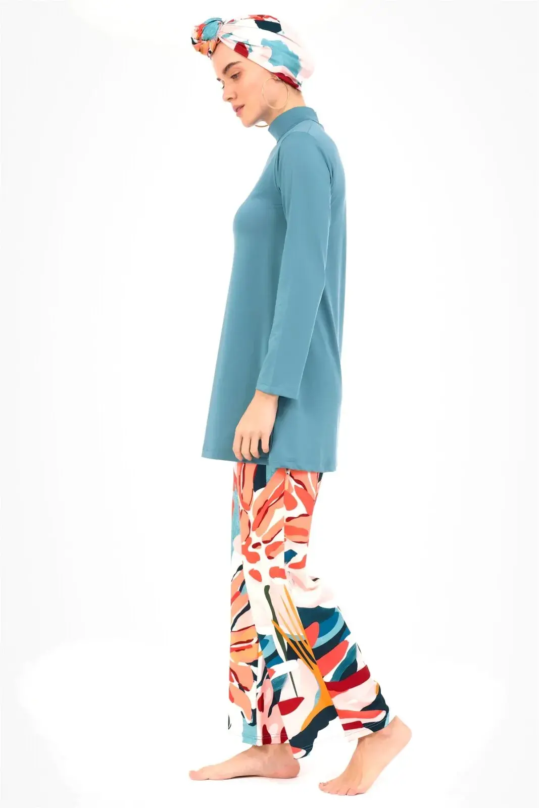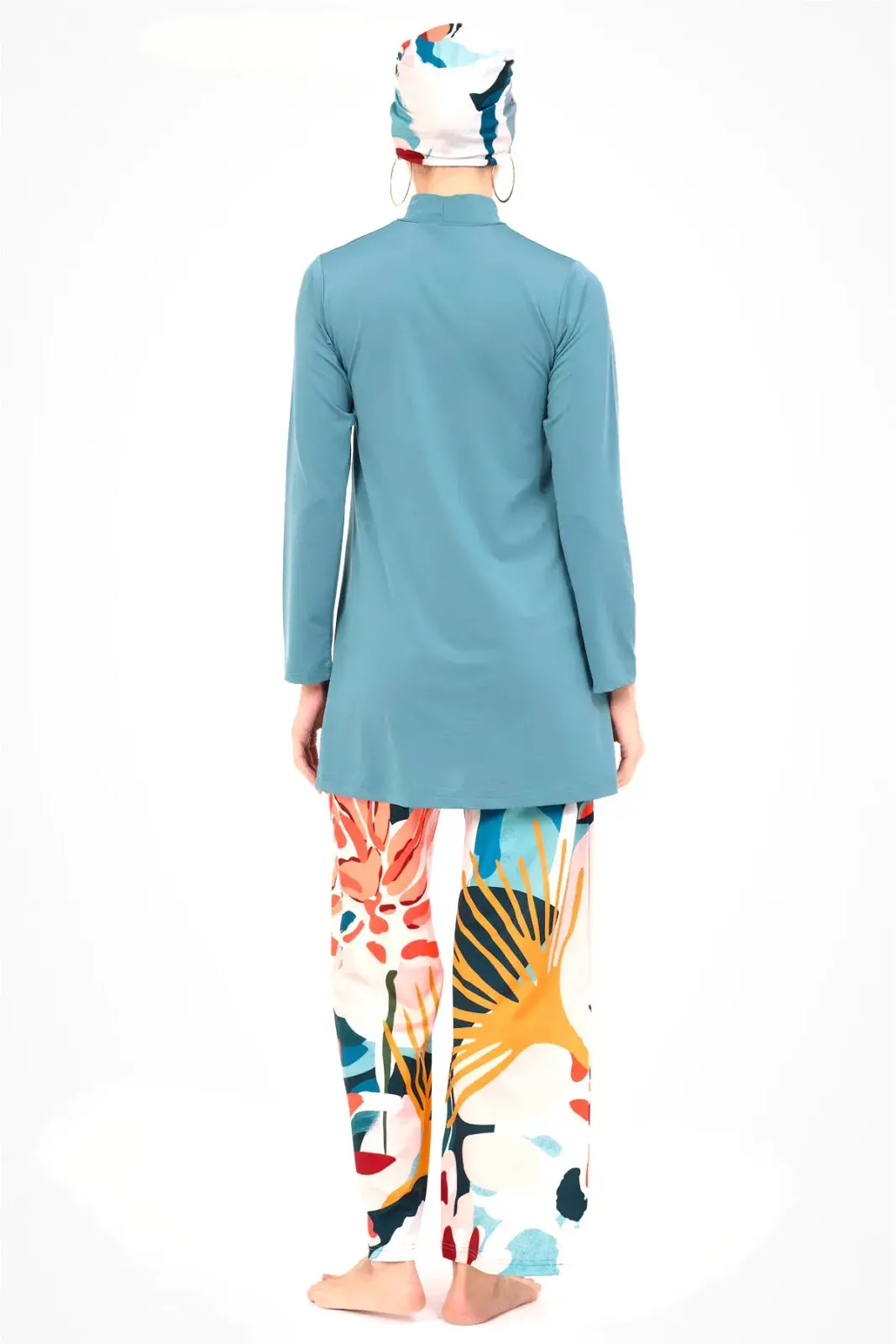 Su itici: Suyu iten apreli likra kumaş. Üst klasik bol kalıp. Uzun kollu. Dik yaka. Bol paça desenli pantolon. Tek parça iç çamaşır. Desenli üçgen eşarp ve bone.