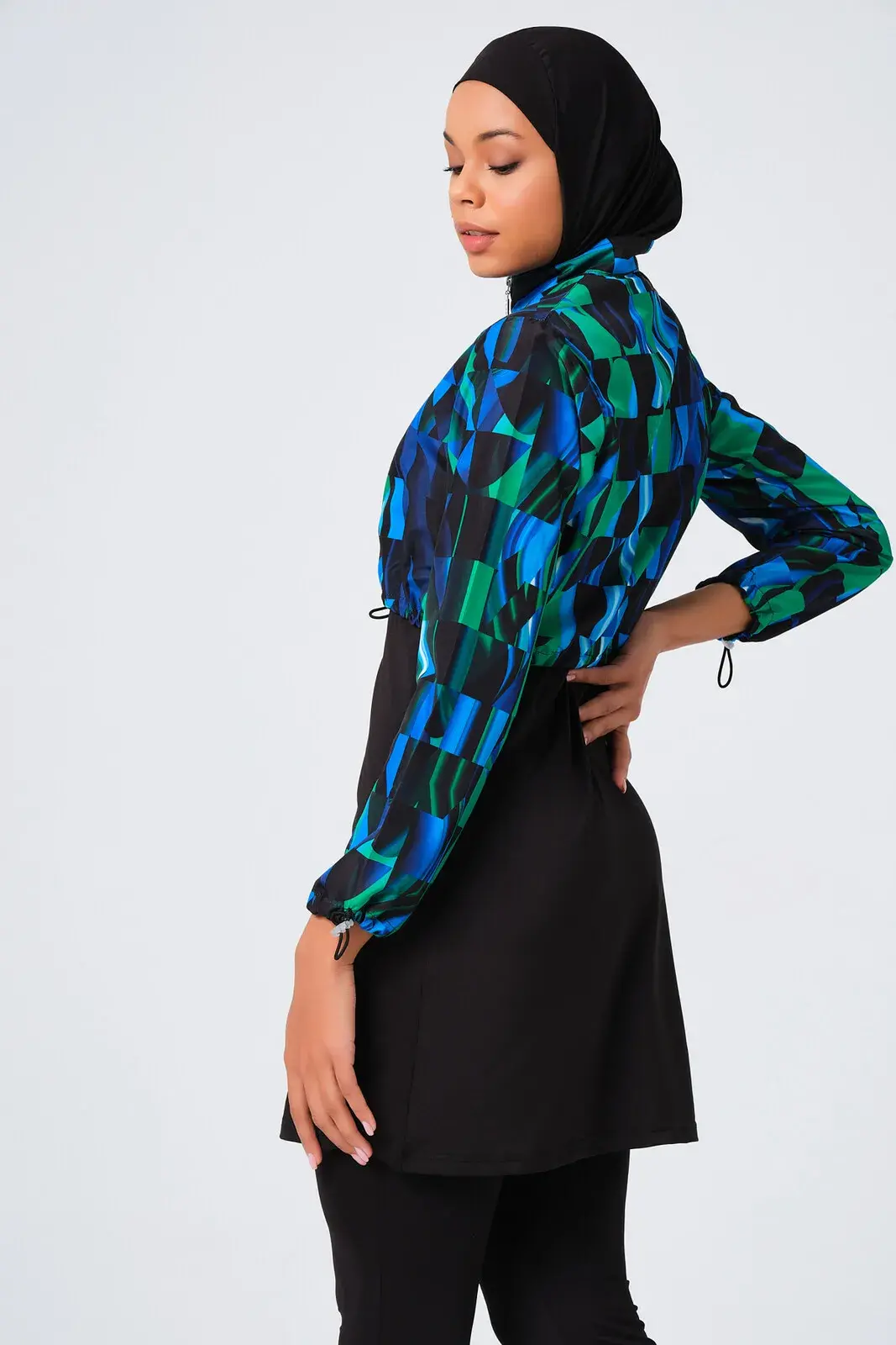 Water repellent finish. The top consists of two parts; Solid color zero sleeves. Bicycle collar. Top cropped pattern. Parachute fabric. Front zipper closure. Lycra tights. One-piece underwear. Patterned triangle scarf and bonnet.