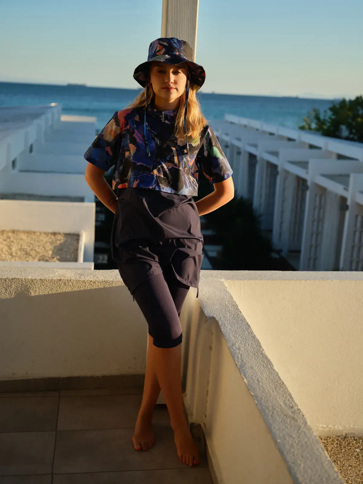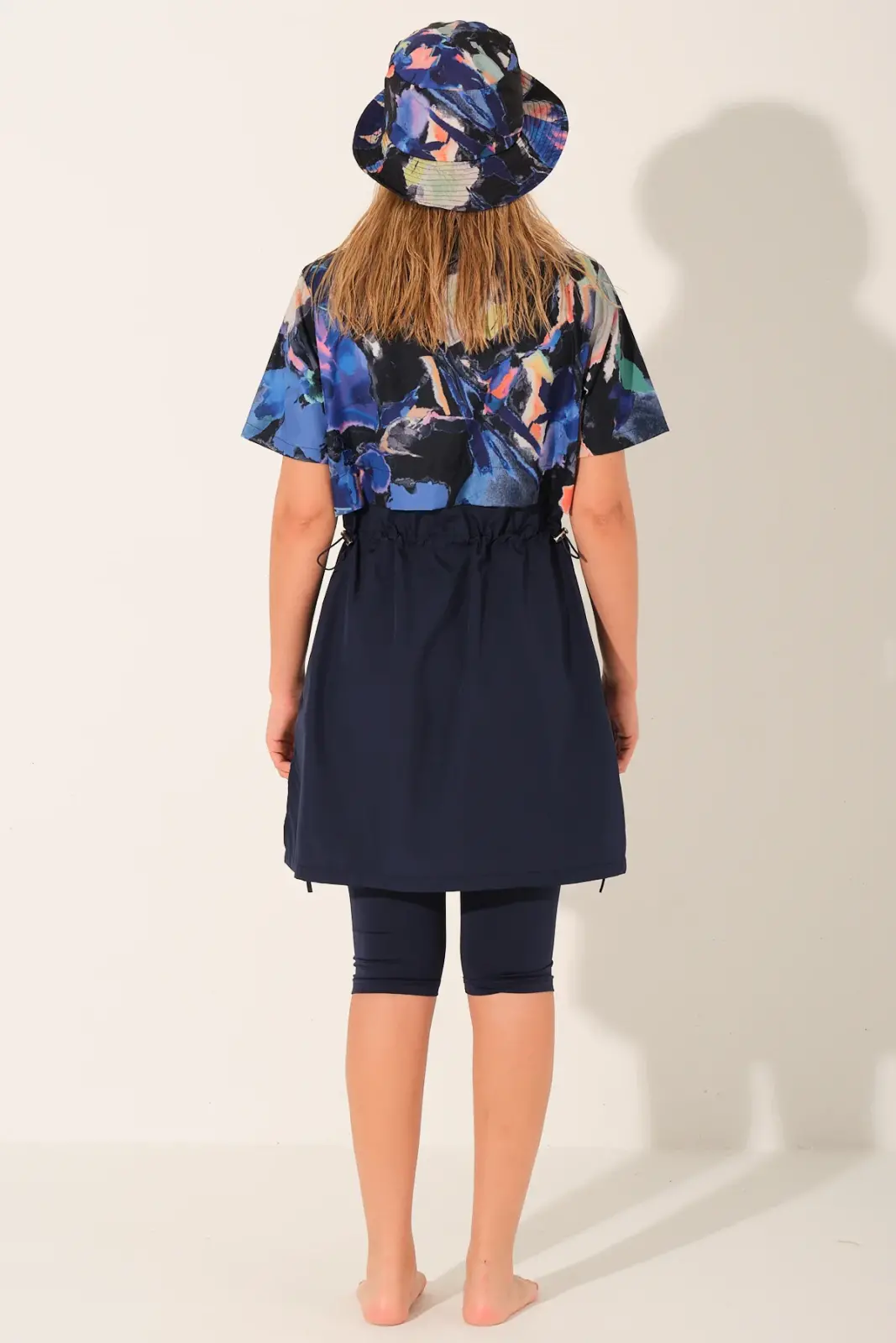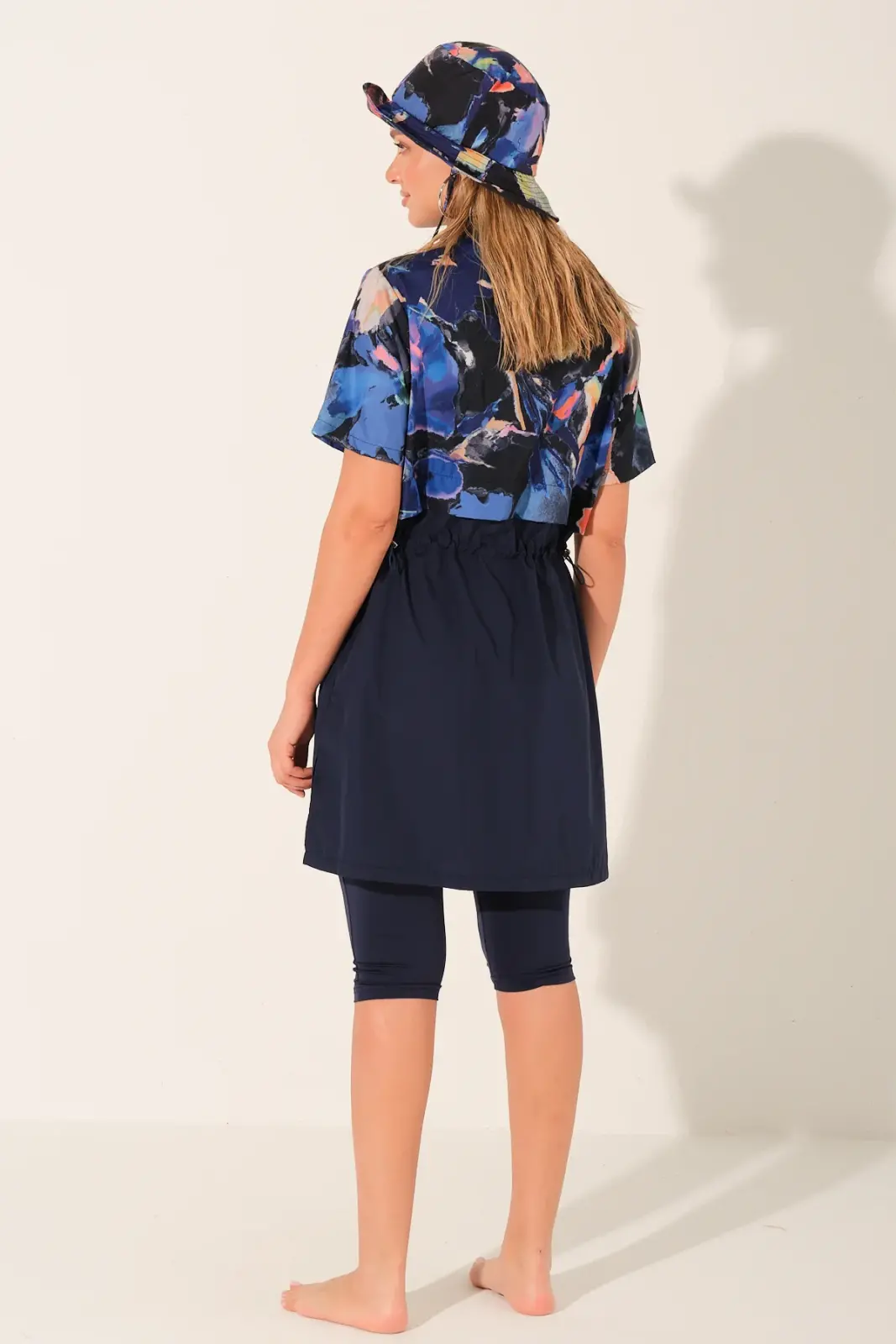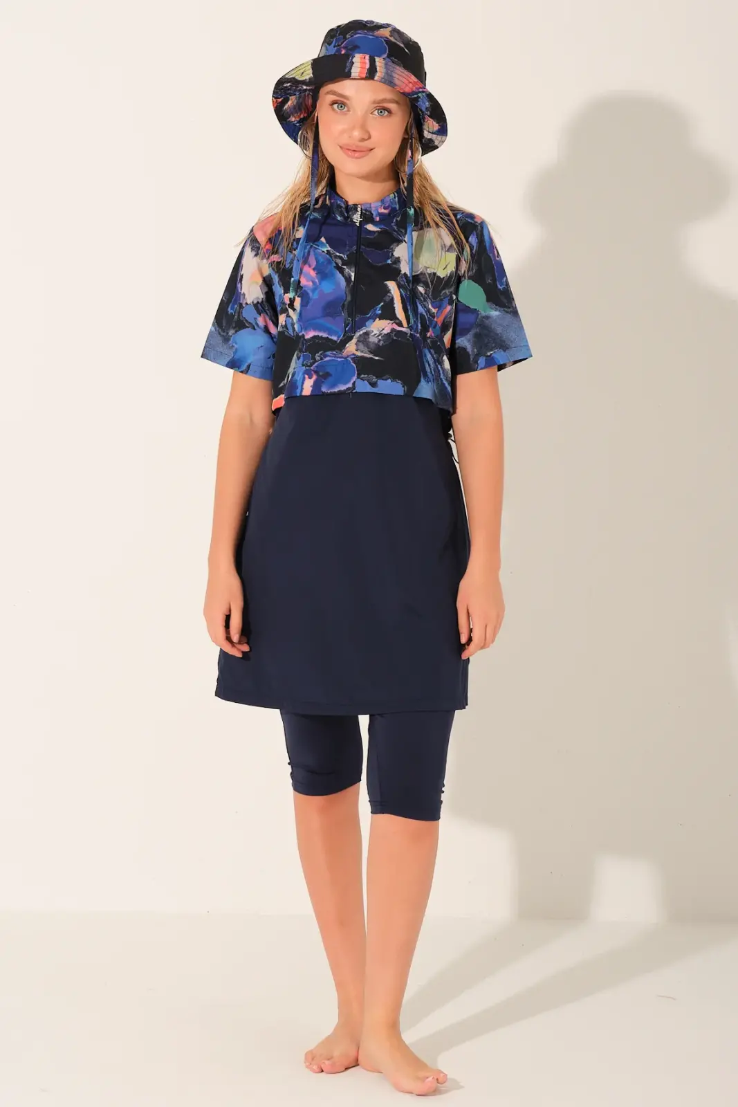 Modern çizgileri ve dinamik tasarımıyla dikkat çeken bu yarı kapalı tesettür mayo, lacivert zemin üzerine renkli desenli üst parçası ile sportif ve şık bir görünüm sunar. Crop görünümlü tasarımı sayesinde klasik mayolardan ayrılarak daha genç ve trend bir stil oluşturur.