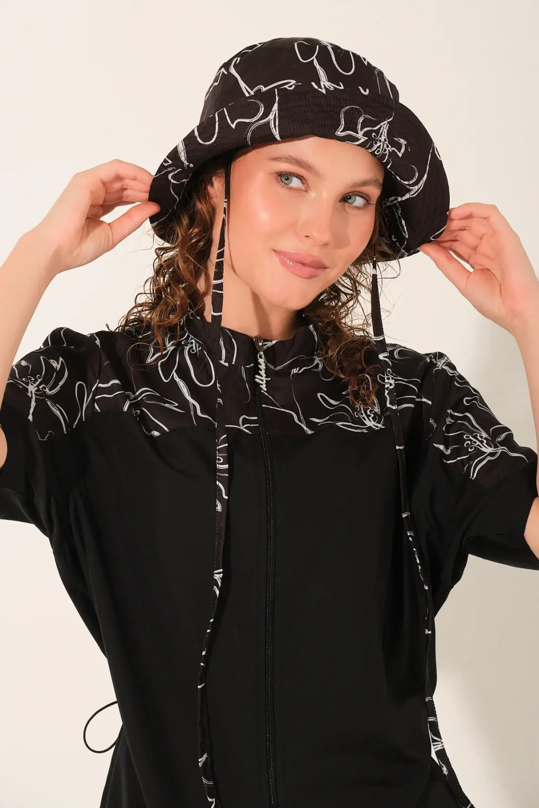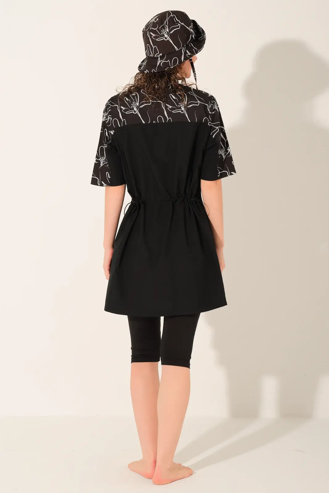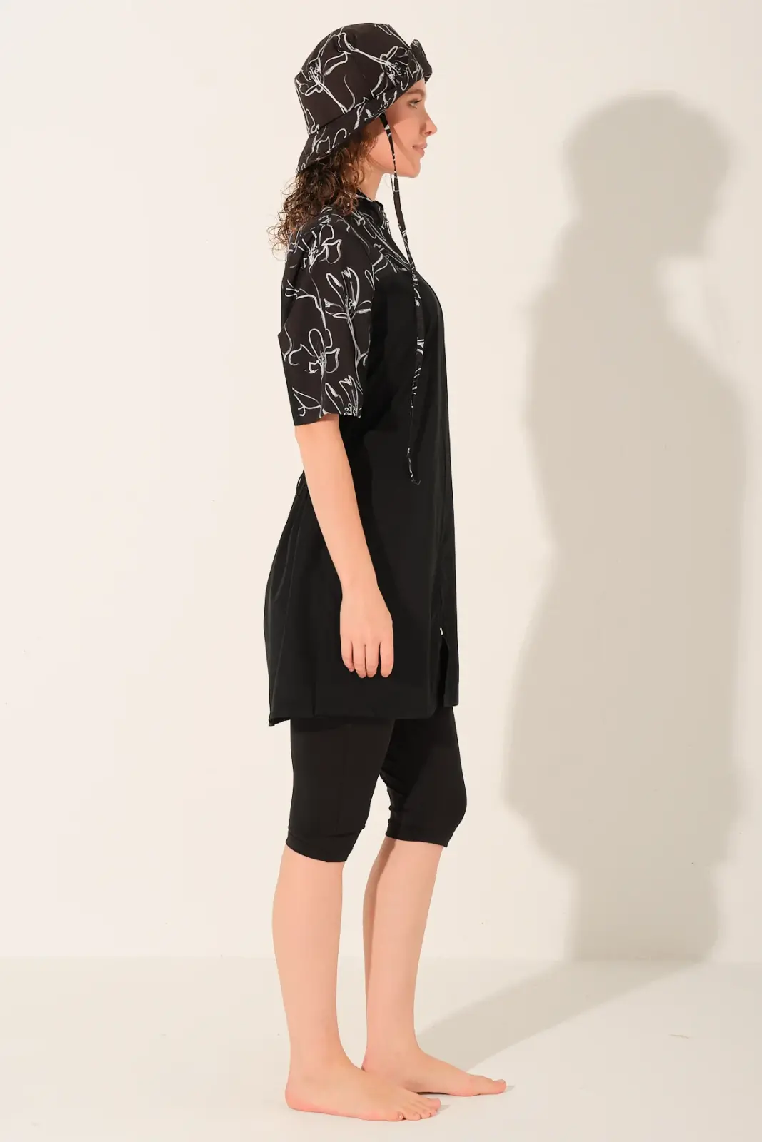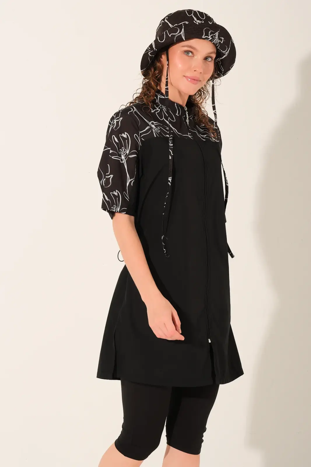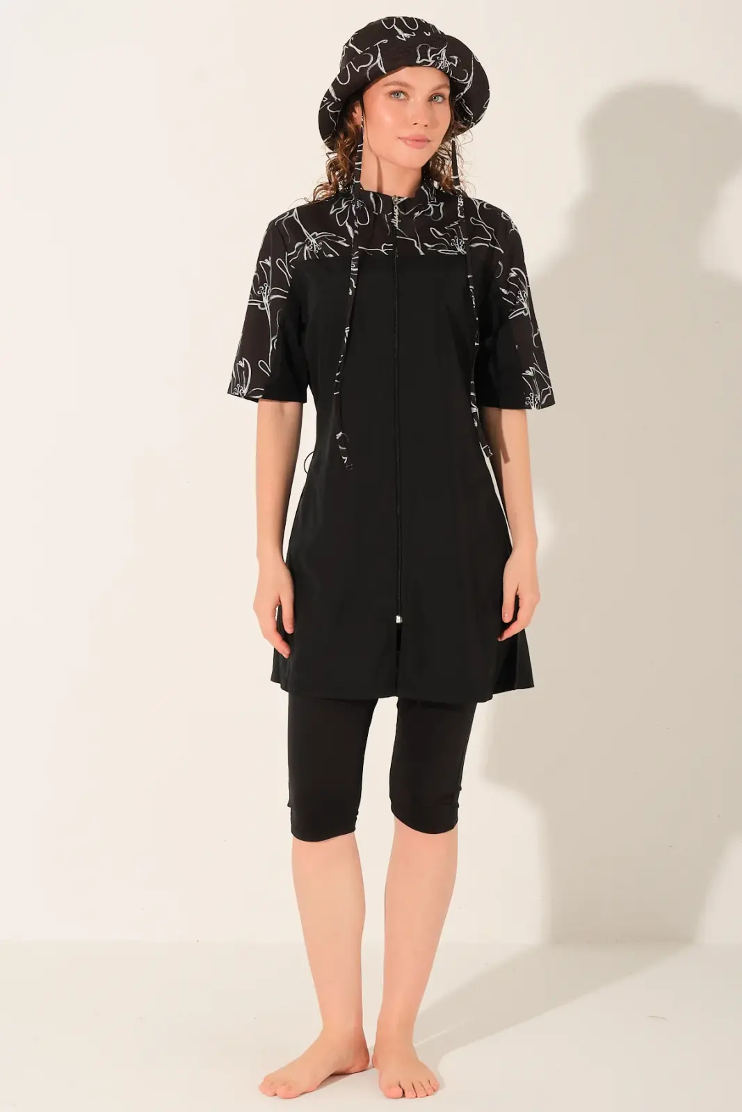 Modern çizgi detaylarıyla hareket kazanan bu yarı kapalı tesettür mayo, sade şıklığı ve fonksiyonel tasarımı bir arada sunar. Siyah zemin üzerine yer alan desenli üst bölümü ile klasik görünümden ayrılarak daha dinamik bir stil oluşturur.