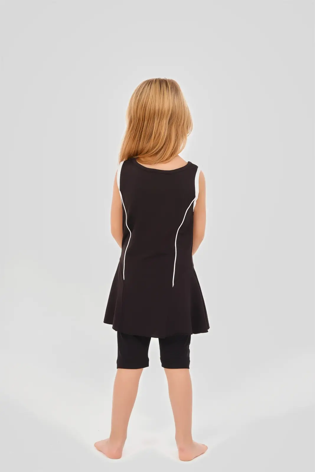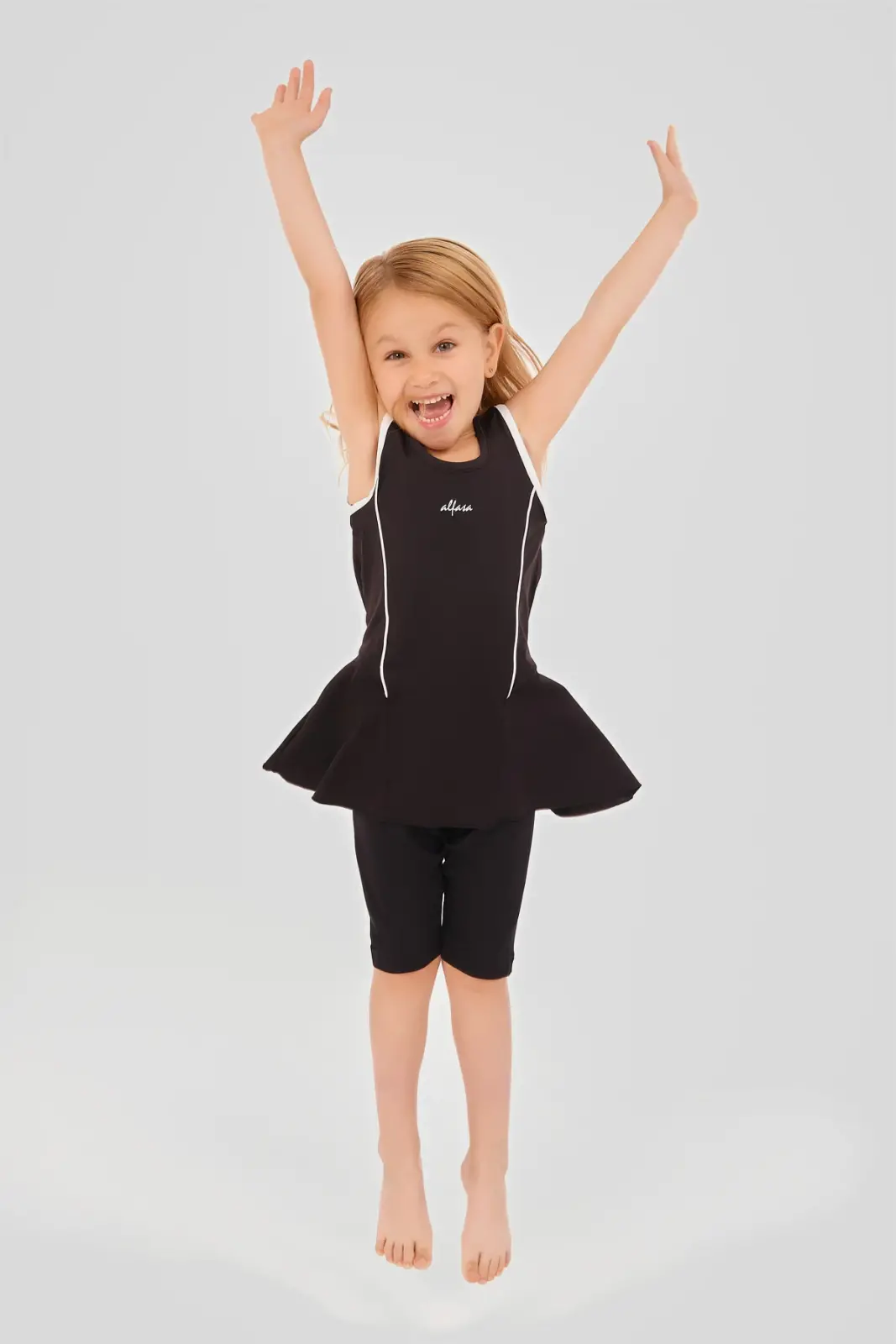 Sade ve modern çizgilere sahip bu siyah çocuk mayo, minimal tasarımıyla öne çıkan, rahat ve kullanışlı bir yüzme ürünüdür. Üst kısmı elbise formunda tasarlanmış olup altındaki şort ile birlikte daha kapatıcı ve konforlu bir kullanım sunar. Yanlarda yer alan beyaz şerit detayları ürüne sportif bir görünüm kazandırırken, sıfır kol yapısı çocukların hareket özgürlüğünü artırır. Hafif ve esnek kumaşı sayesinde yüzme sırasında rahatsızlık vermez, plaj ve havuz kullanımında pratiklik sağlar.